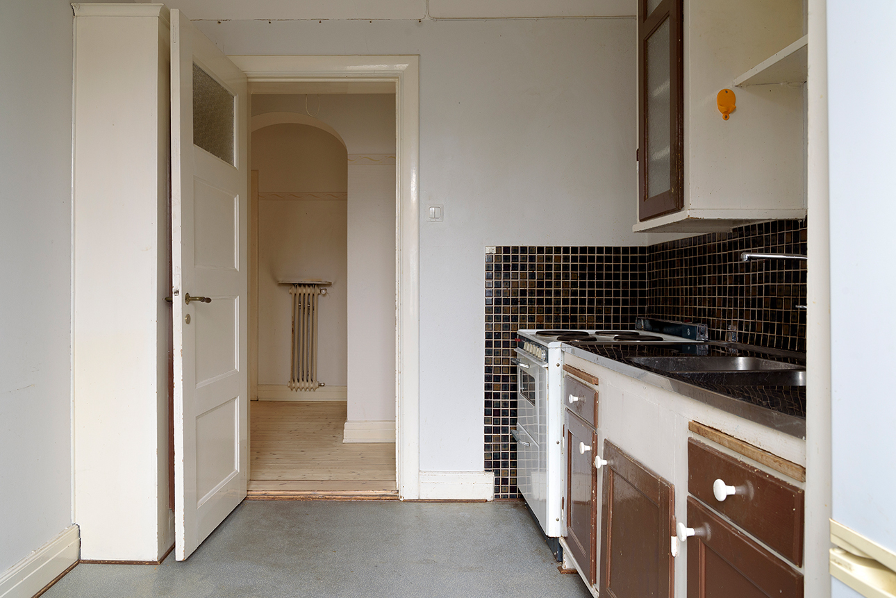 KÖK - Originalkök som med färg och kärlek blir trendigt eller sätt in nytt kök efter egen stil. Utsikt mot innergården. Plastmatta och ljusa väggar.
