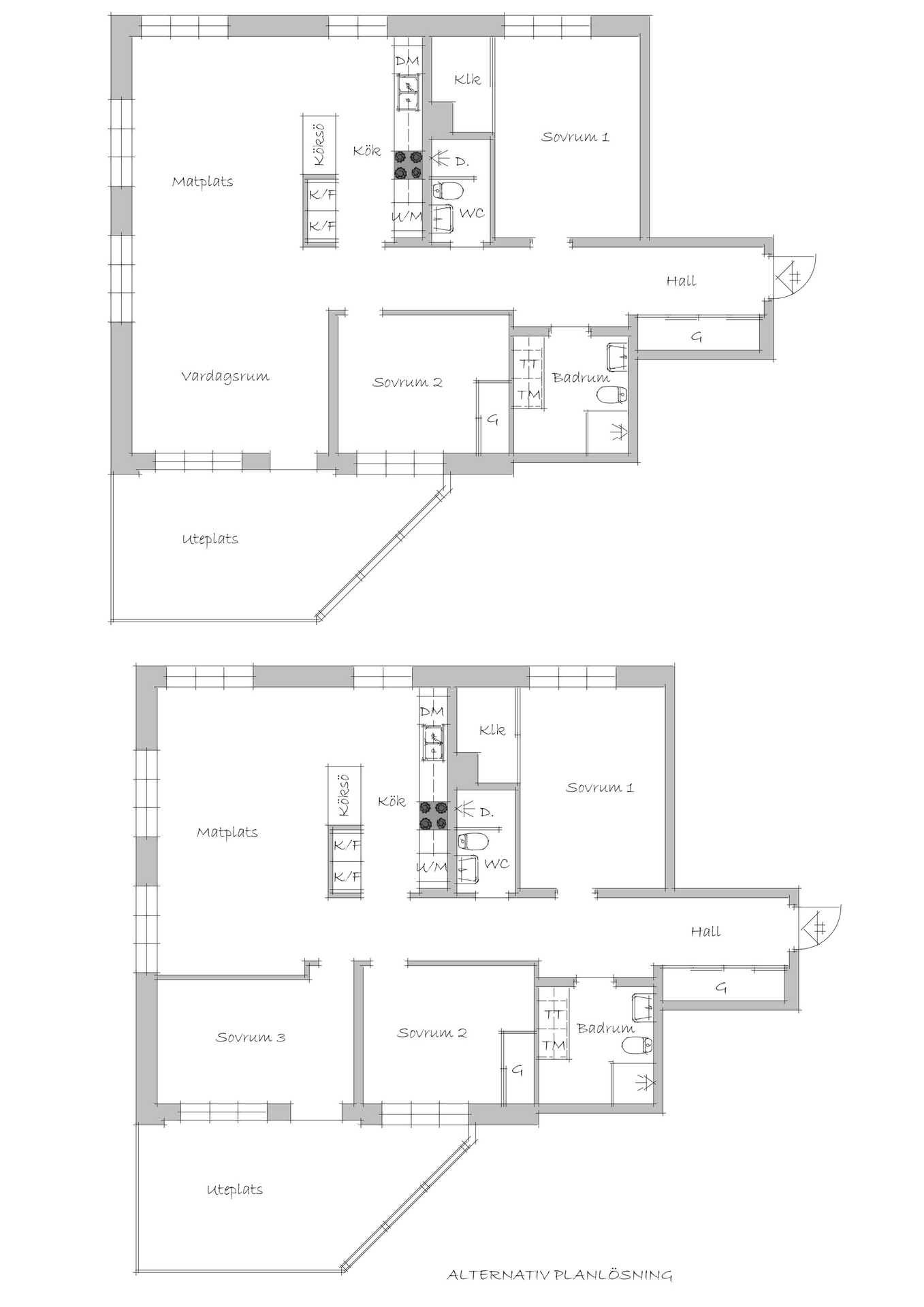 Planlösningen disponeras idag som 3 rok men kan enkelt återställas till 4 rok för den som önskar fler rum (se alternativ planlösning). Det trevliga ljusinsläppet från fönster i tre väderstreck skapar ett hem fyllt av rymd och harmoni.