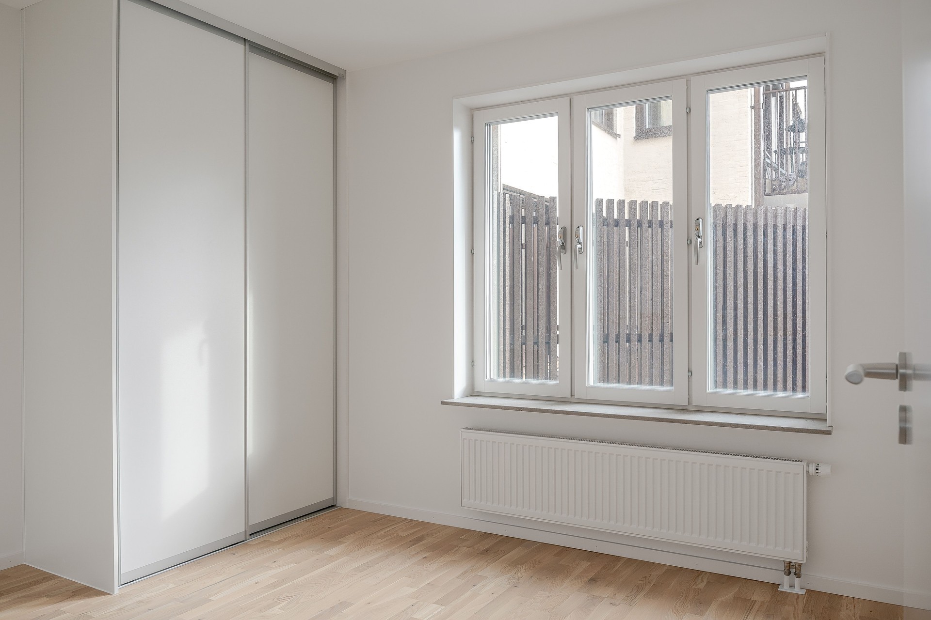 SOVRUM 2 - Passar bra som hemmakontor, barnrum eller gästrum. Förvaring i skjutdörrsgarderob. Parkettgolv och vita väggar.