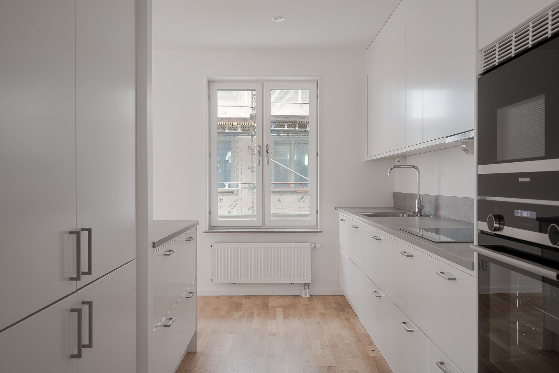 Köket från Vedum med vitvaror från Siemens. Dubbla helkaklade badrum med inredning från INR, utrustat med tvättmaskin och torktumlare. Förvaring i skjutdörrsgarderob med inredning från Elfa. Detaljer som vitlaserade ekgolv, integrerade vitvaror och genomgående hög standard ger bostaden en exklusiv känsla.