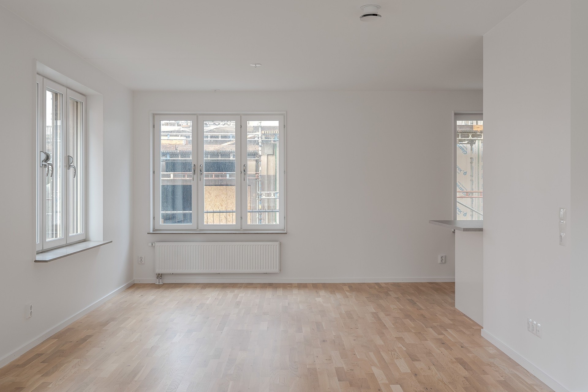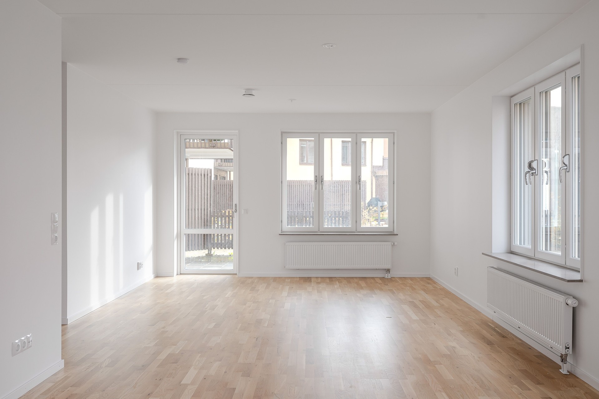 VARDAGSRUM - Generös yta med utgång till uteplats. Fönster i tre väderstreck tack vare lägenhetens läge på husets gavel. Parkettgolv och vita väggar.