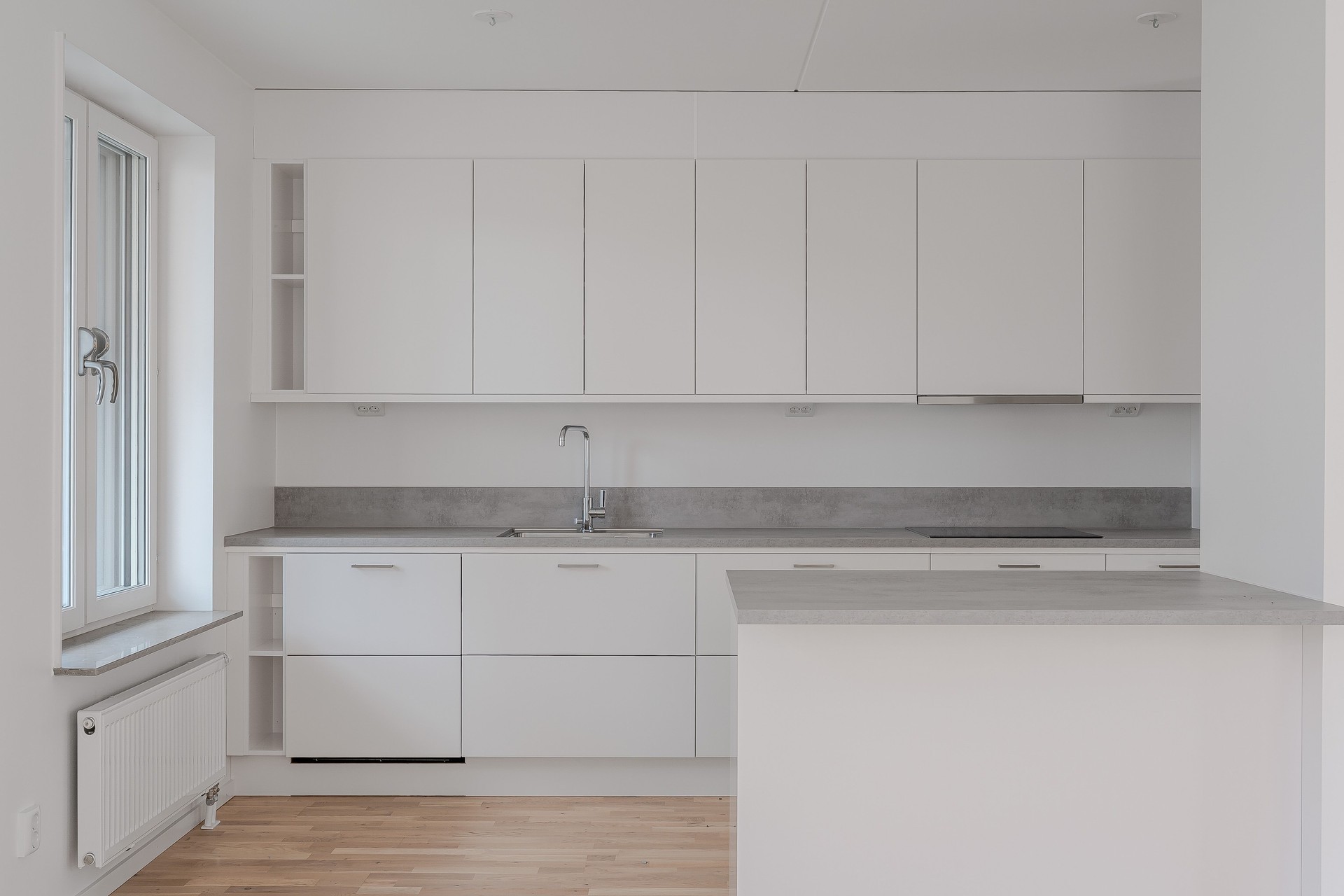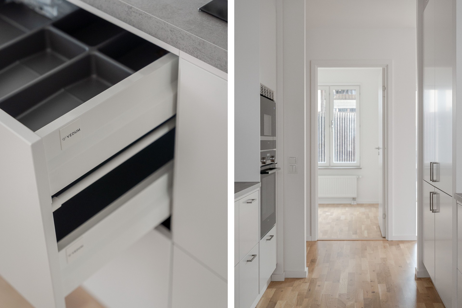 KÖK - Fullt utrustat kök från Vedum med vita luckor och grå bänkskiva. Här finns spishäll, köksfläkt, ugn, mikro, diskmaskin och dubbel kyl/frys. Smarta förvaringslösningar som underlättar i vardagen.