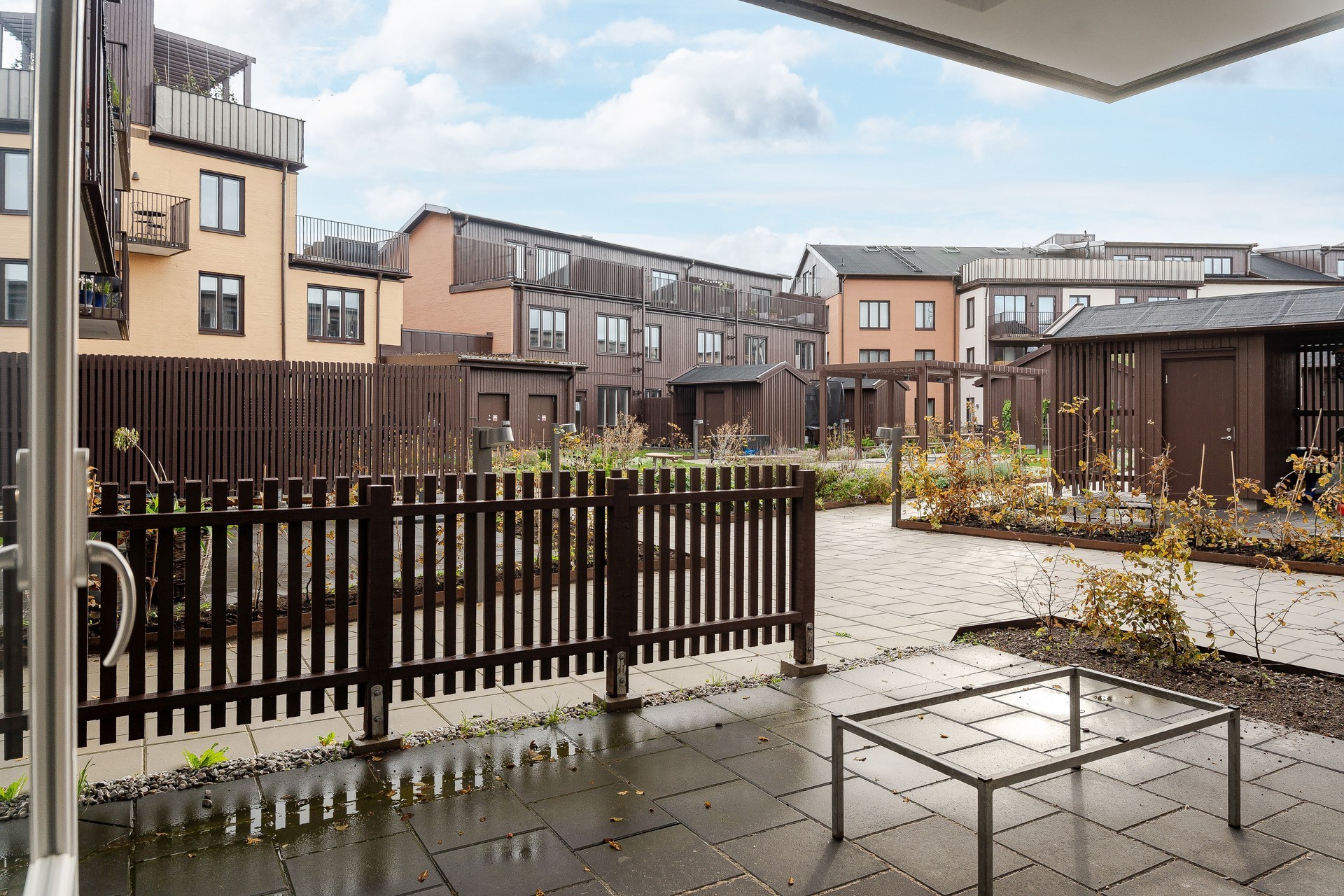 UTEPLATS - Bostadens uteplats vetter mot föreningens trevliga innergård. Här finns plats för möblemang och plantering i krukor.