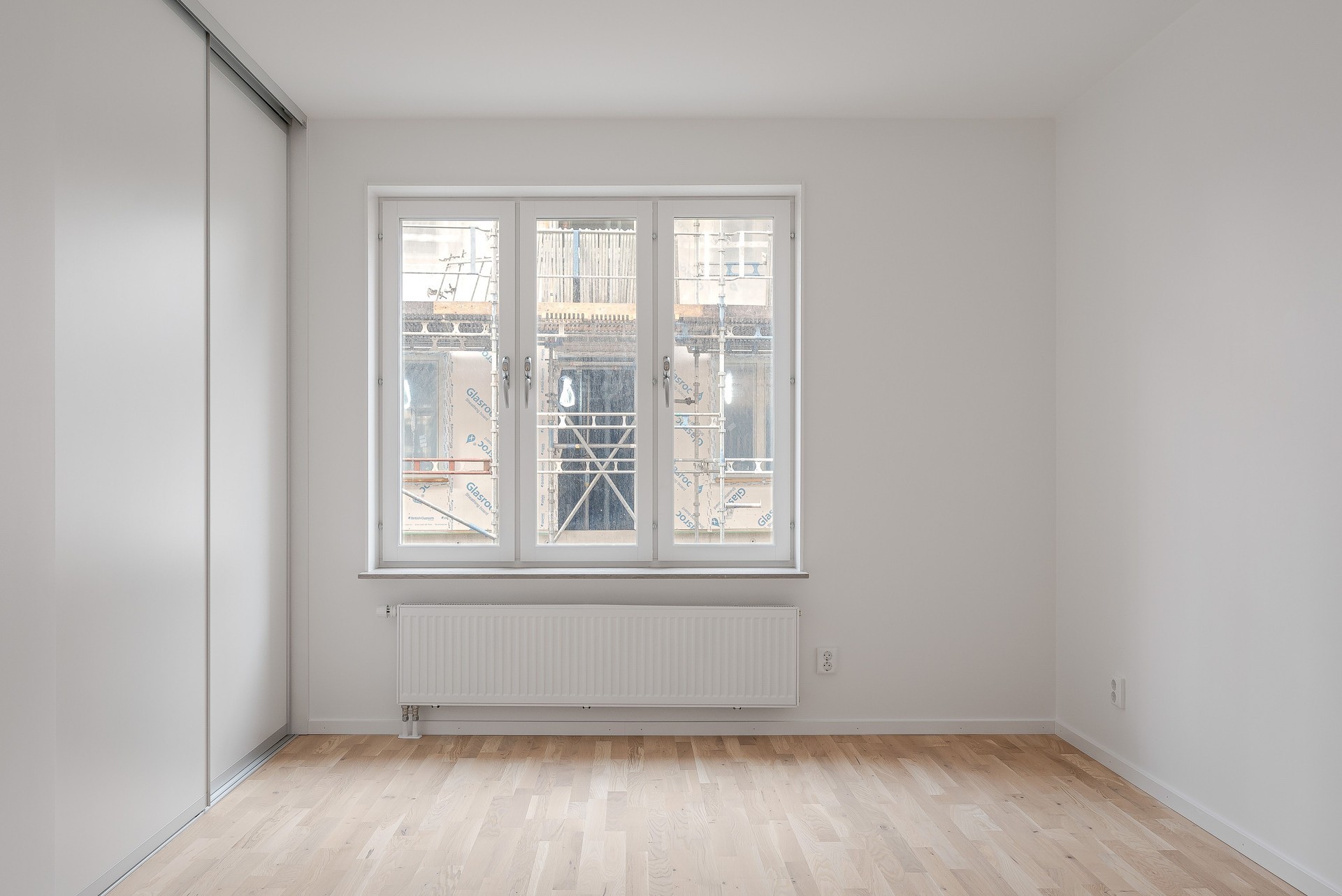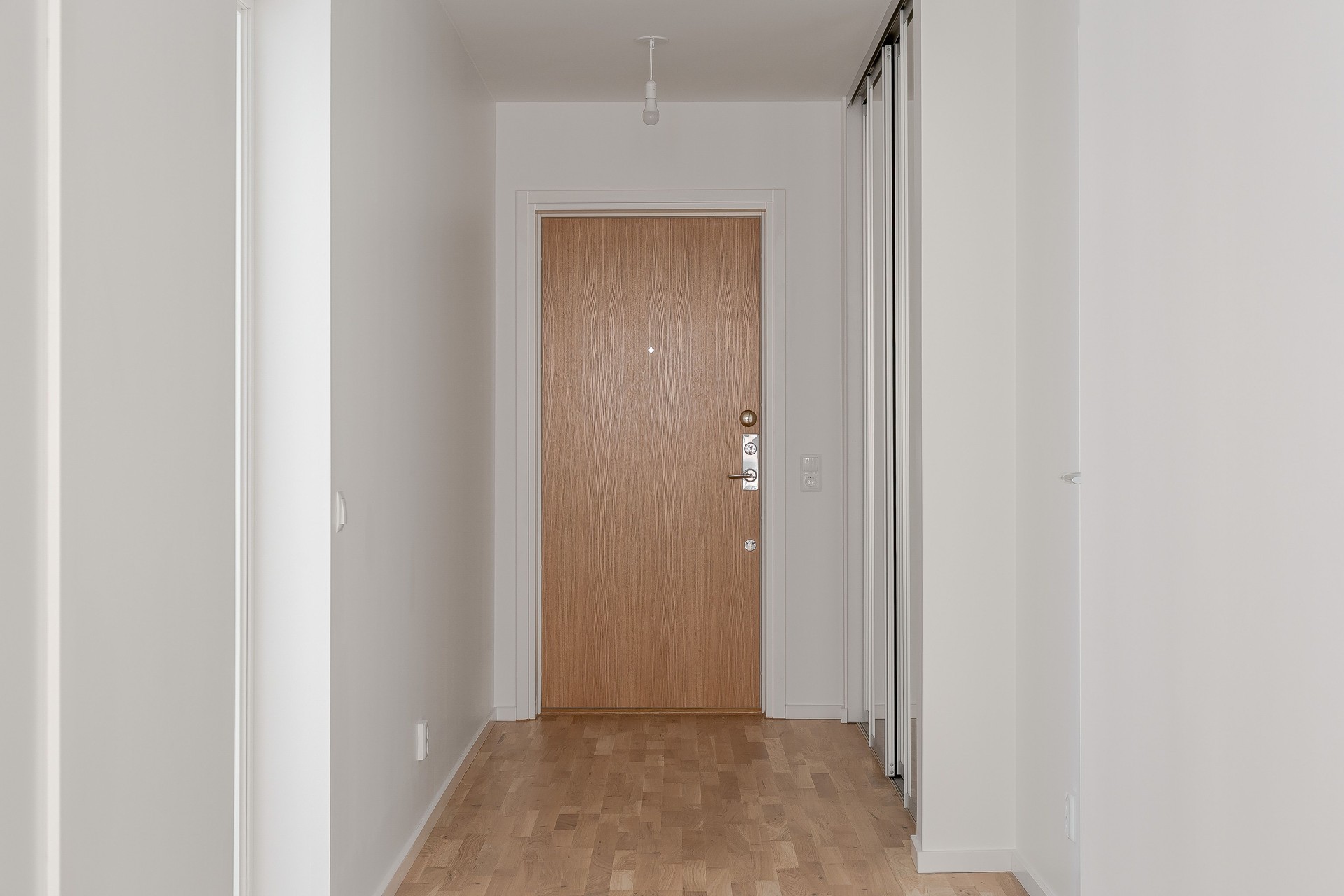 SOVRUM 1 - Generöst till ytan med bra förvaring i skjutdörrsgarderob som har extra djup. Parkettgolv och vita väggar.