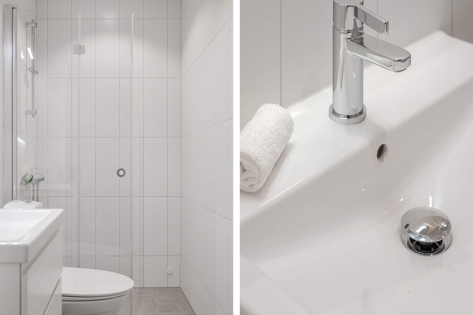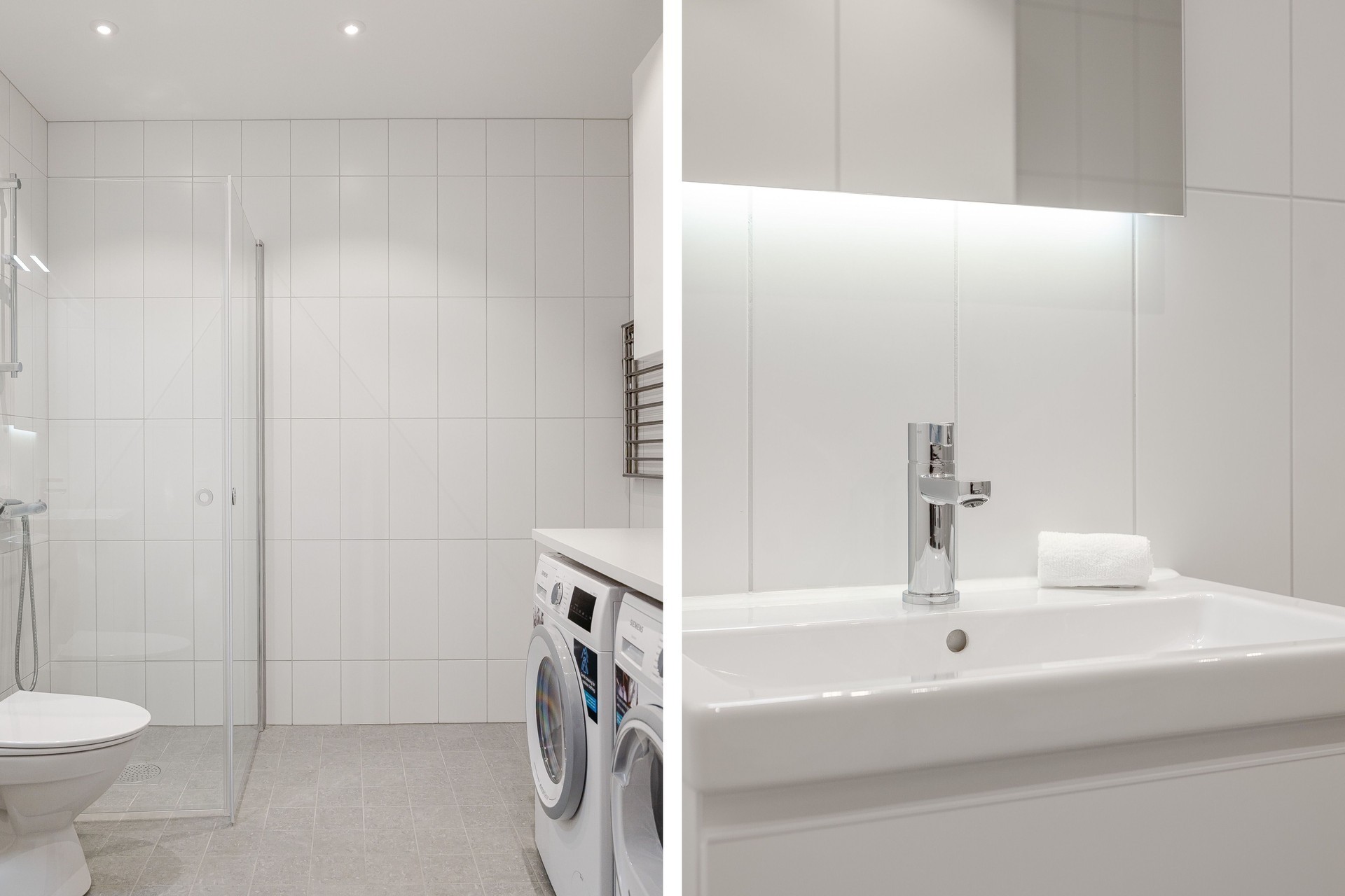 BADRUM - Helkaklat badrum som är utrustat med wc, dusch, handfat med kommod, förvaringsskåp, tvättmaskin och torktumlare. Grå klinker och vitt kakel.