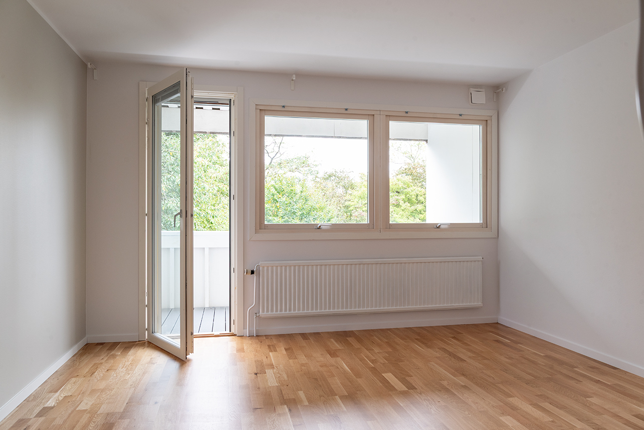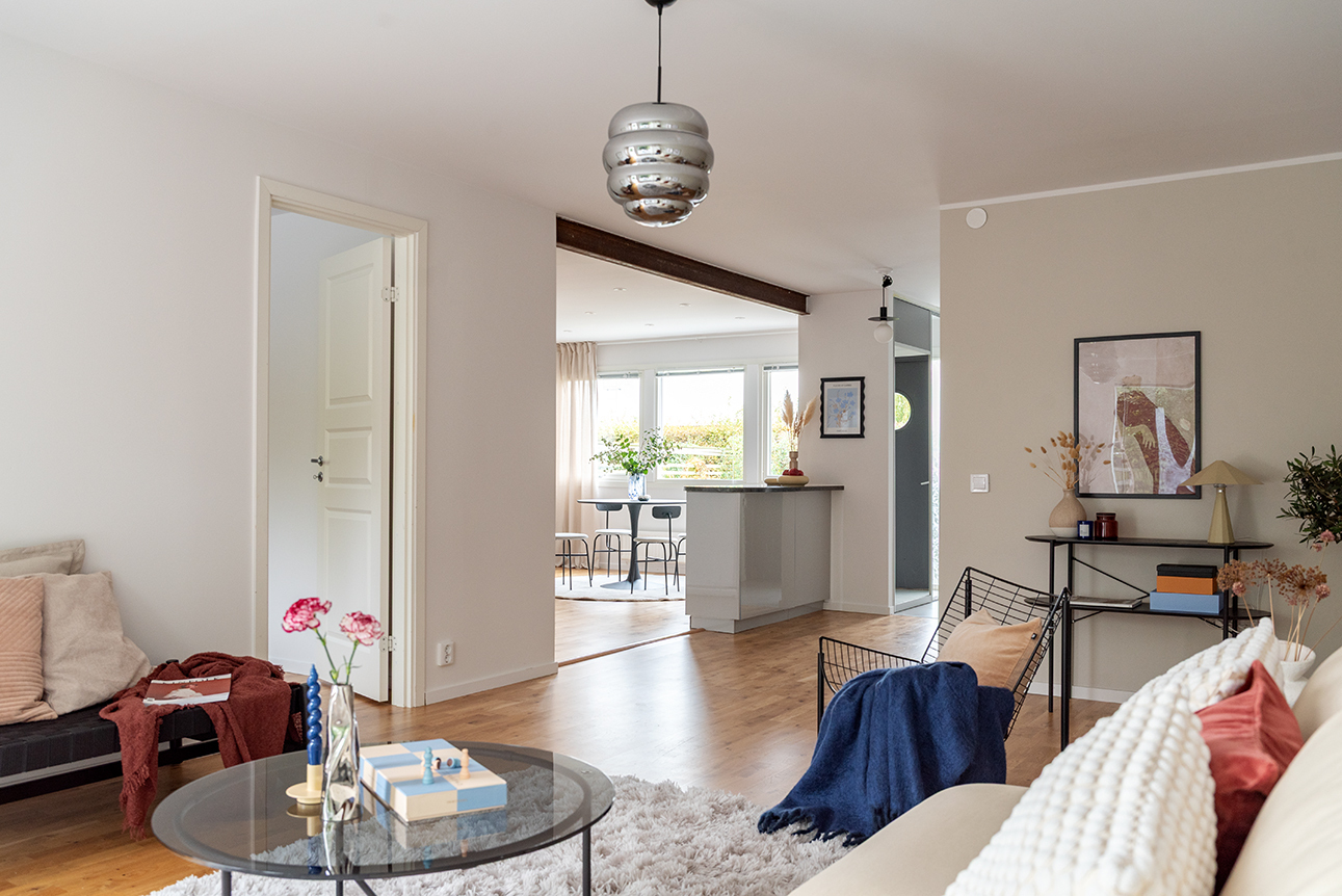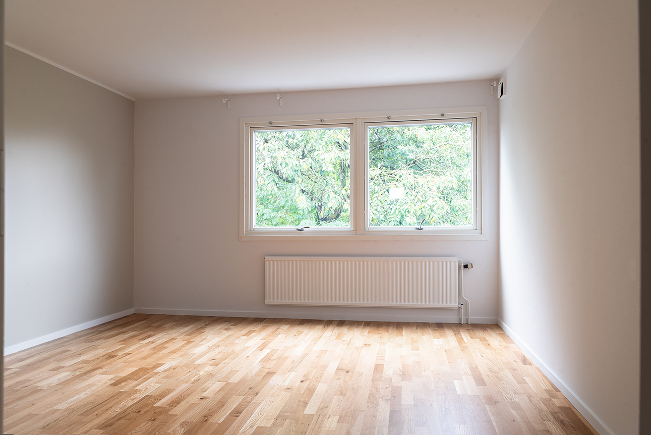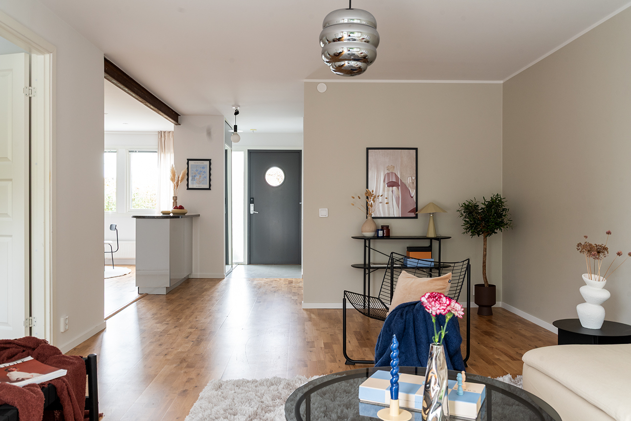 Vardagsrum - Generöst vardagsrum med utrymme för större soffgrupp. Här är även utgång till trädgården. Parkettgolv och grå+ vita väggar.