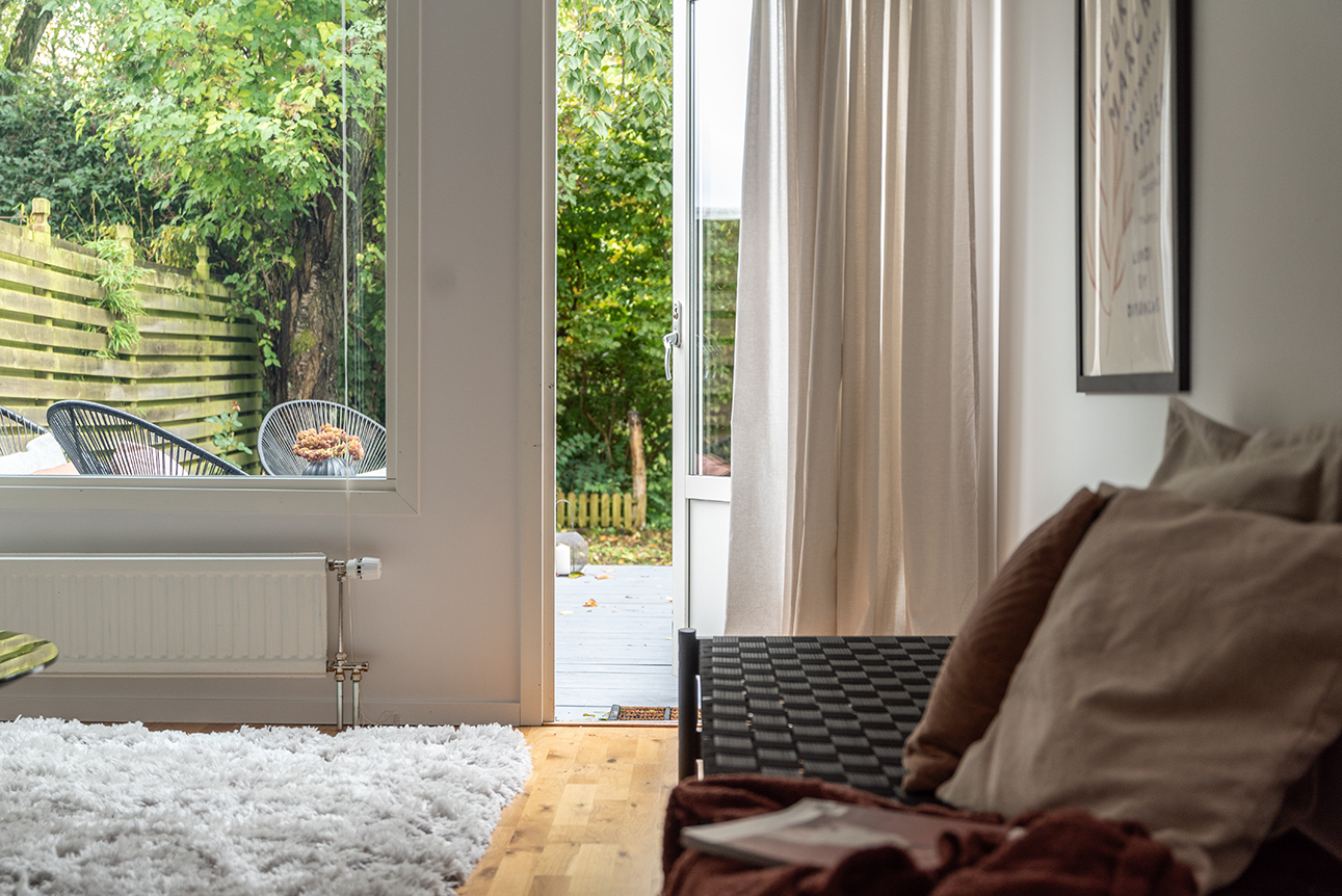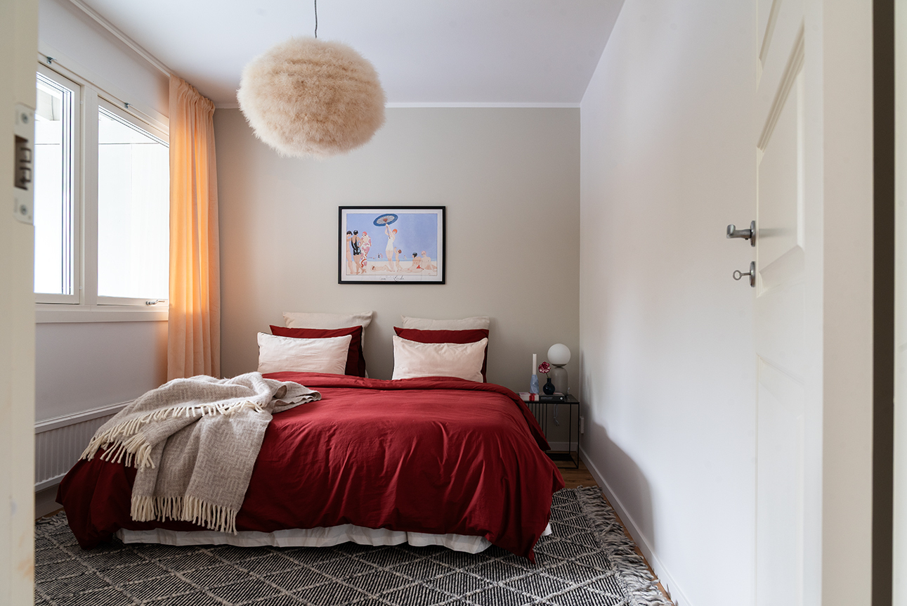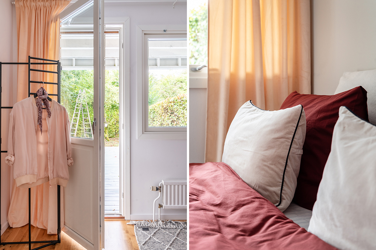 Sovrum - I vinkel till vardagsrummet finns ett sovrum som man skulle kunna öppna upp om man önskar ytterligare yta i vardagsrummet. Här är en separat utgång till trädgården. Parkettgolv och vita väggar med en grå fondvägg.