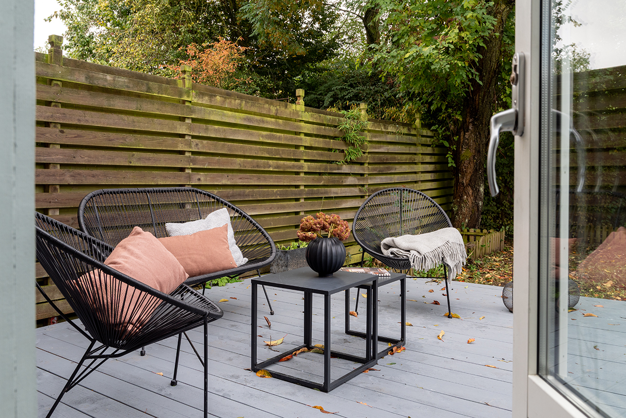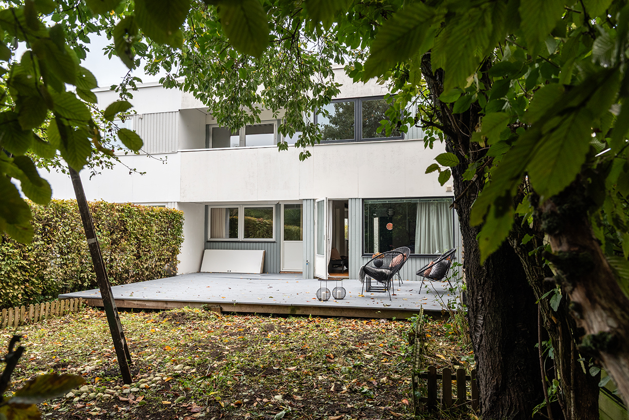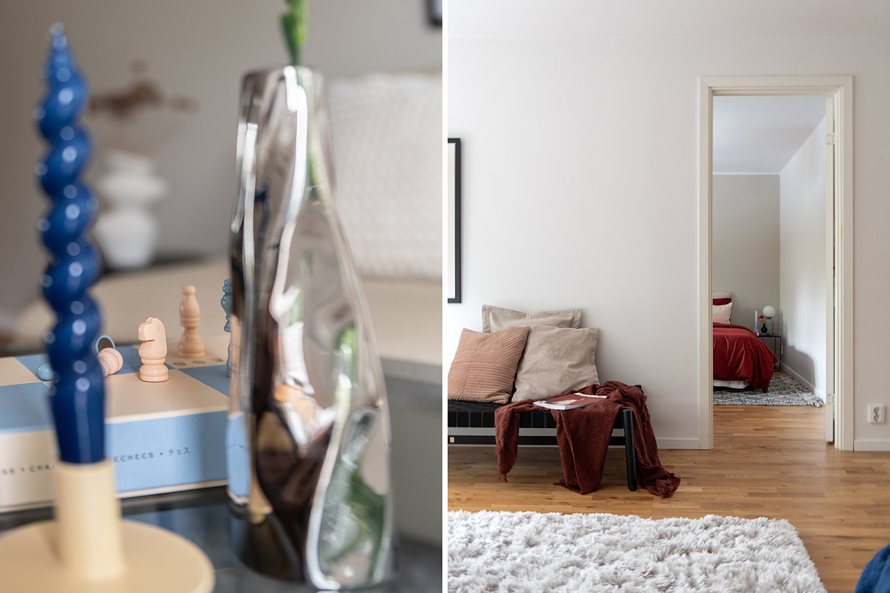 Sovrum - I vinkel till vardagsrummet finns ett sovrum som man skulle kunna öppna upp om man önskar ytterligare yta i vardagsrummet. Här är en separat utgång till trädgården. Parkettgolv och vita väggar med en grå fondvägg.