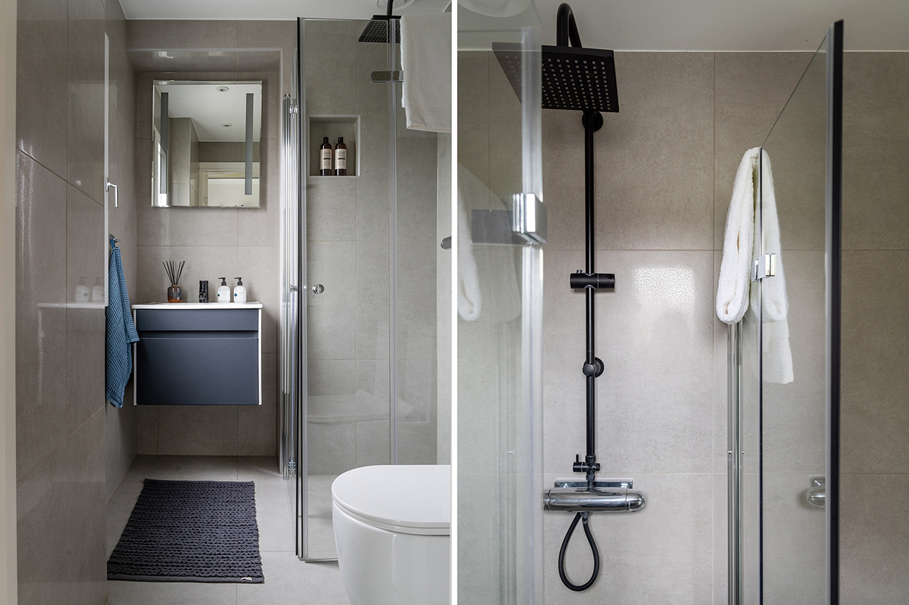 Badrum - Det helkaklade badrummet är utrustat med wc, dusch och handfat med kommod. Badrummet är renoverat 2025. Det är stilrent i utförandet med ljusgrå kakel och klinker.