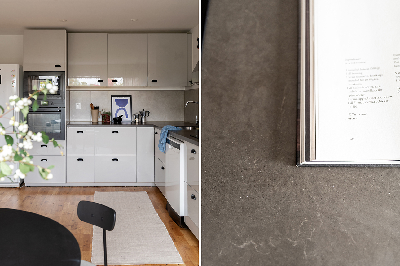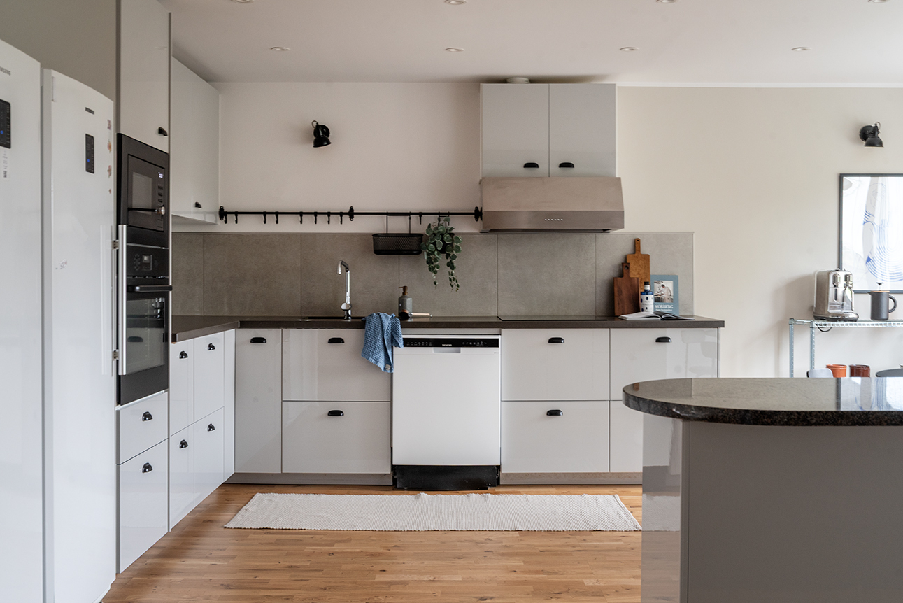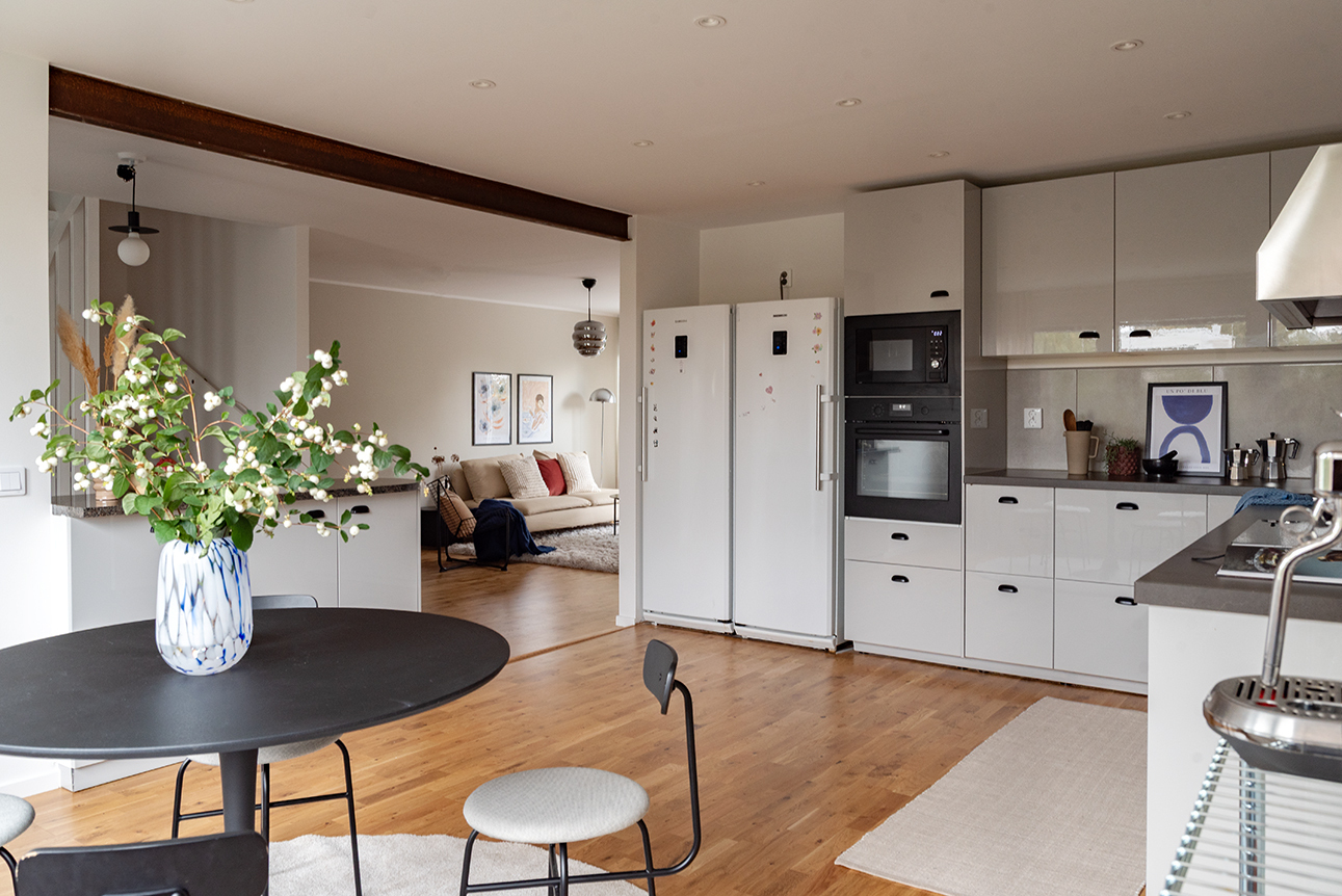 Kök - Rymligt kök som är öppet mot hall/vardagsrum. här finns utrymme för stor matgrupp. Köket är utrustat med spishäll, köksfläkt, diskmaskin, kyl, frys och integrerad ugn samt mikro. Luckor i ljusgrå ton, mörk bänkskiva och grå kakel ovan diskbänken. Detta matchas upp snyggt med parkettgolv och vita väggar.