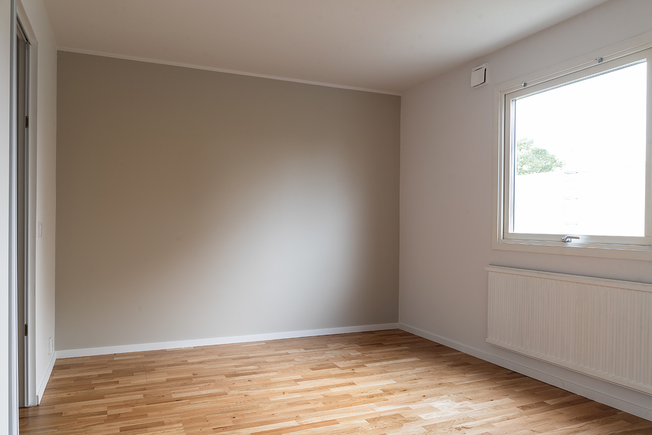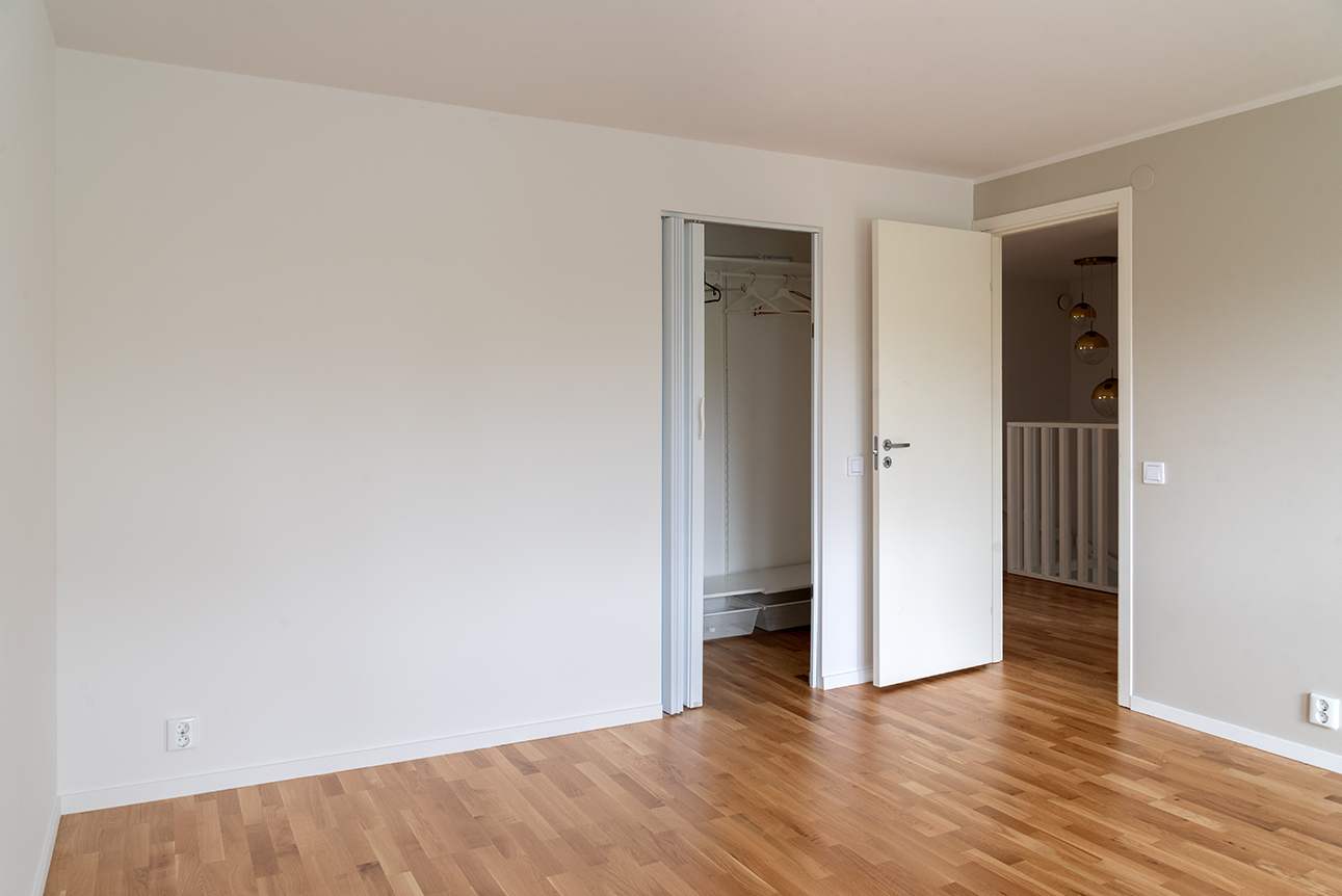 Sovrum 3 - Bra till storleken med utrymme för dubbelsäng och här finns tillgång till klädkammare. Parkettgolv och vita väggar med en grå fondvägg.