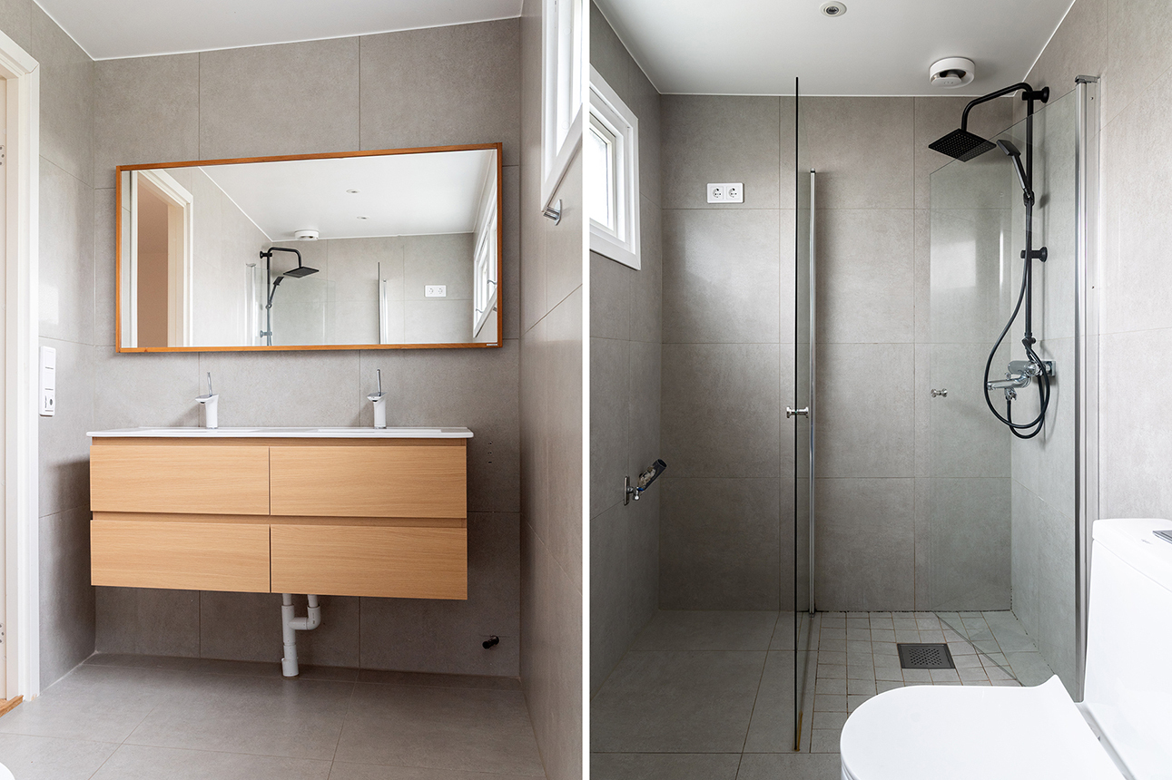 Badrum - Det helkaklade badrummet är utrustat med wc, dusch och dubbelt handfat med kommod. Badrummet är uppfräschat 2025. Det är stilrent i utförandet med grå kakel och klinker.
