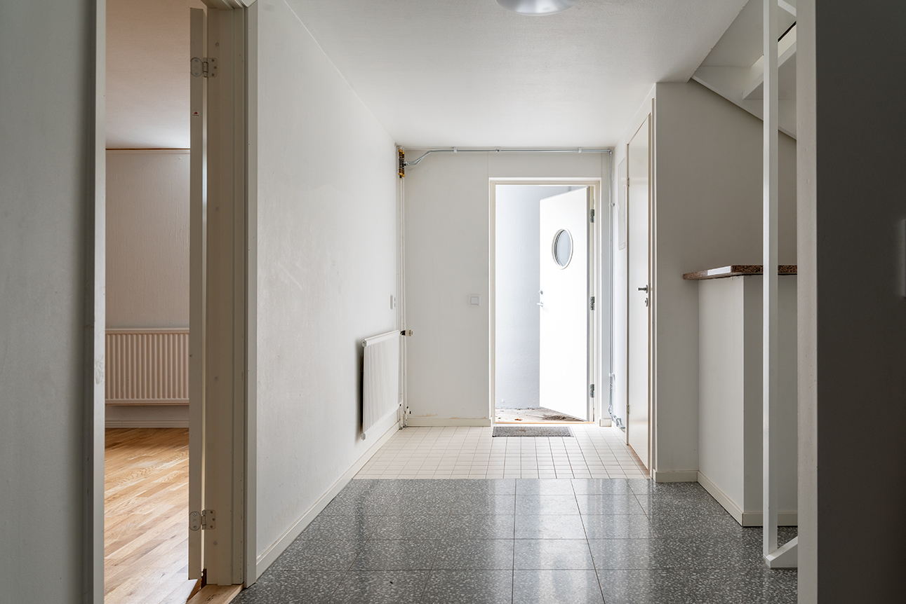 Hall - Plats för avhängning och skohylla i skjutdörrsgarderob direkt till höger i hallen. I hallen ligger klinkergolv och väggarna är vitmålade.