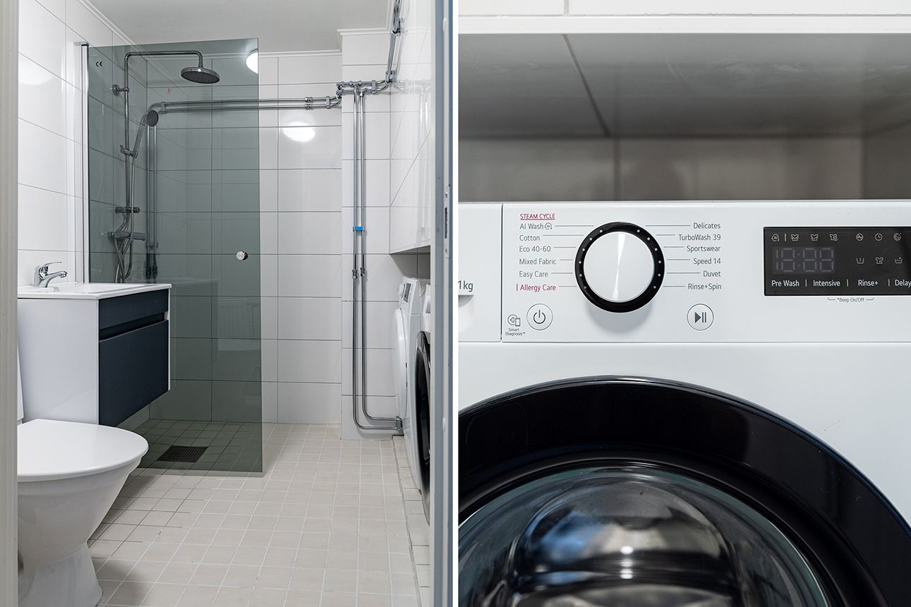 Badrum - Helkaklat badrum med wc, dusch, handfat med kommod, tvättmaskin och torktumlare. Badrummet är renoverat 2025. Det är stilrent i utförandet med ljust klinkergolv och vitt kakel.