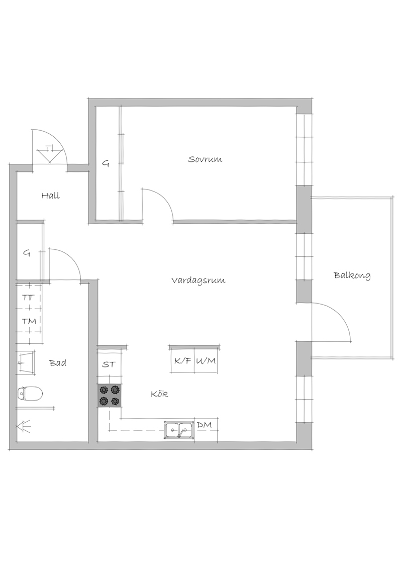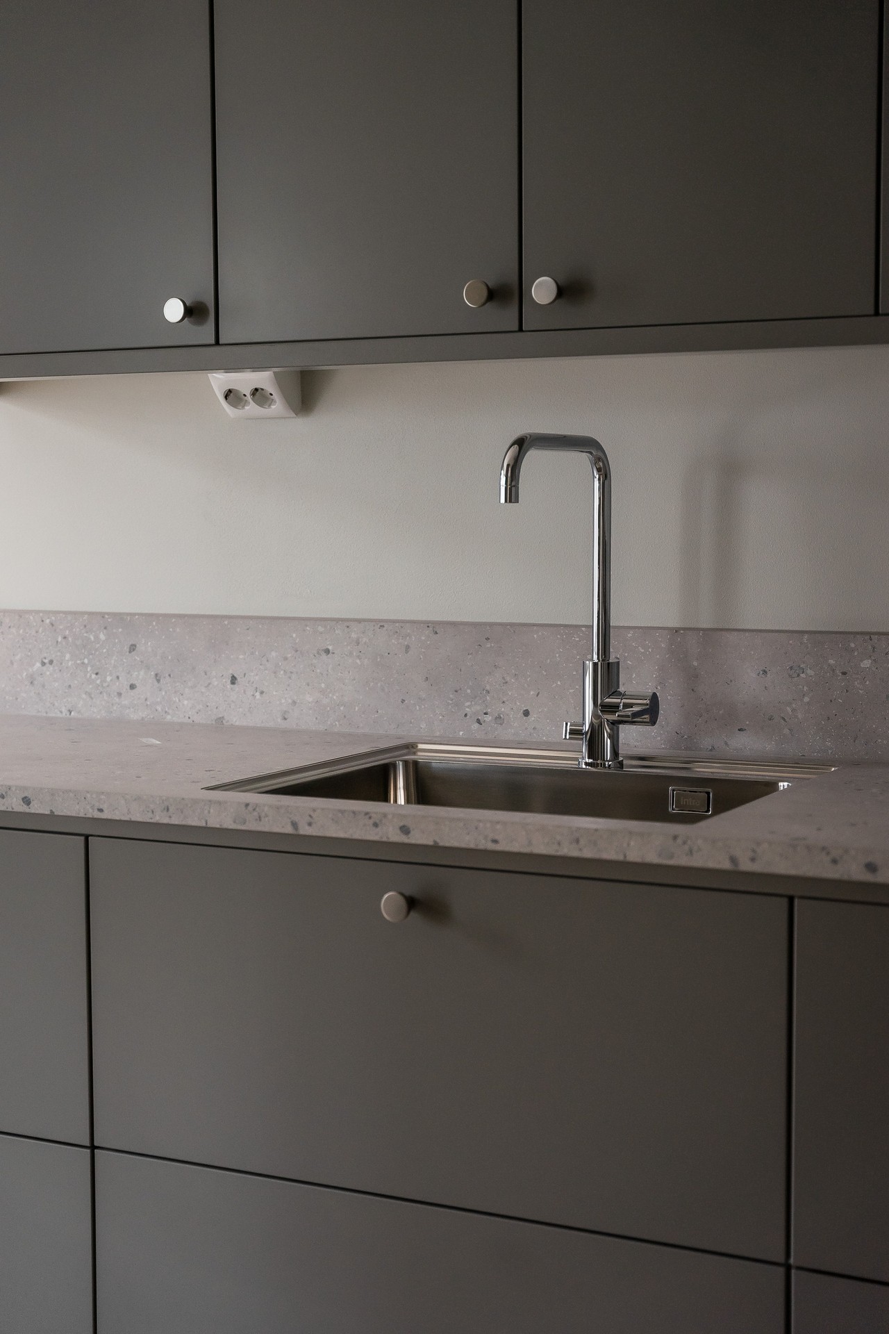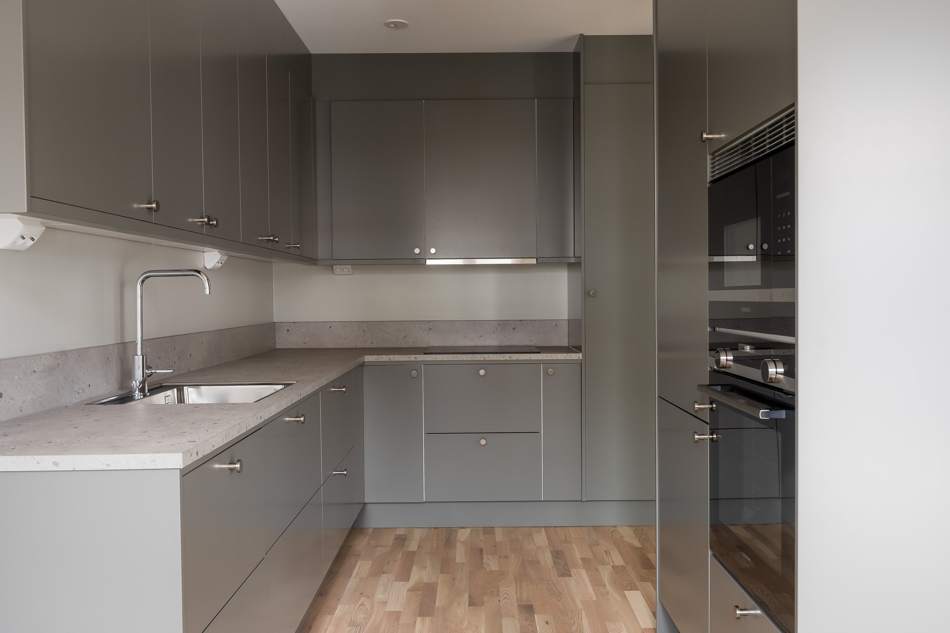 KÖK - Kök i vinkel från Vedum. Ett modernt och välutrustat kök med köksluckor i kulören "Maja betonggrå". Kulören matchar fint till de målade väggarna i en grå-beige ton. Köket är utrustat med integrerad diskmaskin, integrerad kyl/frys, induktionshäll, spisfläkt, ugn samt mikrovågsugn.