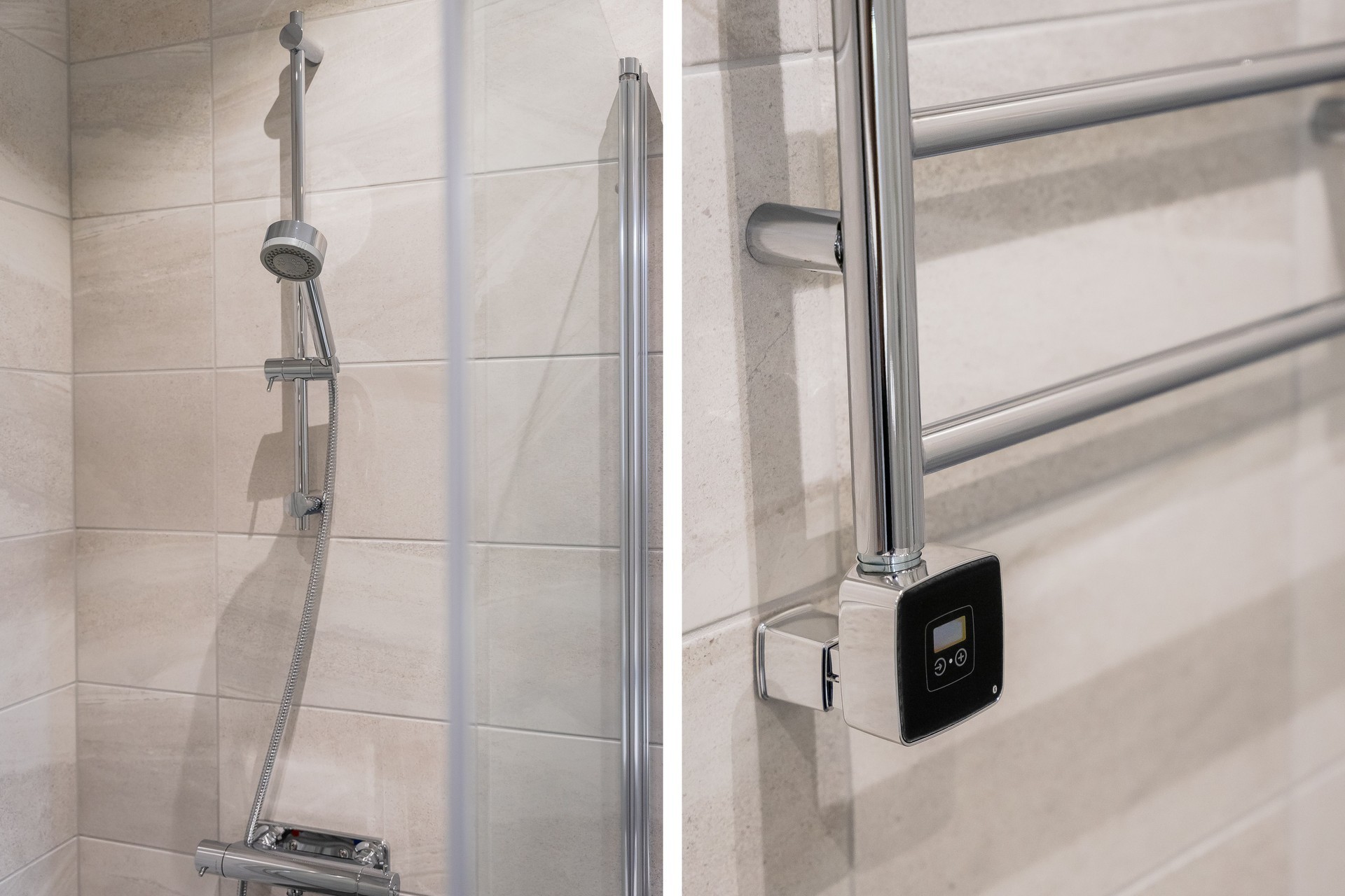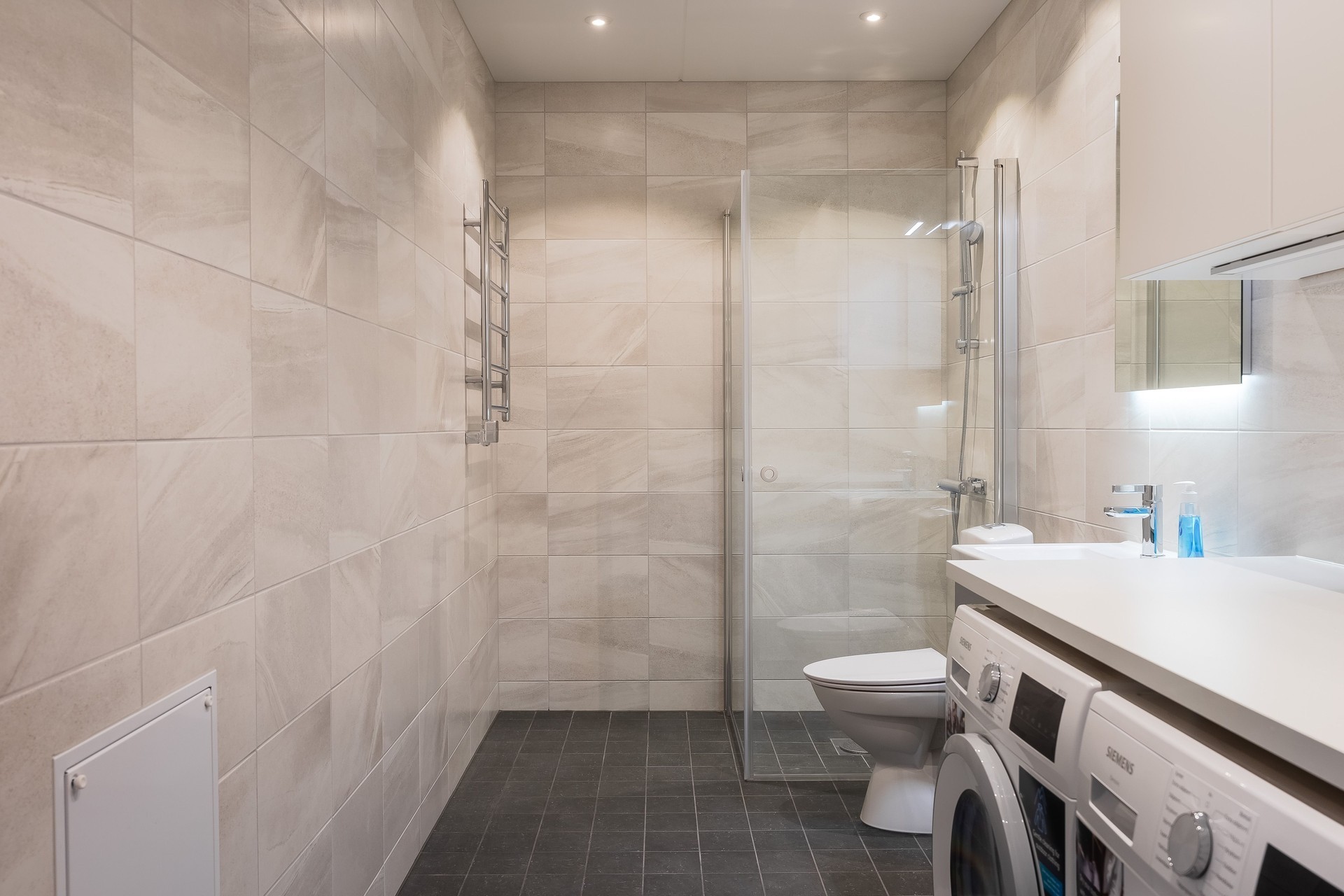 BADRUM - Modernt och helkaklat badrum med kakel i en varmgrå ton och klinker i mörkgrå. Badrummet är utrustat med dusch med glasdörrar, wc, handfat med kommod, spegel med belysning samt tvättmaskin och torktumlare.