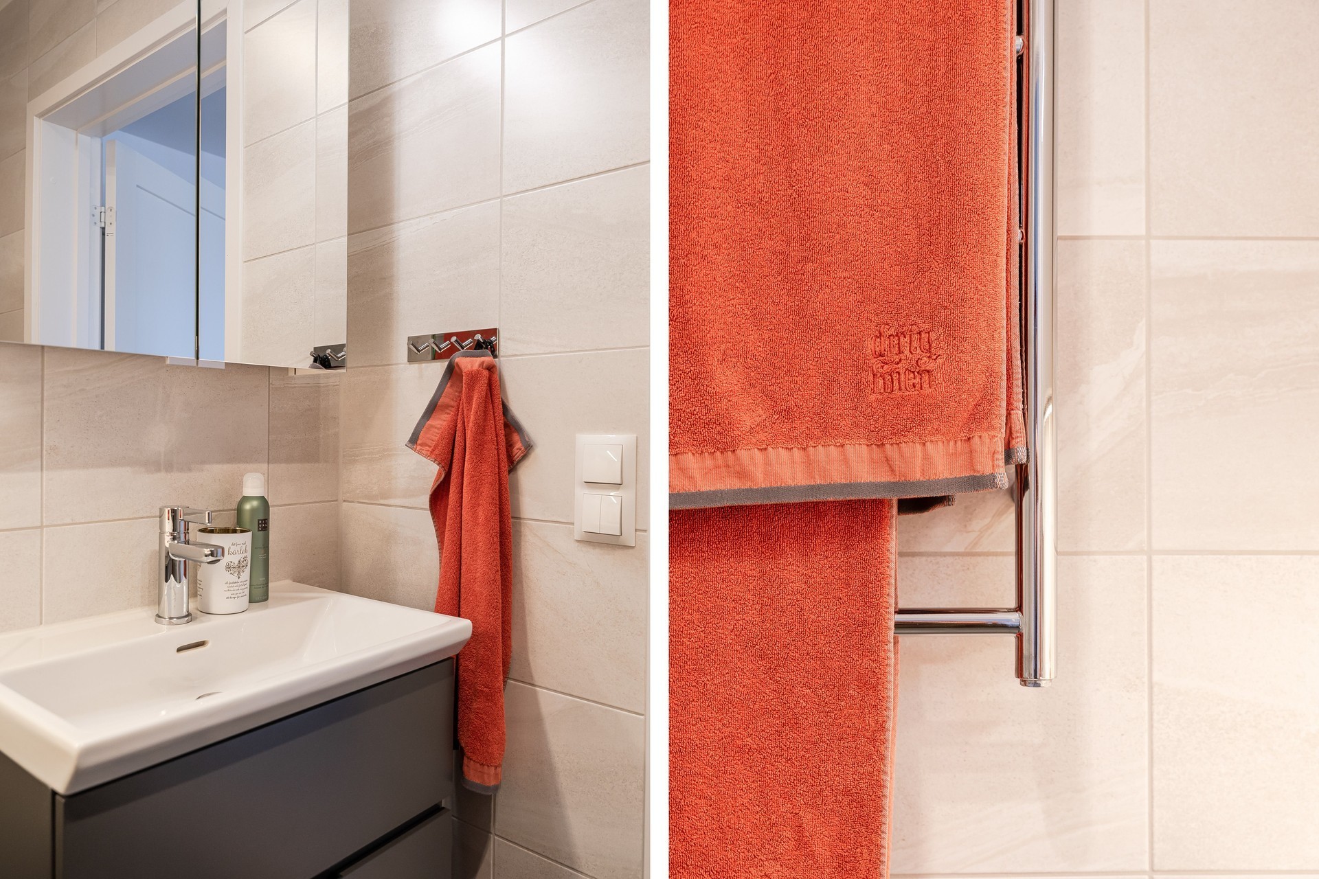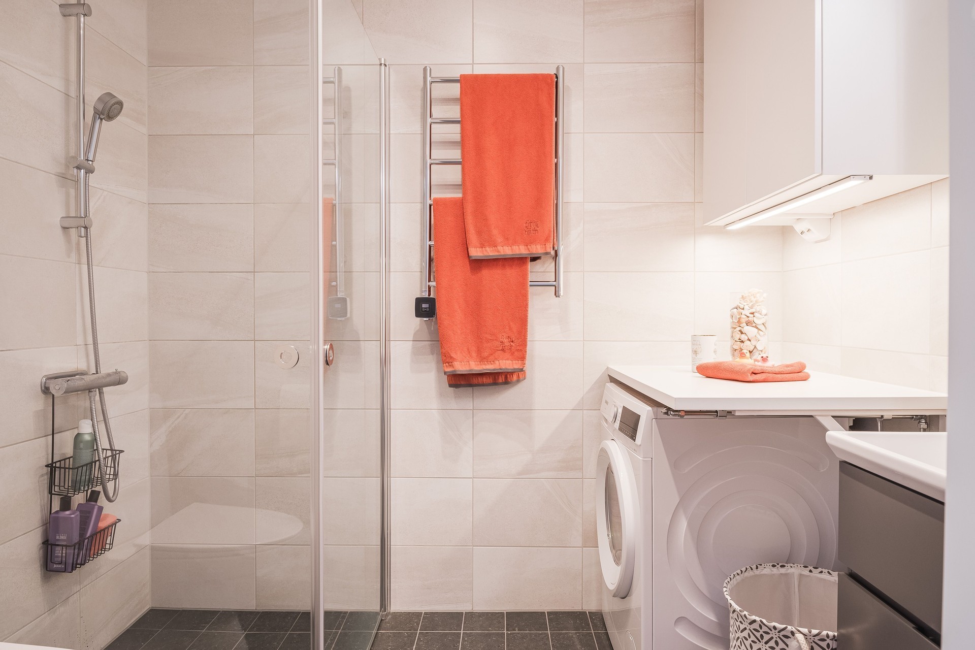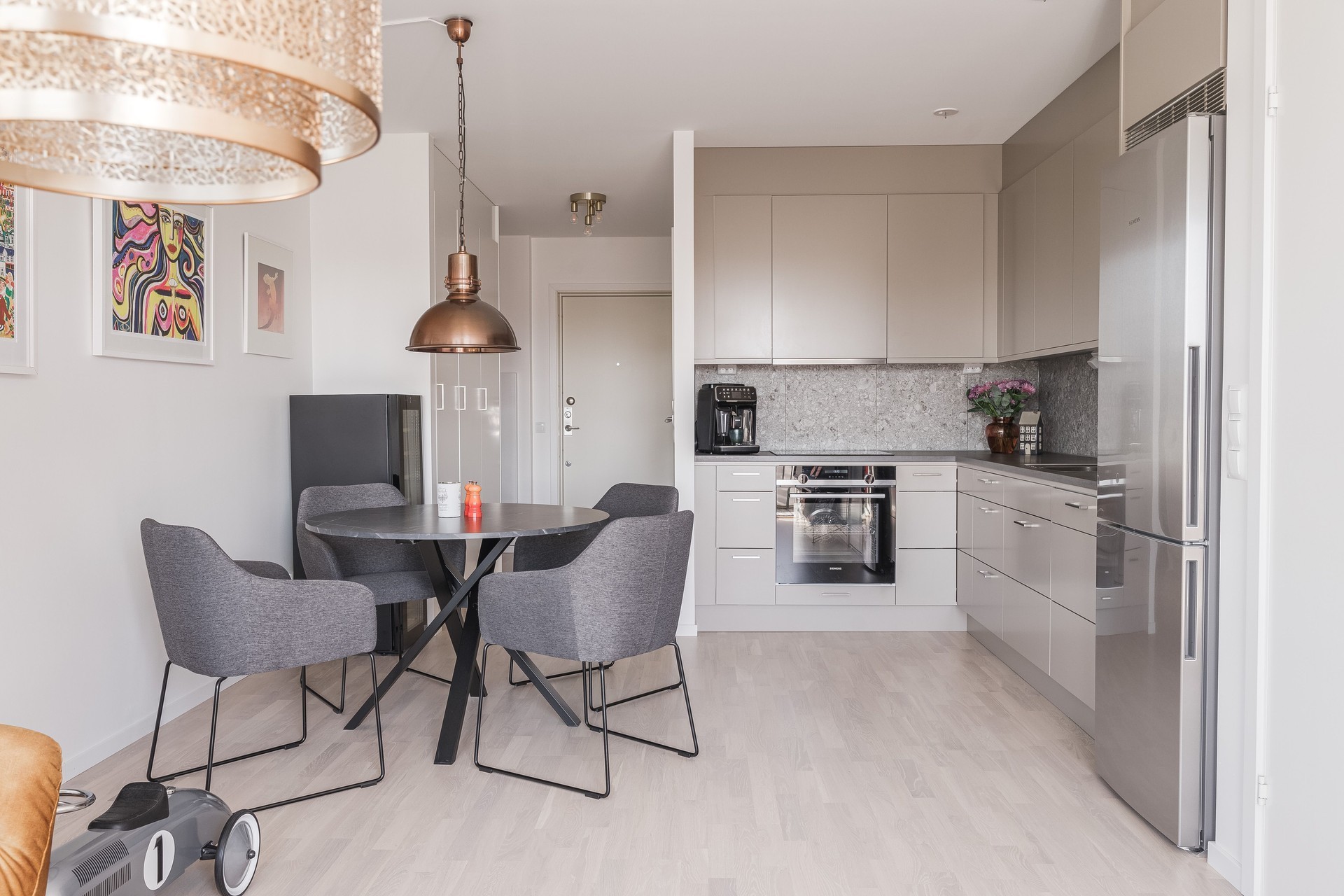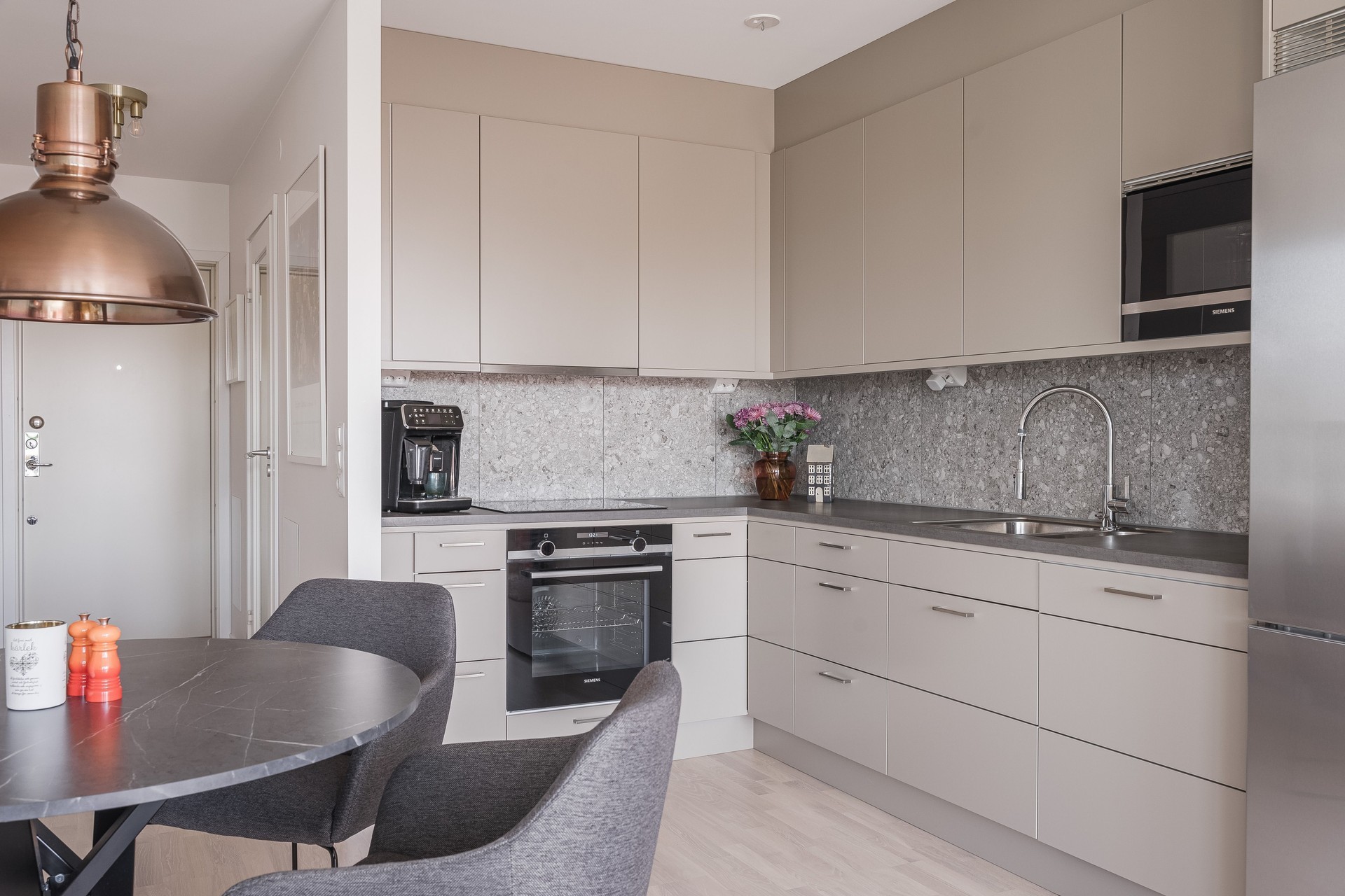 KÖK - Lägenhetens kök har stilfull inredning från Vedum i sandfärgad ton med kakel ovan den gråa bänkskivan. Vinkelkök med bra arbetsytor samt förvaring i både bänk- och väggskåp. Köket är utrustat med kyl/frys, integrerad diskmaskin, induktionshäll, ugn, mikrovågsugn samt köksfläkt.