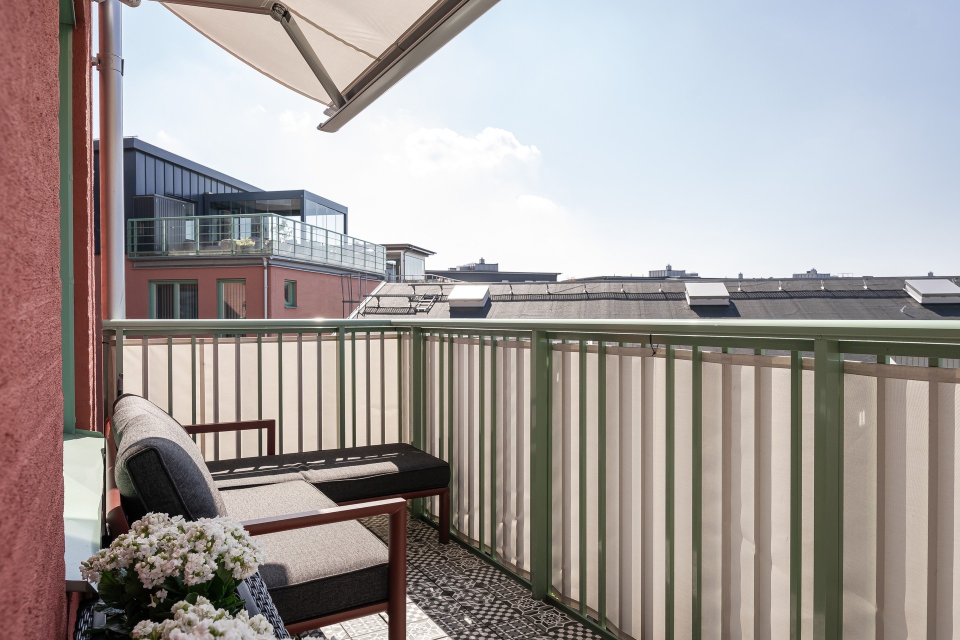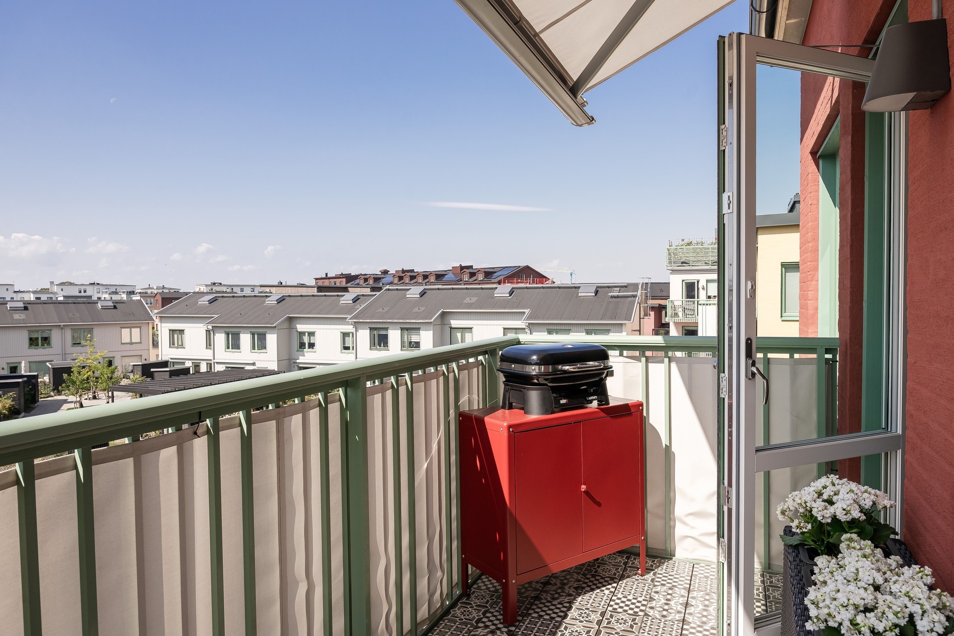 BALKONG - Lägenhetens balkong har trevligt västerläge mot gården. Här kan man njuta av solen stora delar av dagen. Balkongen har praktisk markis samt plats för mindre soffa och bord.
