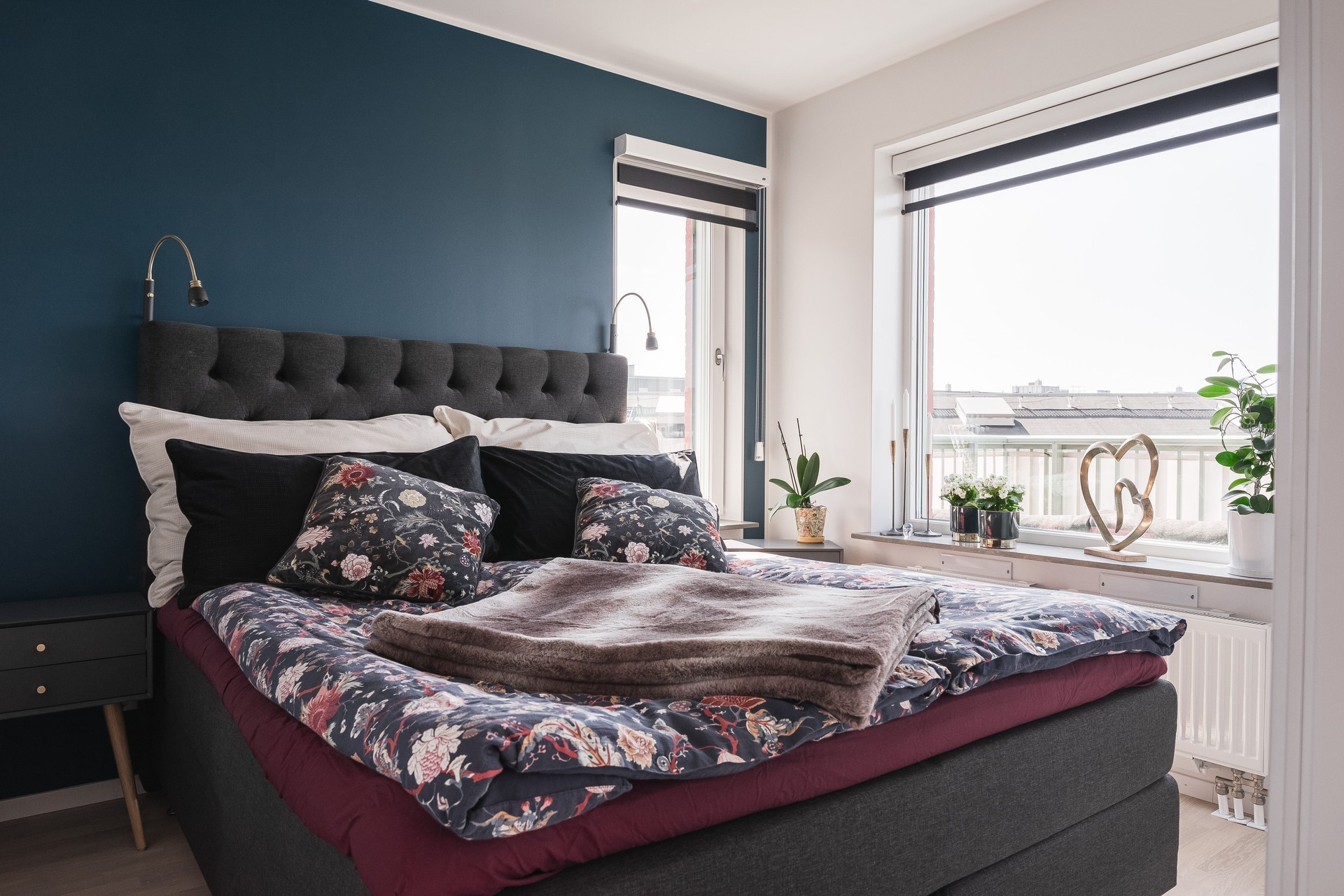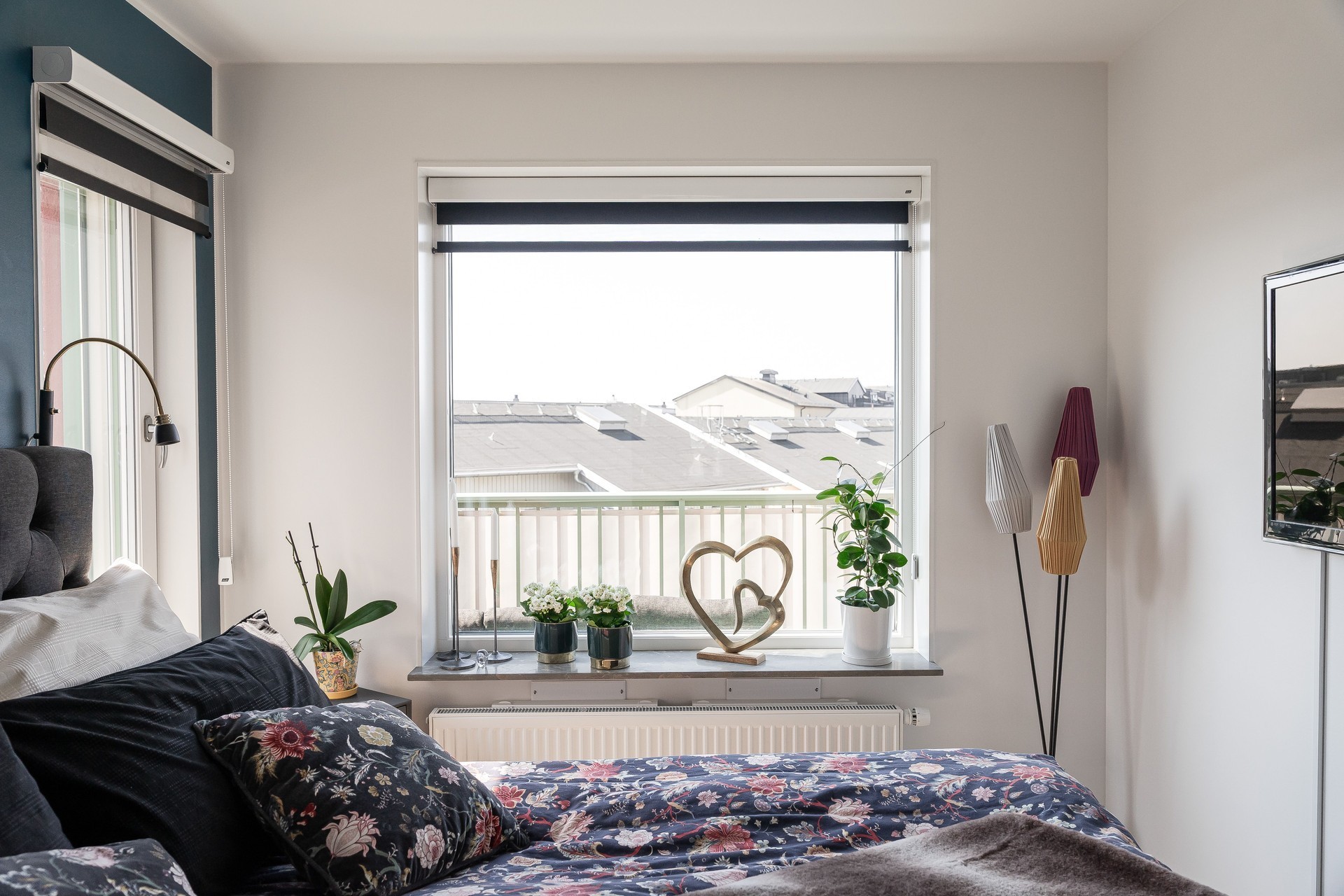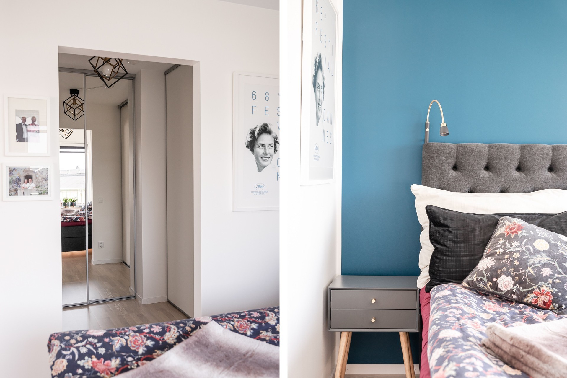 SOVRUM - Sovrum med fönster i två väderstreck. Ljust parkettgolv, vita väggar samt en fondvägg i en blå nyans. I anslutning till sovrummet har man en stor klädkammare med två skjutdörrsgarderob, varav den ena med spegeldörrar, vilket ger mycket bra förvaringsmöjligheter.