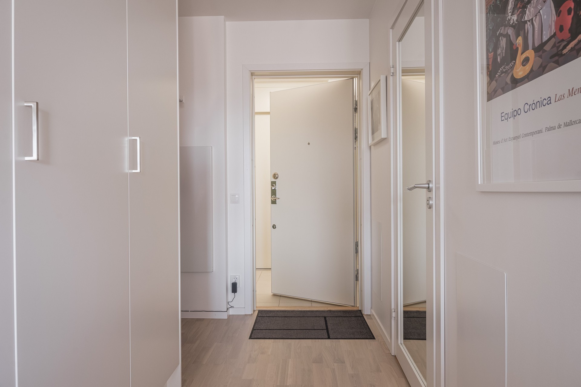 HALL - Hall med ljust parkettgolv och vita väggar. Här har man garderober med bra förvaringsmöjligheter.