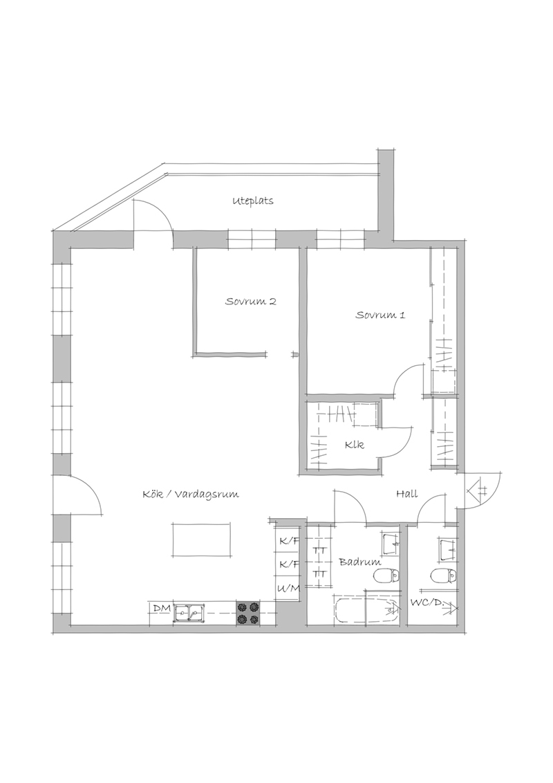 KÖK - Modernt kök från Vedum med stilren köksinredning i vitt samt bänkskiva och stänkskydd i grå ton. Väggskåpen har smart klick-öppning. Bra förvaringsmöjligheter i både bänk- och väggskåp samt i köksön. Fullt utrustat kök med ugn och mikrovågsugn i praktisk arbetshöjd, induktionshäll, köksfläkt, integrerad diskmaskin samt integrerad dubbel kyl/frys. Utrymme för matgrupp. Vitpigmenterad ekparkett och vitmålade väggar. Härifrån når man bostadens uteplats.