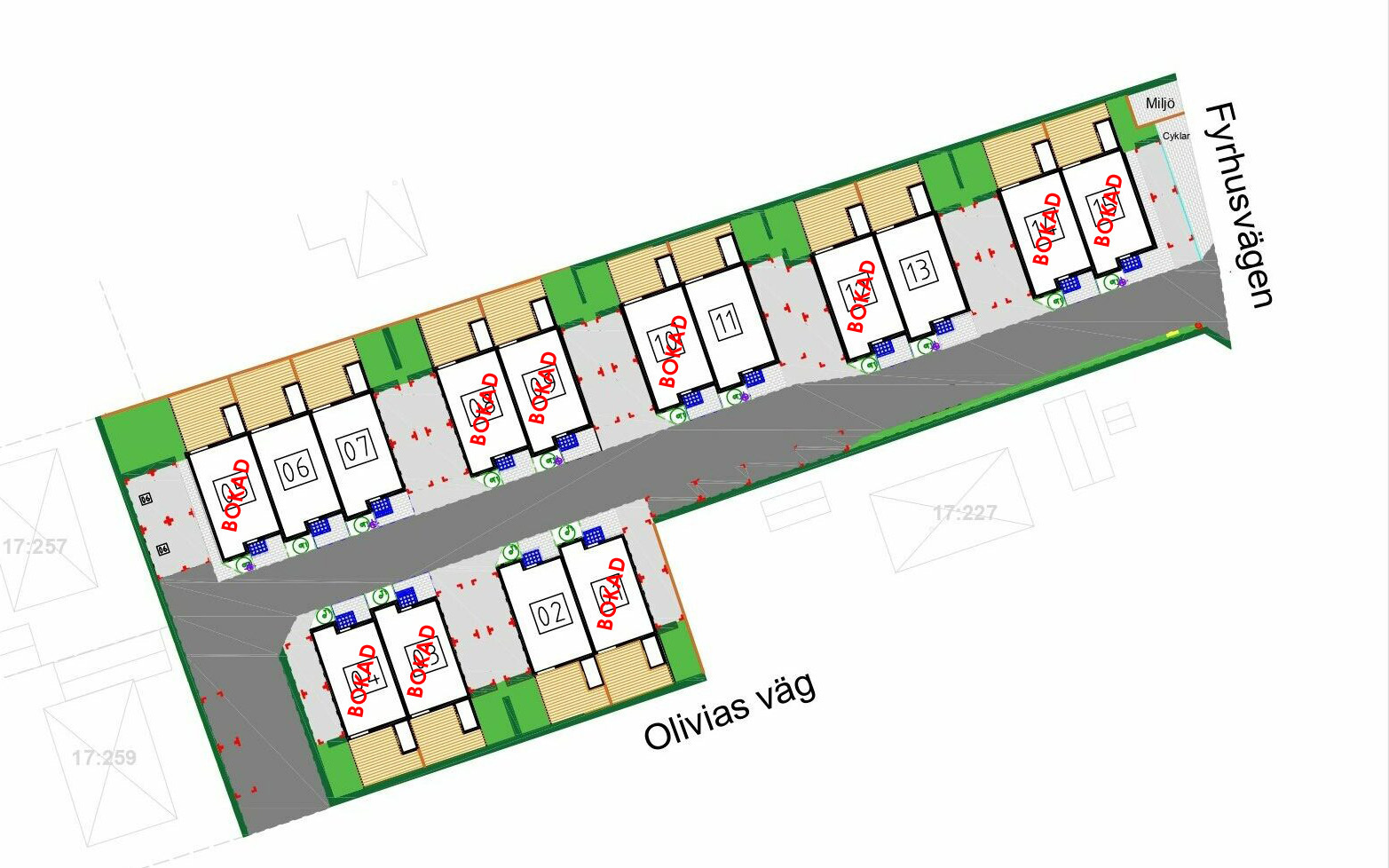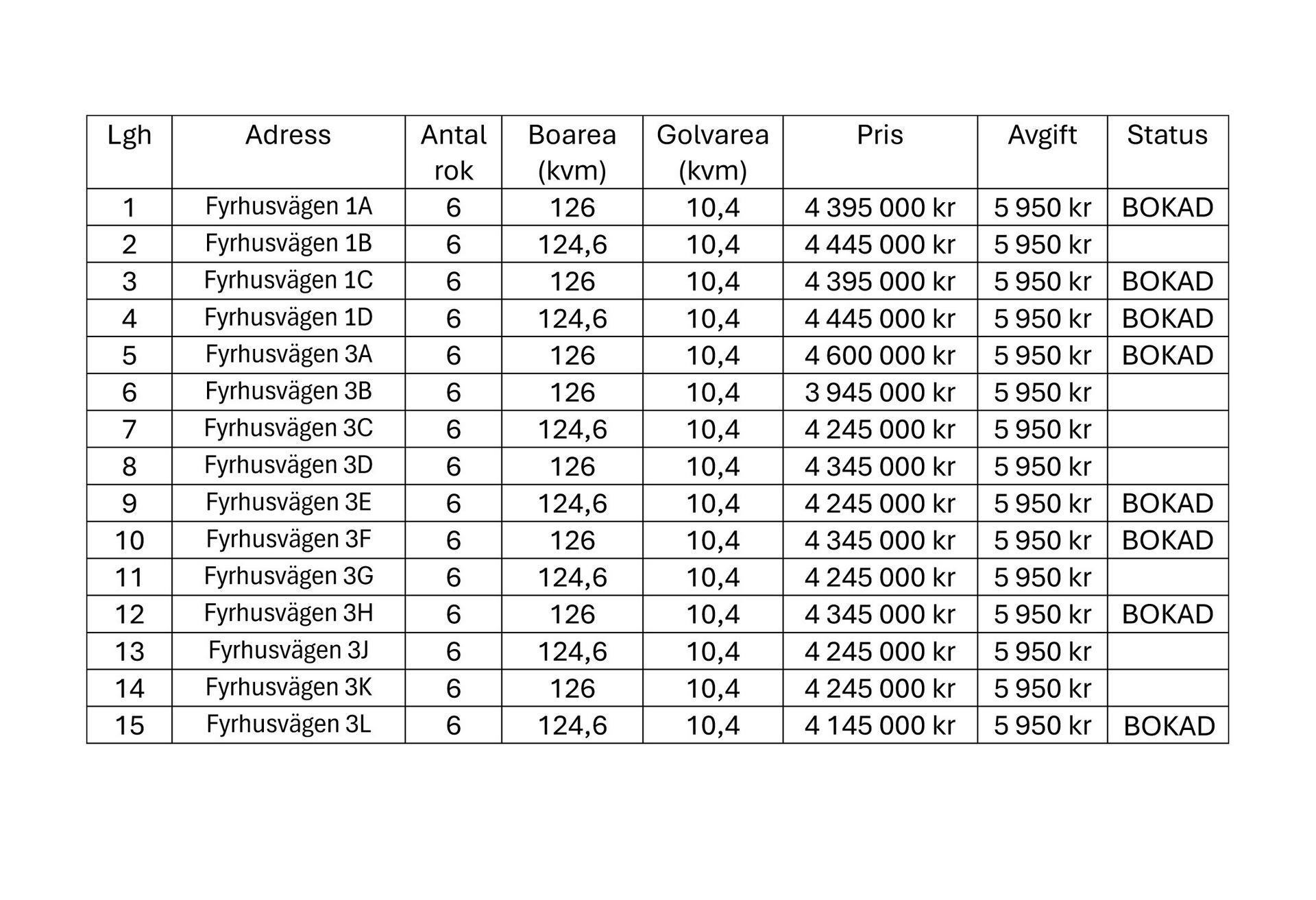 * Hus , 2, 4, 5, 6, 8, 10, 12, 14 har en boarea om ca 126 kvm och en extra golvarea om ca 10,4 kvm. Hus 1, 3, 7, 9, 11, 13, 15 har en boarea om ca 124,6 kvm och en extra golvarea om ca 10,4 kvm.