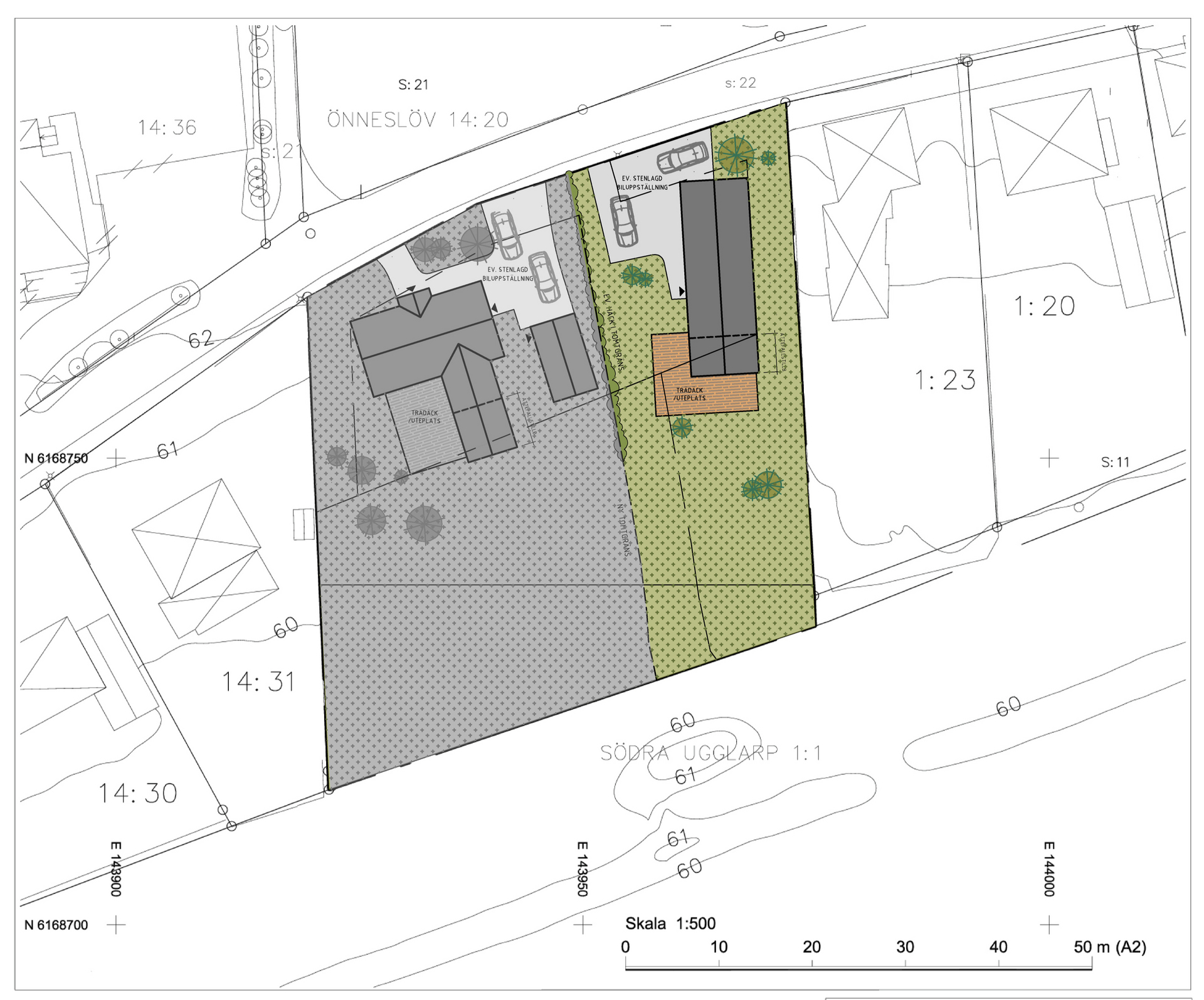 Enligt ett första samtal med handläggare på Lunds kommun bör det vara möjligt att göra en attefallstillbyggnad om max 30 kvm (bygglovsbefriad) i samband med nybyggnation, detta enligt de nya reglerna i plan- och bygglagen (PBL). I förslag som vi ritat på fastighetskartan har vi tillämpa de nya reglerna och en köpare uppmanas att själv kontrollera detta förslag med kommunen. För att läsa mer besök: https://www.boverket.se/sv/PBL-kunskapsbanken/nyheter-pa-pbl-kunskapsbanken/nu-galler-nytt-regelverk-for-bygglov/