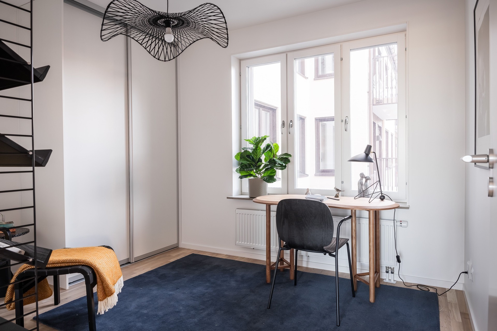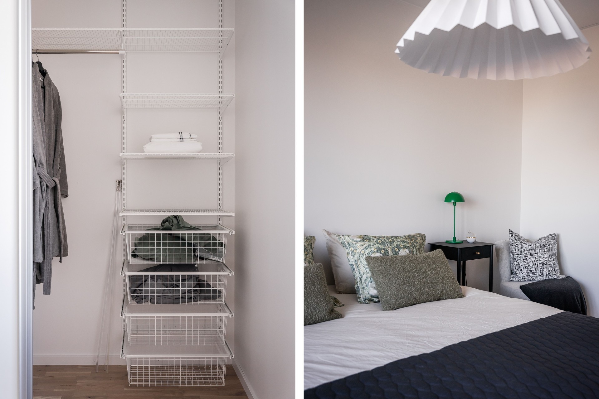 SOVRUM 2 - Sovrum med plats för skrivbord och säng. Sovrummet har förvaring i skjutdörrsgarderob med inredning från Elfa. Golv i ekparkett och vita väggarna.