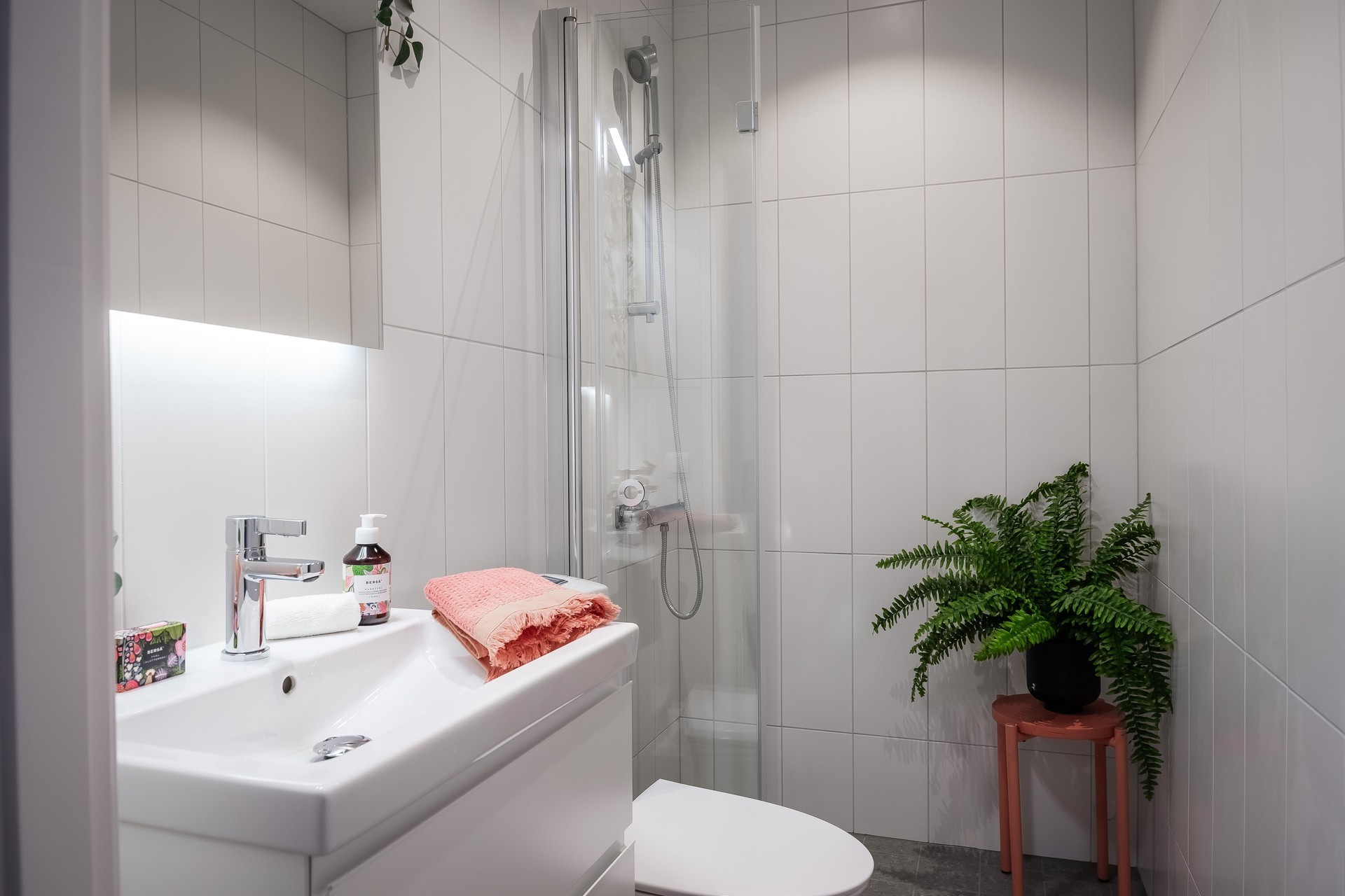 WC/DUSCH - Helkaklad wc/dusch med vitt kakel och grå klinkers utrustat med wc, handfat med kommod spegel med belysning samt dusch med glasdörr. Spotlights i taket.
