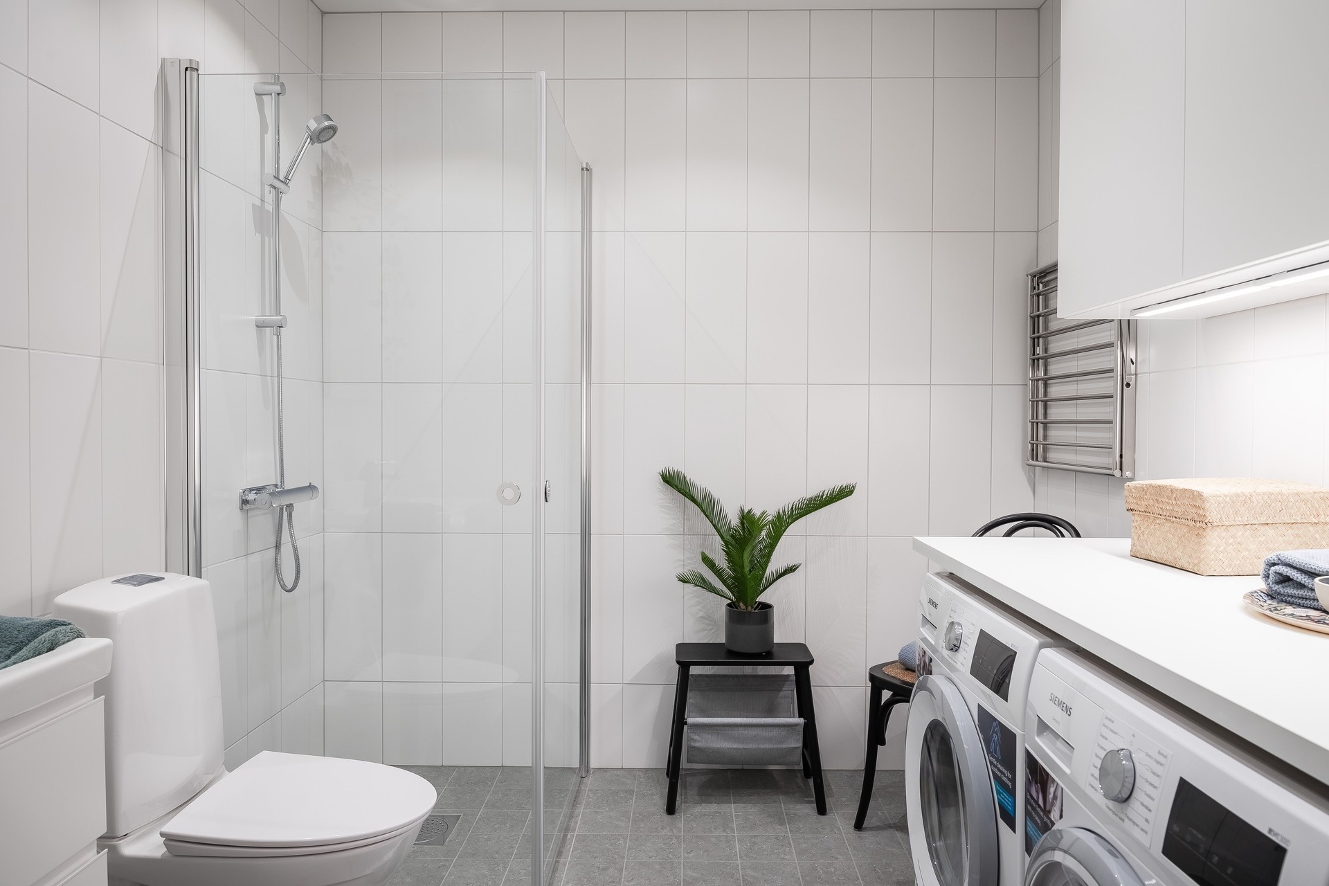 BADRUM - Helkaklat badrum i vitt kakel och grå klinkers. Badrummet är utrustat med wc, handfat med kommod, spegel med belysning, dusch med glasdörrar, tvättmaskin och torktumlare. Arbetsbänk ovan tvätt med vägghängda skåp ovan. Spotlights i taket.