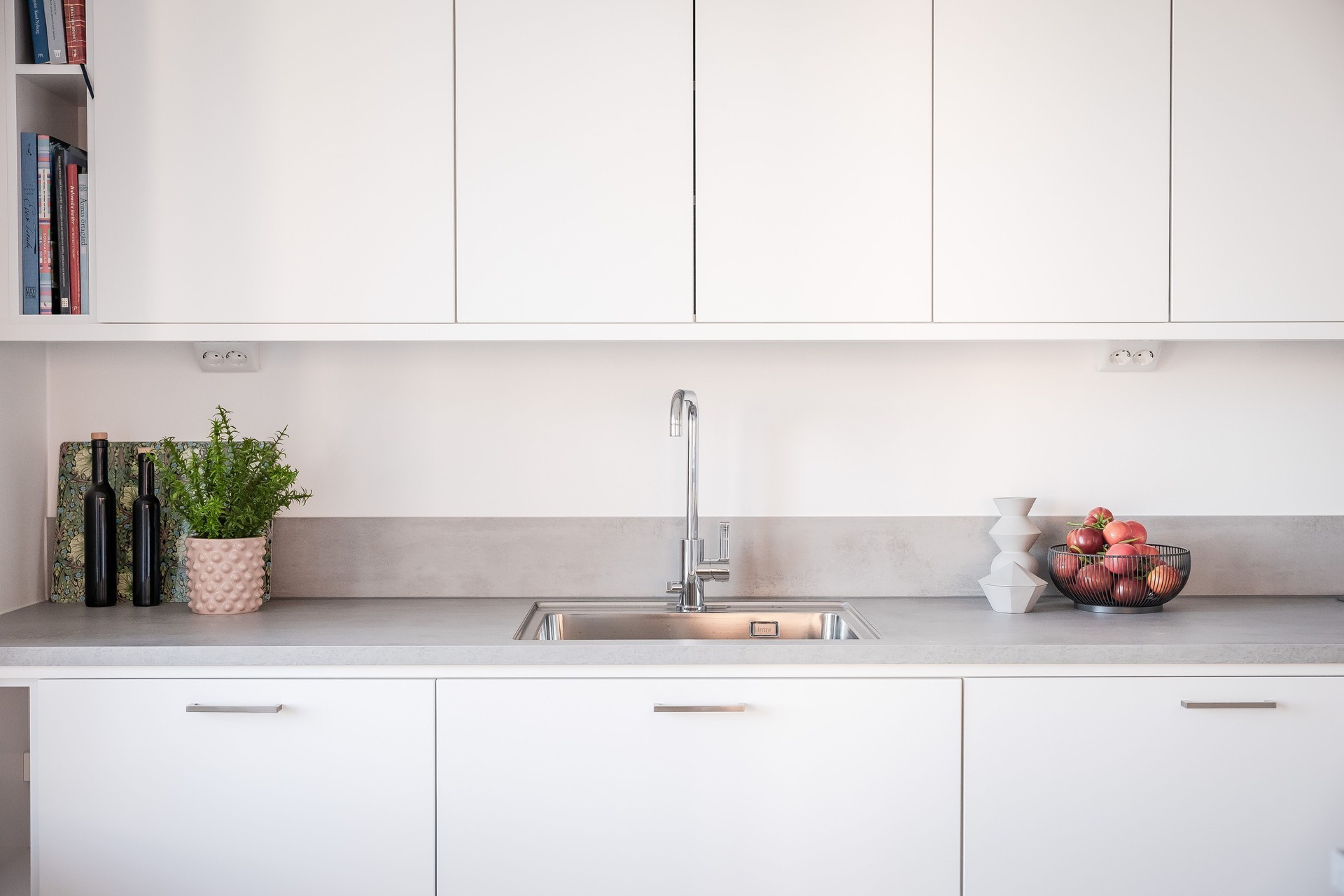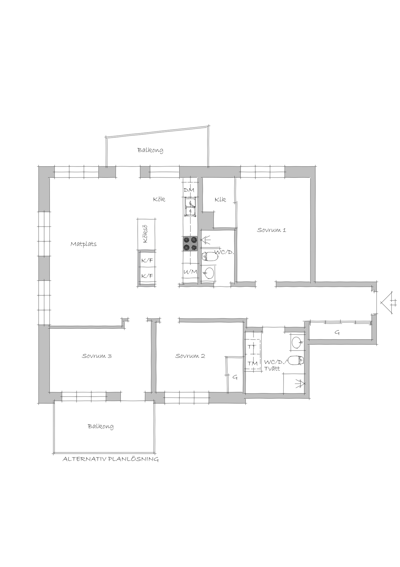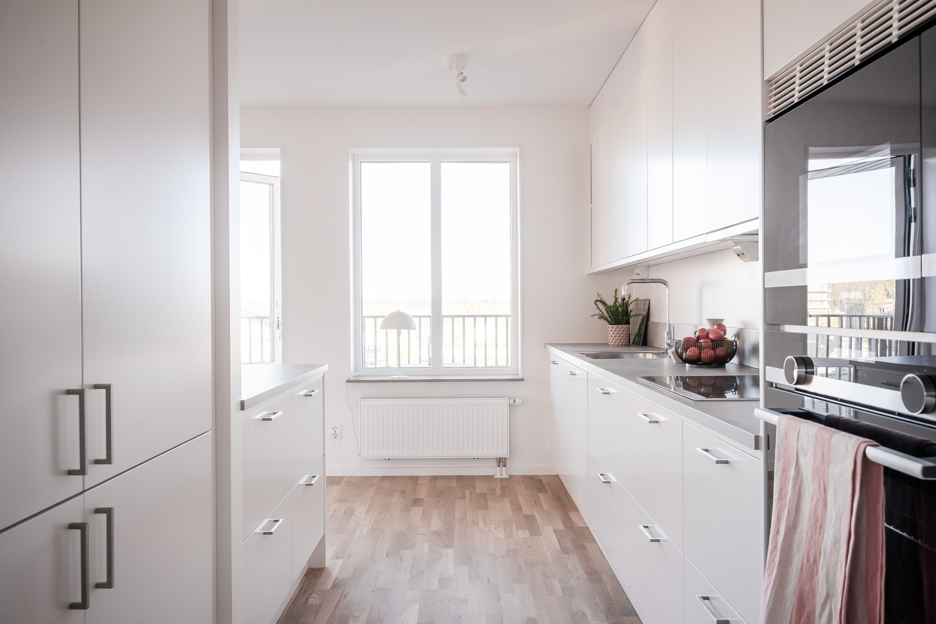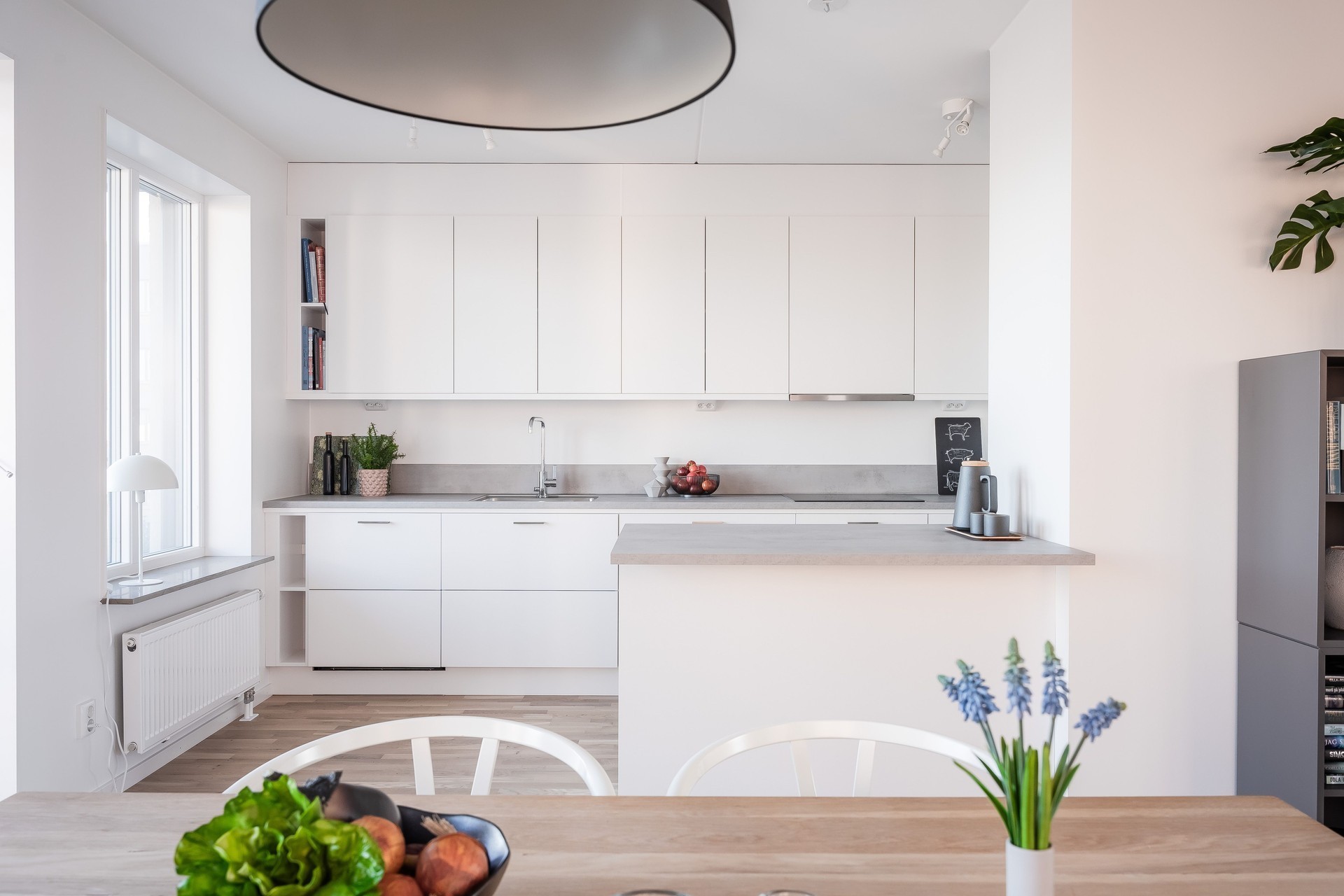 KÖK - Kök med öppen planlösning mot matplats. Köket från Vedum har vita köksluckor och grå bänkskiva. Köket är utrustat med integrerad diskmaskin, induktionshäll, ugn och mikrovågsugn i praktisk arbetshöjd samt dubbel integrerad kyl och frys. Alla vitvaror är från Siemens. Köket har en köksö mot matplatsen. Från köket nås en av de två balkongerna.