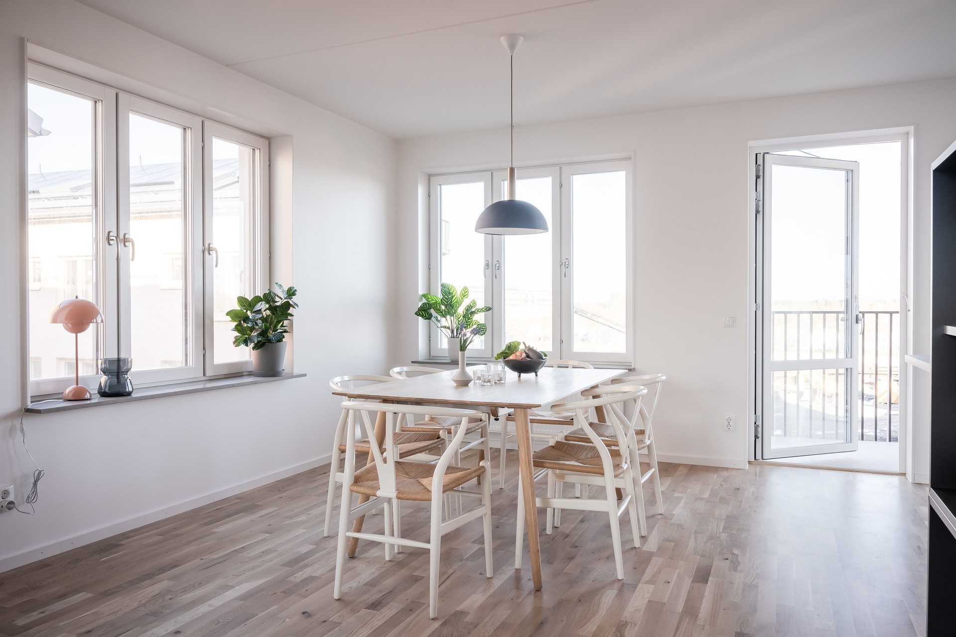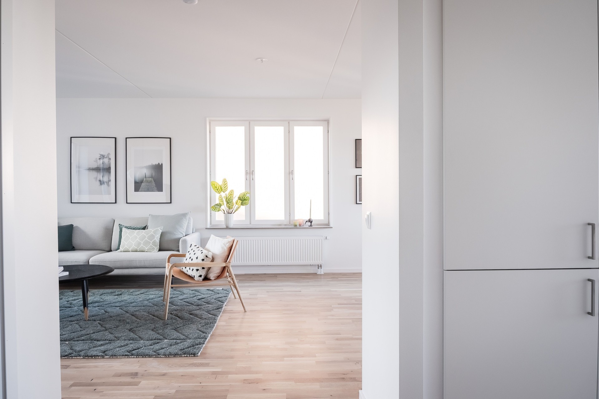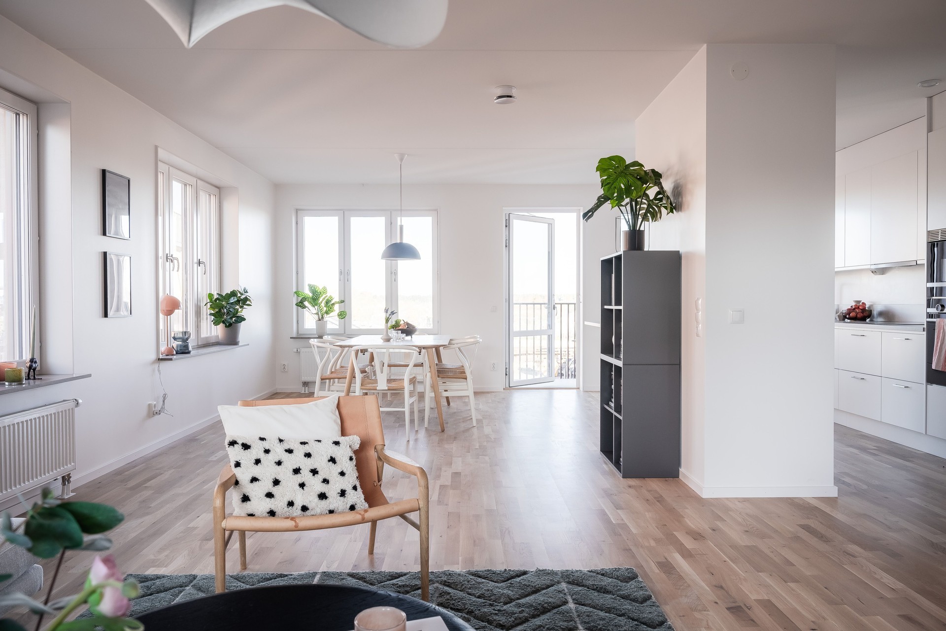 VARDAGSRUM - Generöst vardagsrum med plats för stor soffgrupp och matplats för större middagsbjudningar. Utgång till balkong mot innergården. Golv i ekparkett och vita väggarna.