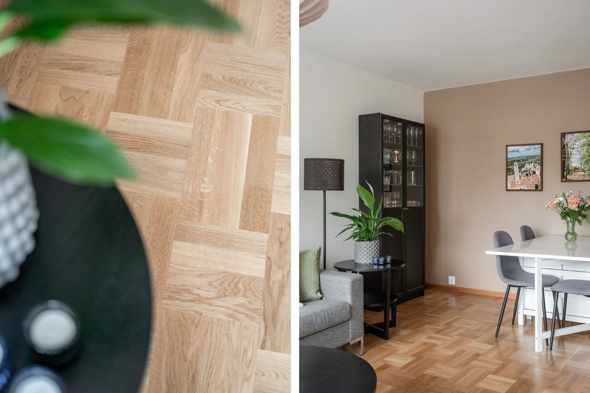 VARDAGSRUM - Från hallen når man genom de vackra dubbeldörrarna vardagsrummet med plats för både stor soffgrupp och matplats. Från vardagsrummet når man balkongen i sydväst. Smart utformad för att ge plats till mindre sittgrupp. Golvet är ett parkettgolv i holländskt mönster och väggarna är ljusa varav en vägg går i en beige/brun ton.