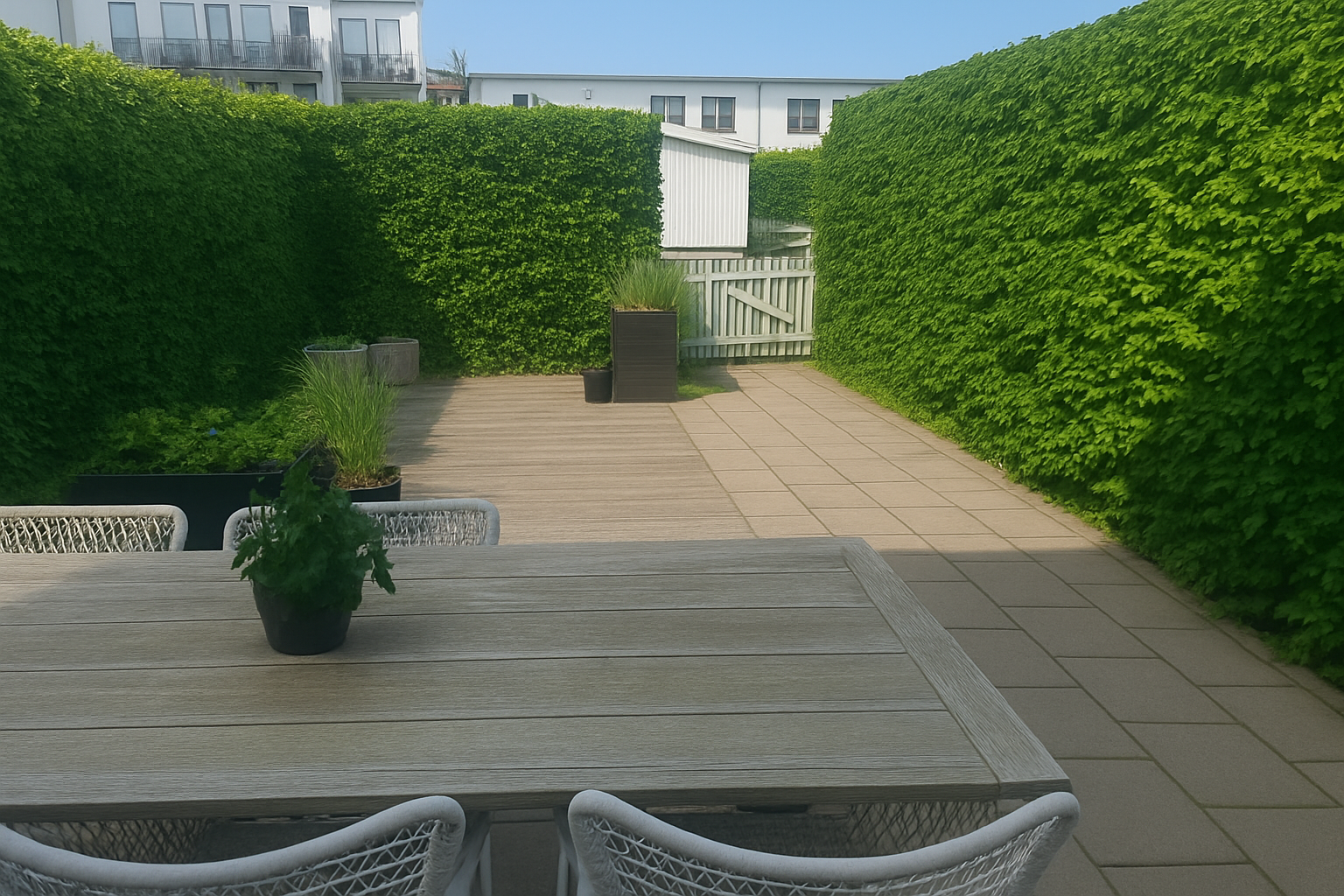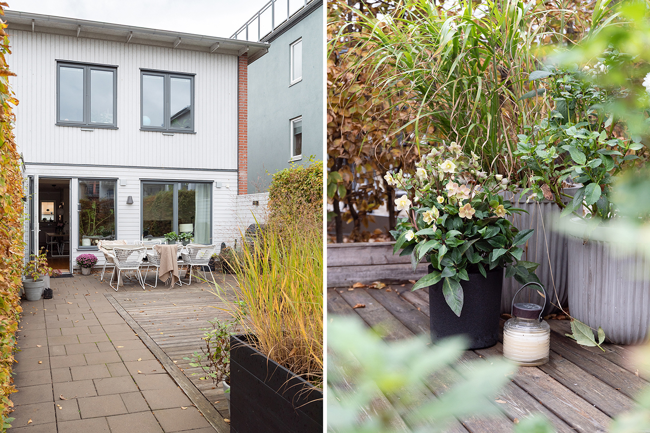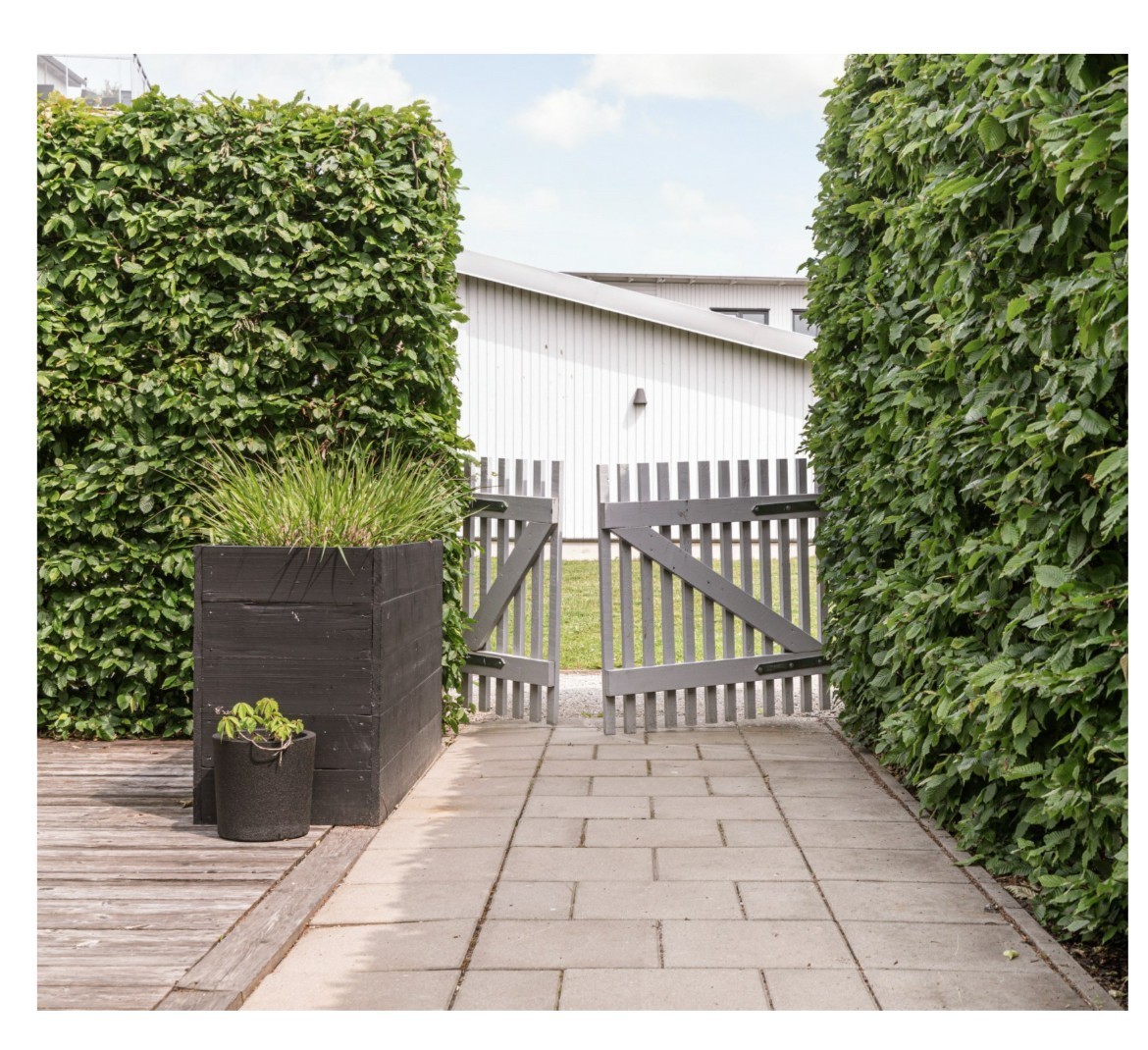 När området uppfördes 2017 lades stor vikt vid att skapa generösa och användbara utemiljöer. Resultatet är en flexibel trädgård som både erbjuder sol och skugga. Trädgården har stenläggning och trädäck, perfekt för matplats, loungegrupp, lek eller odling. Den täta bokhäcken ramar in tomten och skapar en grön oas med både sol och skugga under dagen.