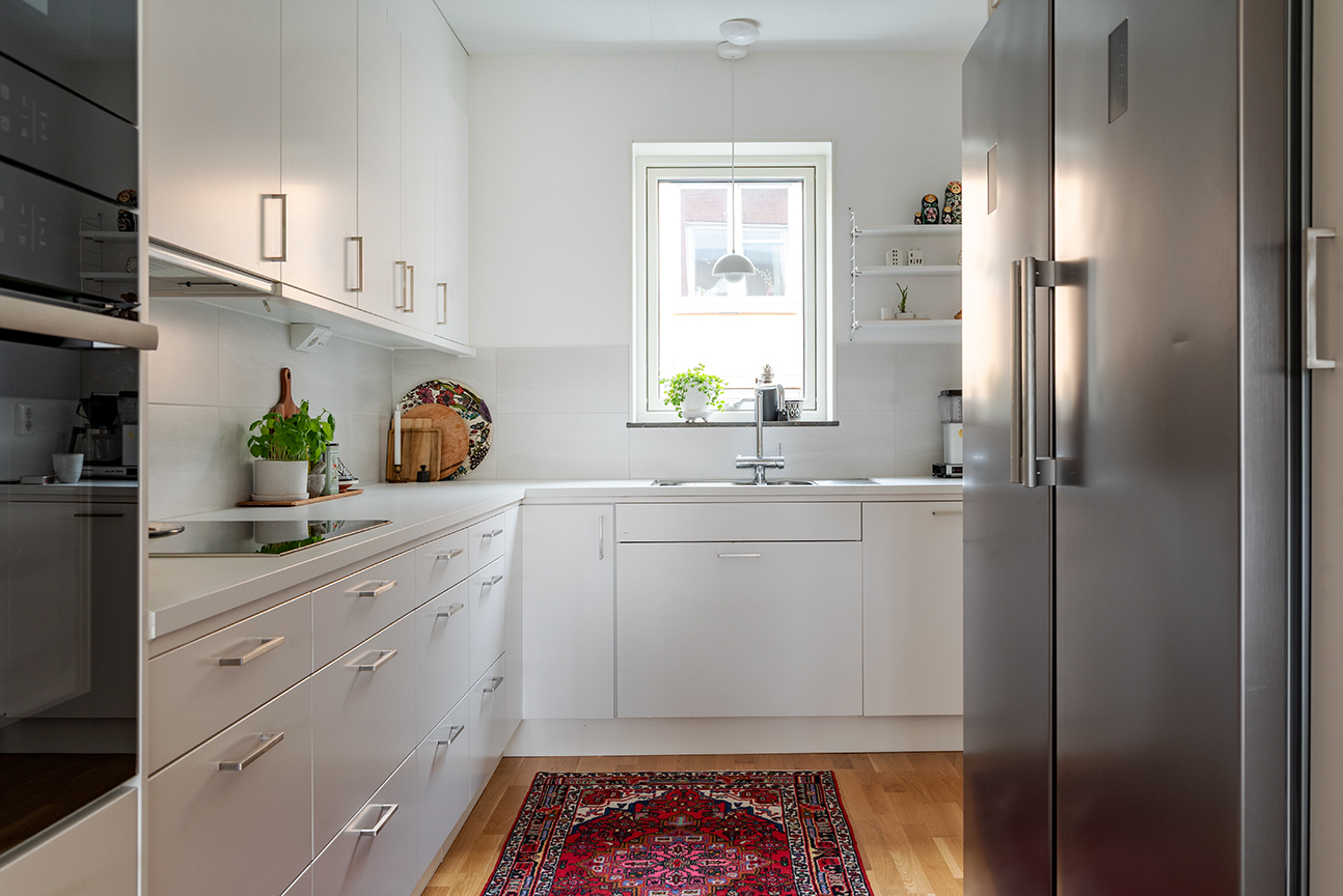 KÖK - Till höger om hallen når man det stilrena köket från Vedum. Köket är smakfullt inrett med vita luckor, ljus bänkskiva och kakel ovan arbetsytorna. Den moderna utrustningen består av induktionshäll, ugn, mikrovågsugn, hel kyl och frys (båda från 2024) samt integrerad diskmaskin. Förvaringsmöjligheterna är generösa i både bänkskåp och väggskåp. Ovanför vasken ger ett trevligt fönster utsikt mot entrésidan.