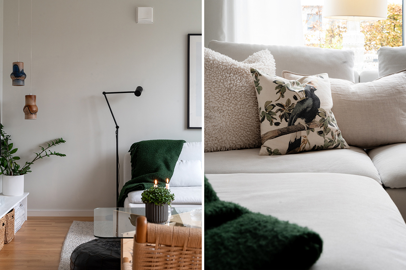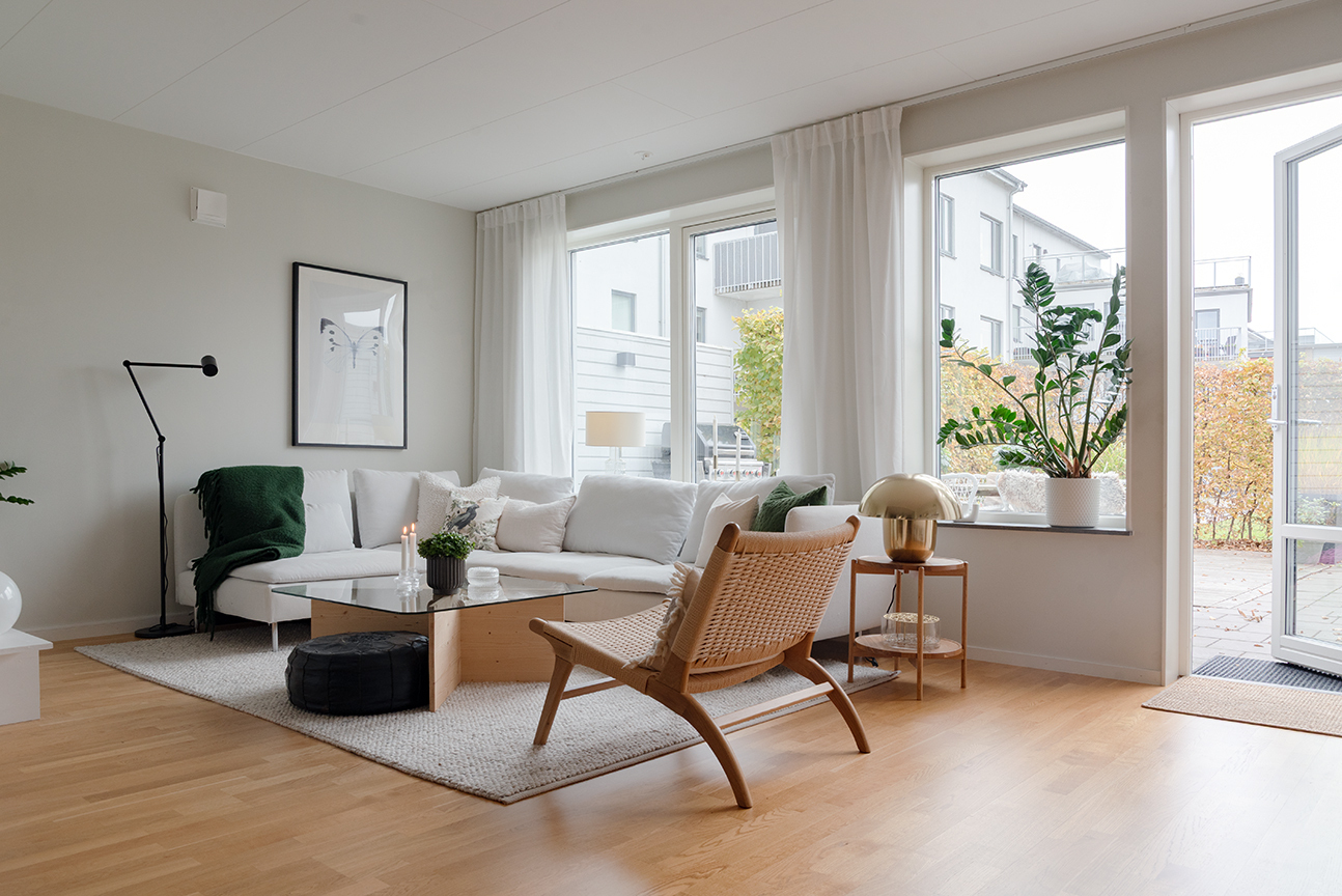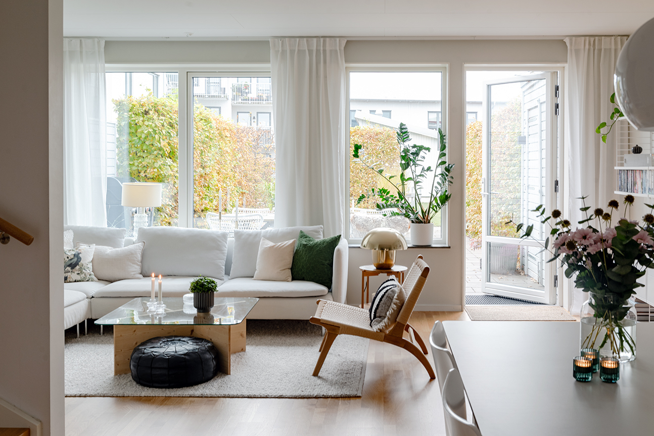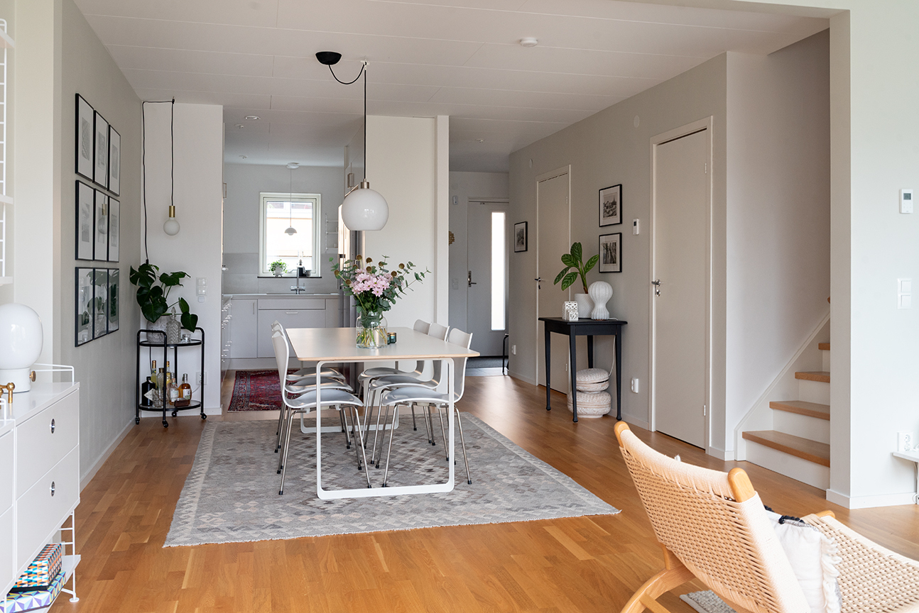 Invändigt möts du av en stilren och välskött interiör. Det moderna köket från Vedum går i vitt med bra arbetsytor och praktisk förvaring. Det luftiga vardagsrummet i förlängning av kök och matplatsen bjuder in till umgänge i både vardag och fest. Här ryms soffgrupp och stort matbord, och de stora fönsterpartierna fyller rummet med naturligt ljus. Via vardagsrummet nås uteplatsen och trädgården som blir en förlängning av bostaden under årets varmare månader. Parkettgolv löper genom rummen och väggarna är målade i den ljusa kulören ”Sommarsnö” från Jotun.