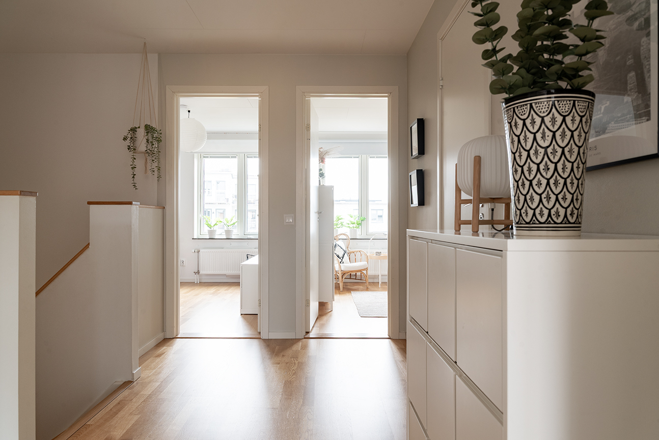 HALL - Ovanvåningen öppnar upp till en möblerbar hall som även rymmer en rymlig klädkammare med Elfa-inredning.