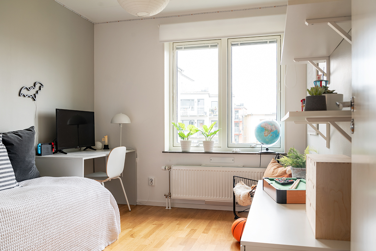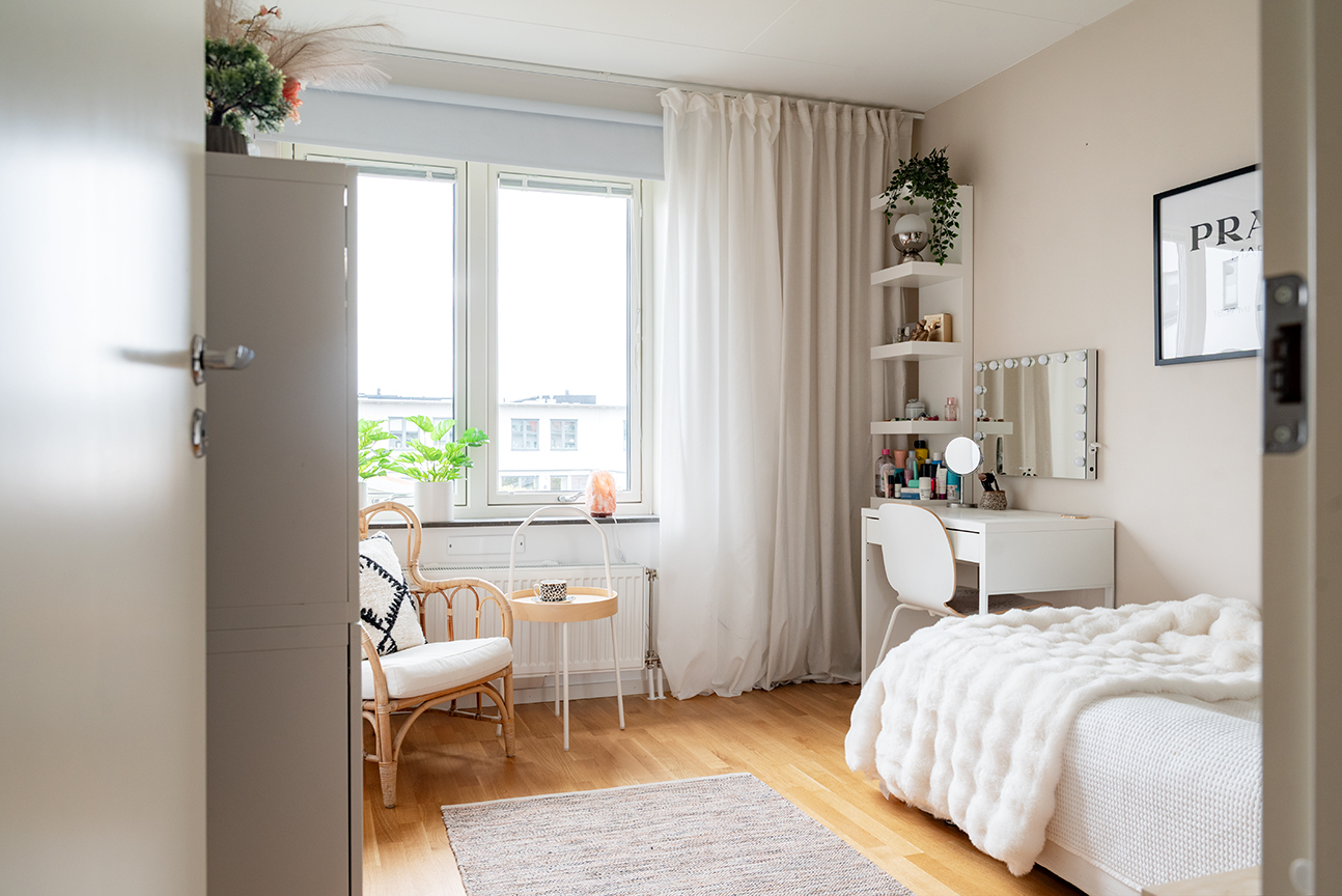 SOVRUM 1 - Trivsamt sovrum med utsikt mot innergården – ett perfekt barn- eller tonårsrum. Parkettgolv, ljusa väggar samt en fondvägg i mjuk beige nyans skapar en inbjudande atmosfär. Plats finns för både säng och skrivbord.