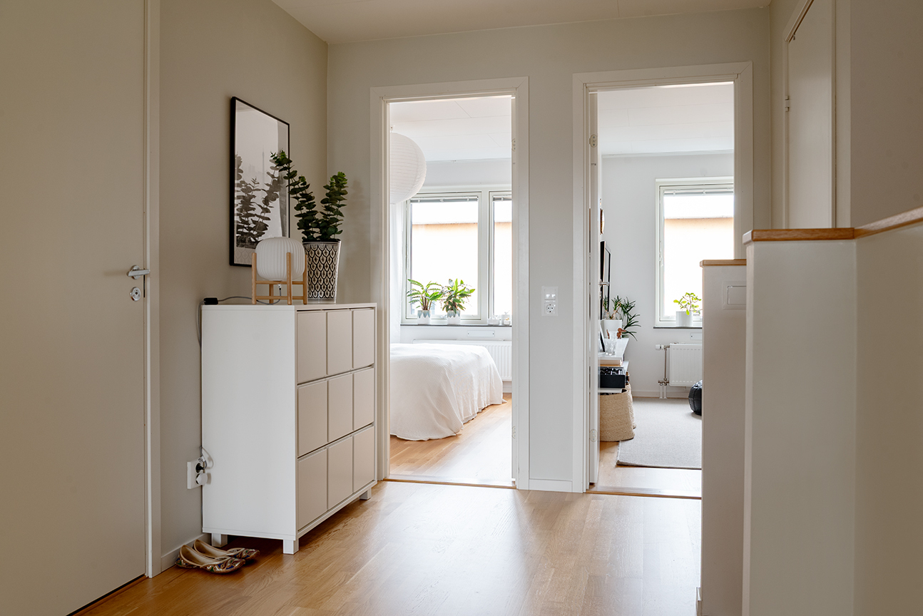 Bostaden erbjuder fyra bra sovrum samt utmärkta förvaringslösningar med både klädkammare och skjutdörrsgarderober. Två badrum finns, varav ett som är utrustat med tvättmöjligheter, en optimal lösning för barnfamiljen.