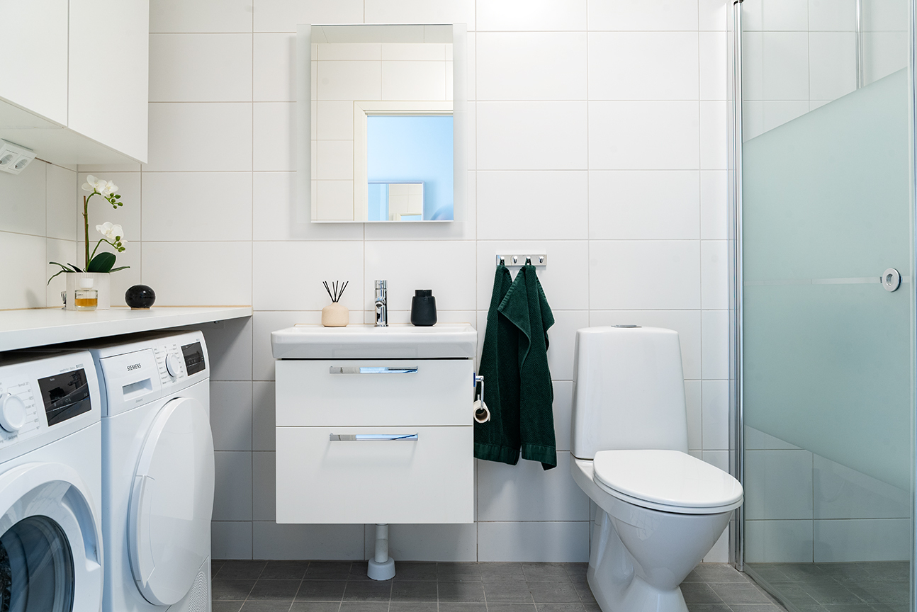 WC/DUSCH MED TVÄTT - På entréplan finns ett fräscht helkaklat badrum med vitt kakel på väggarna och ljusgrå klinker på golvet. Här finns duschväggar i glas, toalett, handfat med kommod, badrumsspegel med belysning samt golvvärme. Praktiskt integrerat finns även tvättmaskin och torktumlare med arbetsbänk och väggskåp för extra förvaring.