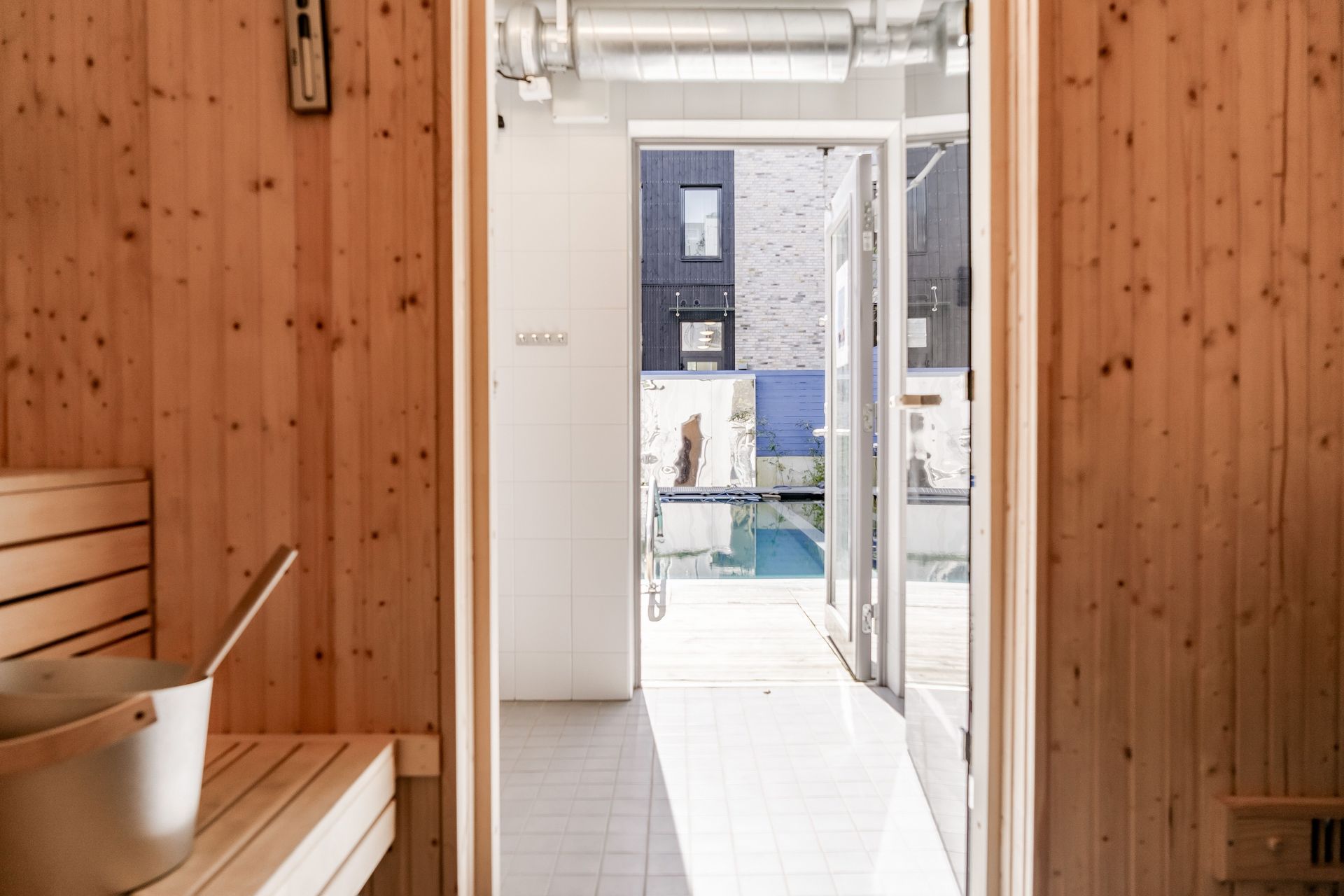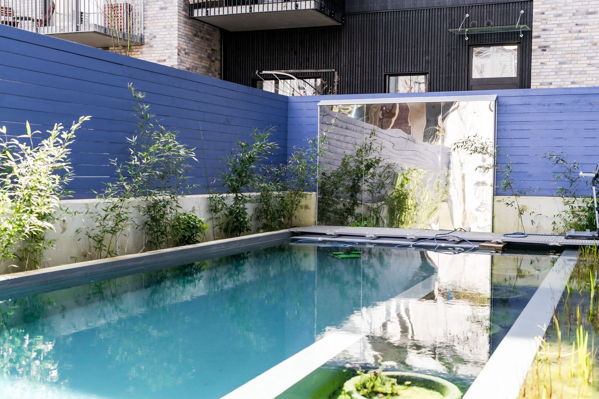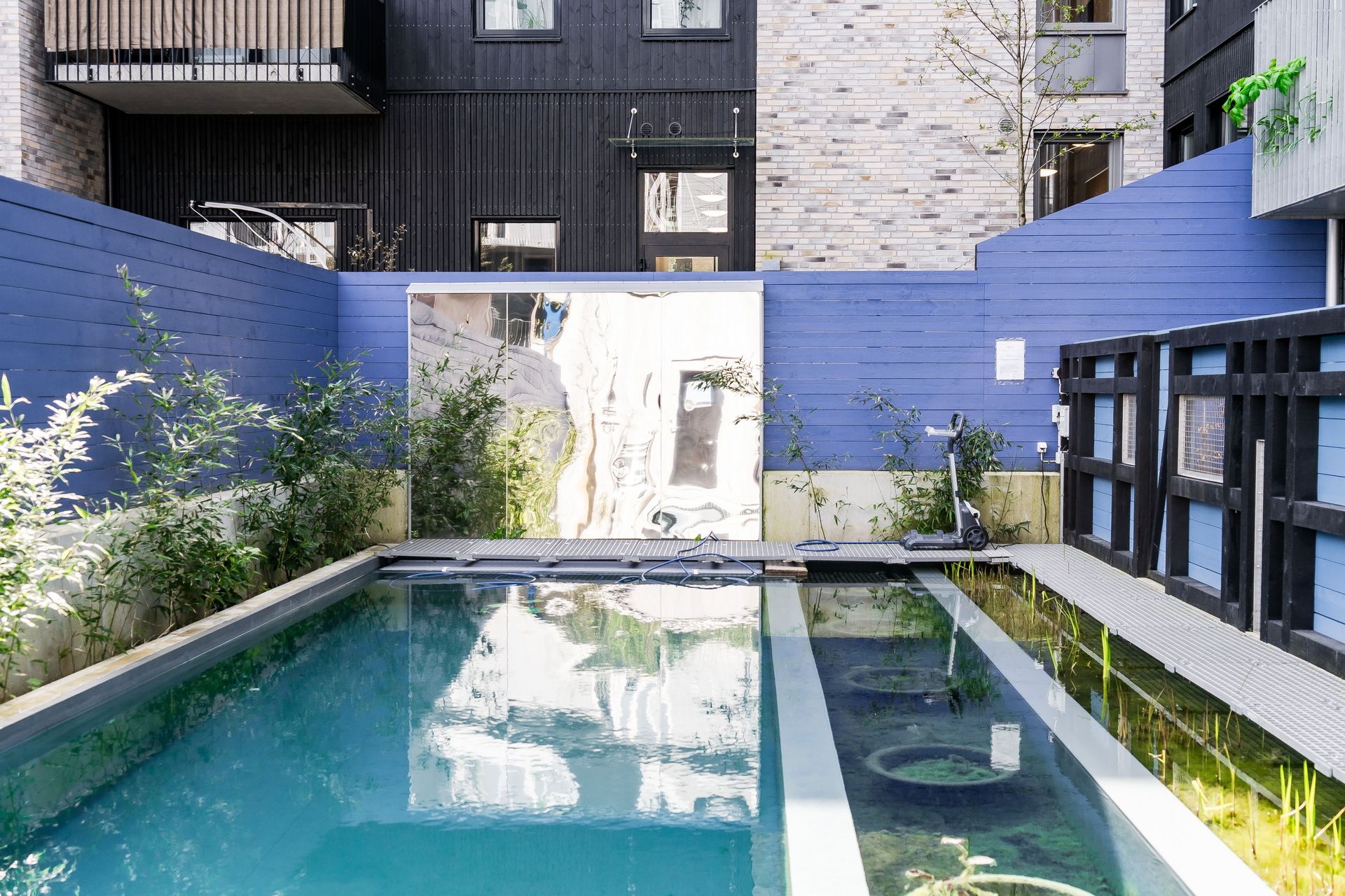 Innergården är föreningens hjärta, med en klorfri naturpool där man istället använder sig av växter och sandfilter för en naturlig rening av vattnet. Intill ligger bastun med glasdörrar ut mot poolen. Högst upp ligger den exklusiva badbalkongen högst upp på nionde våningen. Det gemensamma spabadet erbjuder en fin vy över Brunnshög och åkrarna runt om. Här har man dessutom tagit hållbar dagvattenhantering till en ny nivå. Regnvattnet samlas upp och används för bevattning av planteringar både på marken och på fasaden, där smarta droppsystem säkerställer att inget vatten slösas. De djupa planteringsytorna och Urban Layers-lösningarna skapar gröna oaser som samtidigt hjälper till att fördröja och ta hand om regnvatten på ett effektivt sätt.