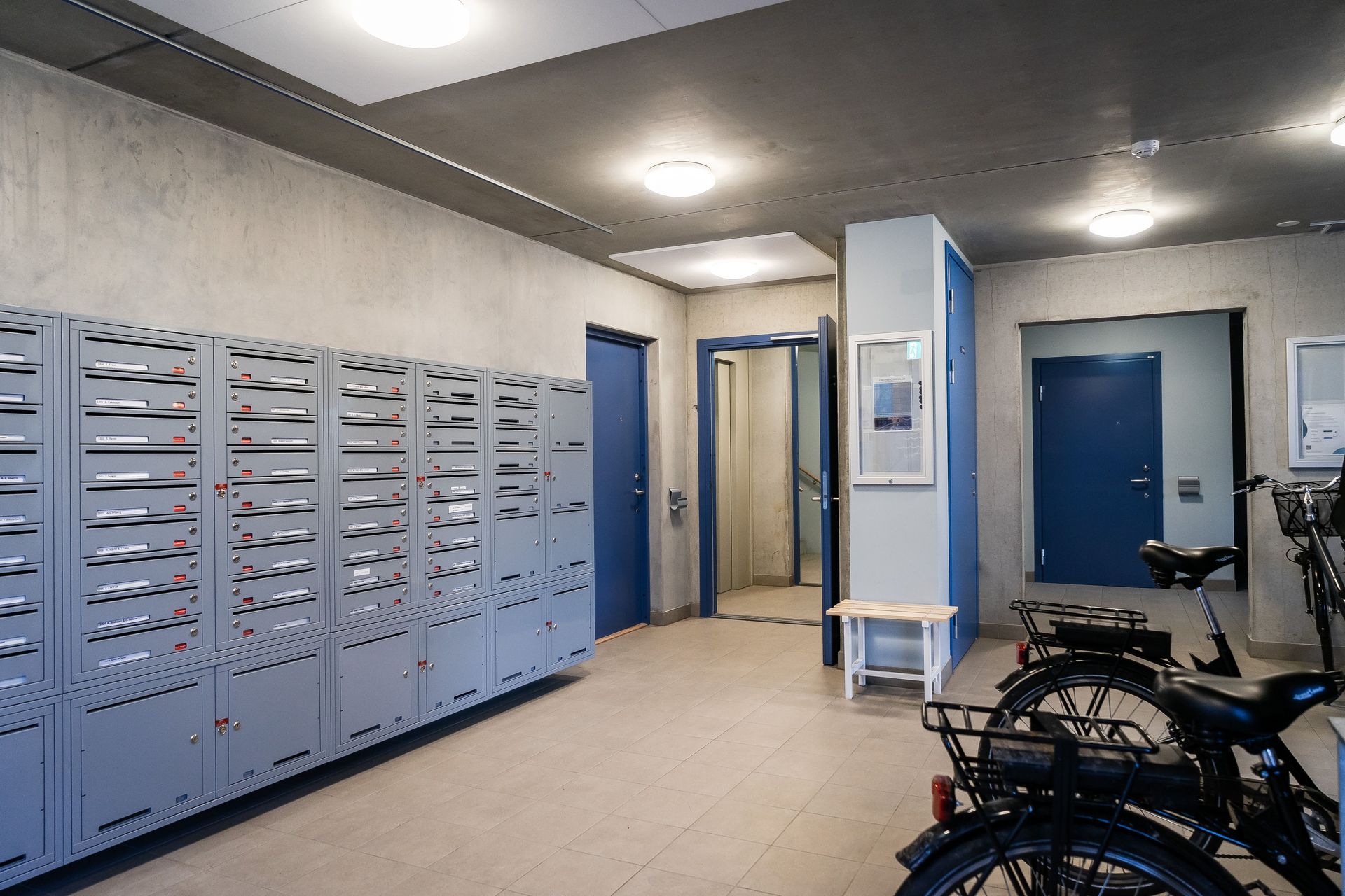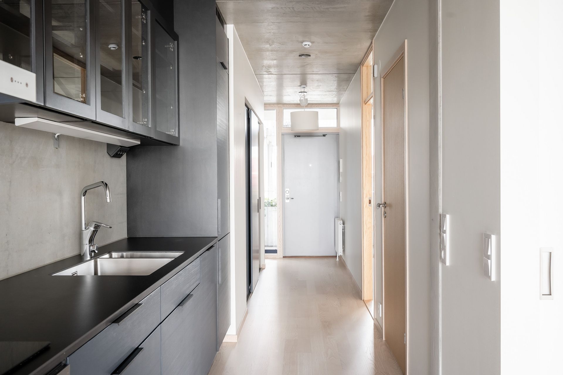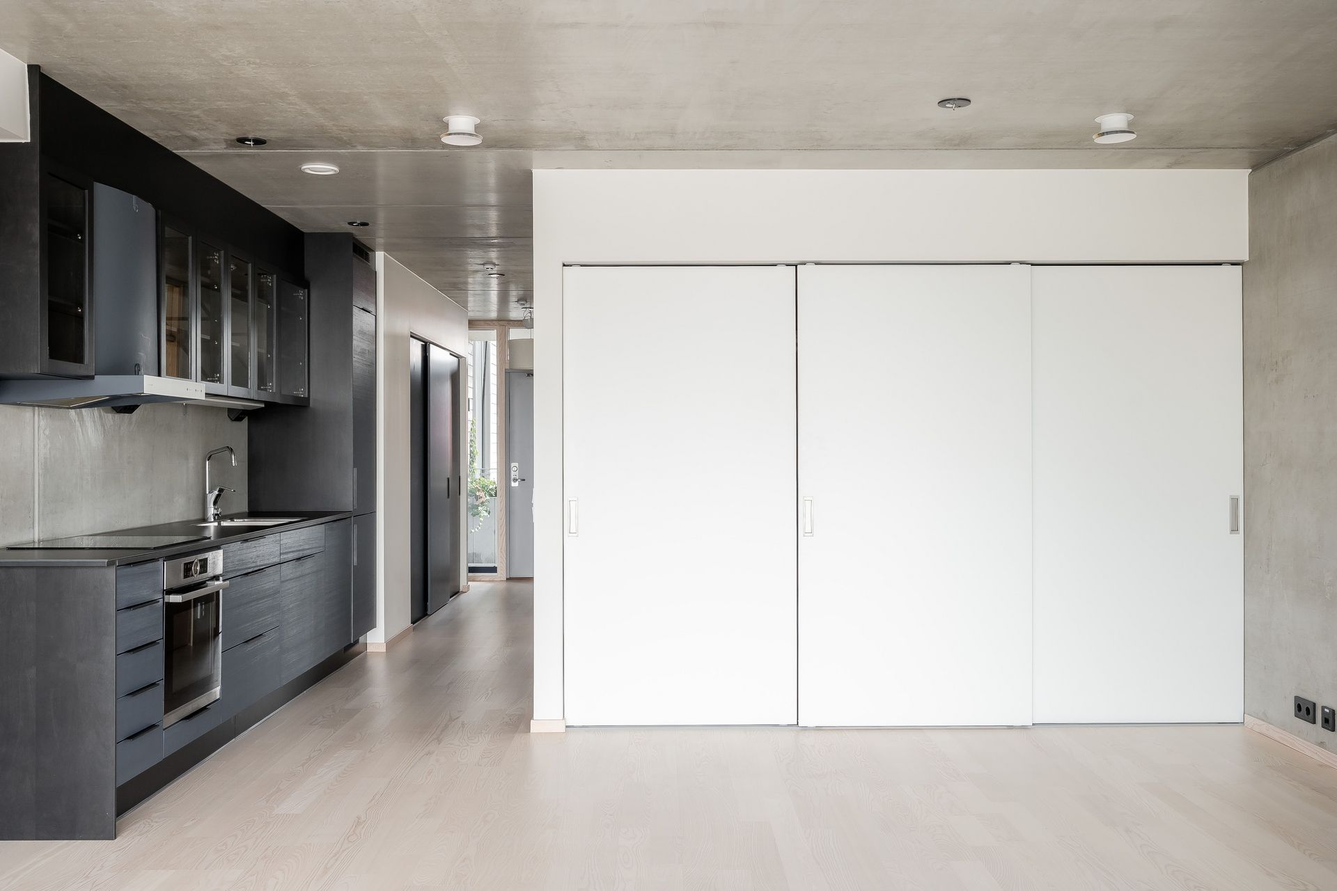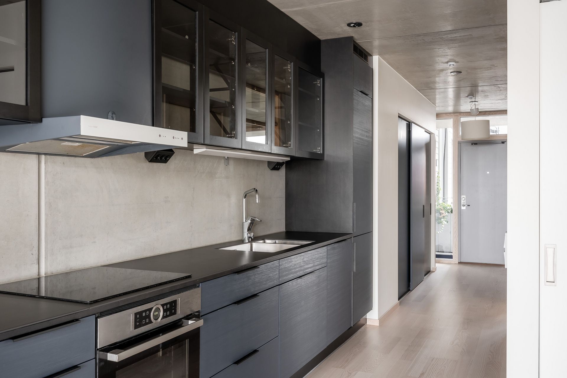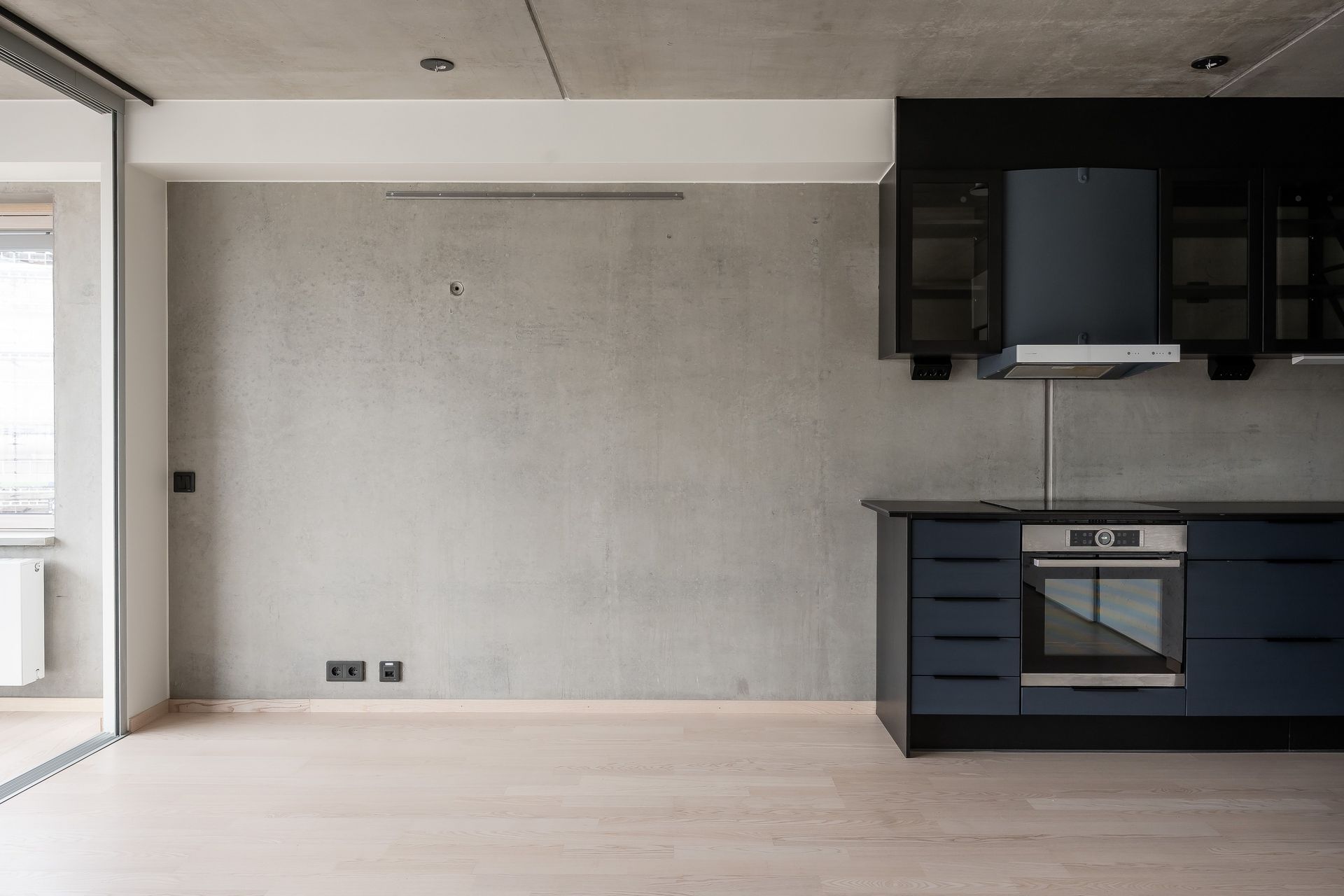 KÖK - Vardagsrum och kök ligger i öppen planlösning med fantastiskt ljusinsläpp från de stora fönsterpartierna. Köket är modernt och stilrent från Puustelli, med blå köksluckor, 6 mm keramisk bänkskiva i svart, biokompositstomme, betongvägg ovan köksbänk och en glipa mellan skåpslucka och stomme som fungerar som handtag. Ett kök som andas minimalism och funktion! Utrustningen består av induktionshäll, köksfläkt, ugn, kyl/frys, integrerad diskmaskin samt en stilren underlimmad vask med raka kanter. Väggarna är rå betong med vitmålade partier och golvet i askparkett.