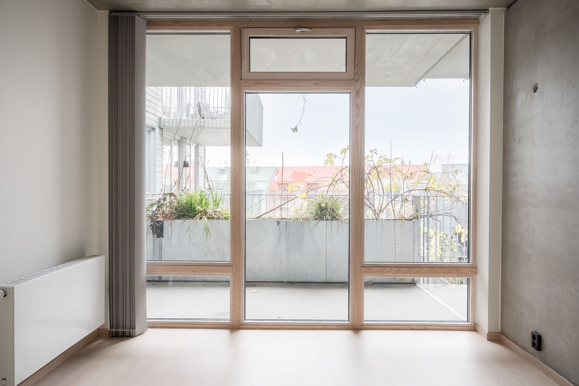 LOGGIA - Som en förlängning av vardagsrummet finns en loggia. En indragen, uppvärmd balkong som räknas som boarea. Rummet kan delas av från vardagsrummet med glasparti och takskena för gardin, eller lämnas öppet för att njuta av det generösa ljusinsläppet från de stora öppningsbara fönsterpartierna. För att höja stämningen finns ett badkar som även fungerar som sittbänk när det inte används. Utanför fönstren finns en plantering med självbevattningssystem som förstärker känslan av att ute möter inne. Den ena delen av loggian är kaklat i vitt, medan andra delen har askparkett som linjerar med resten av bostaden.