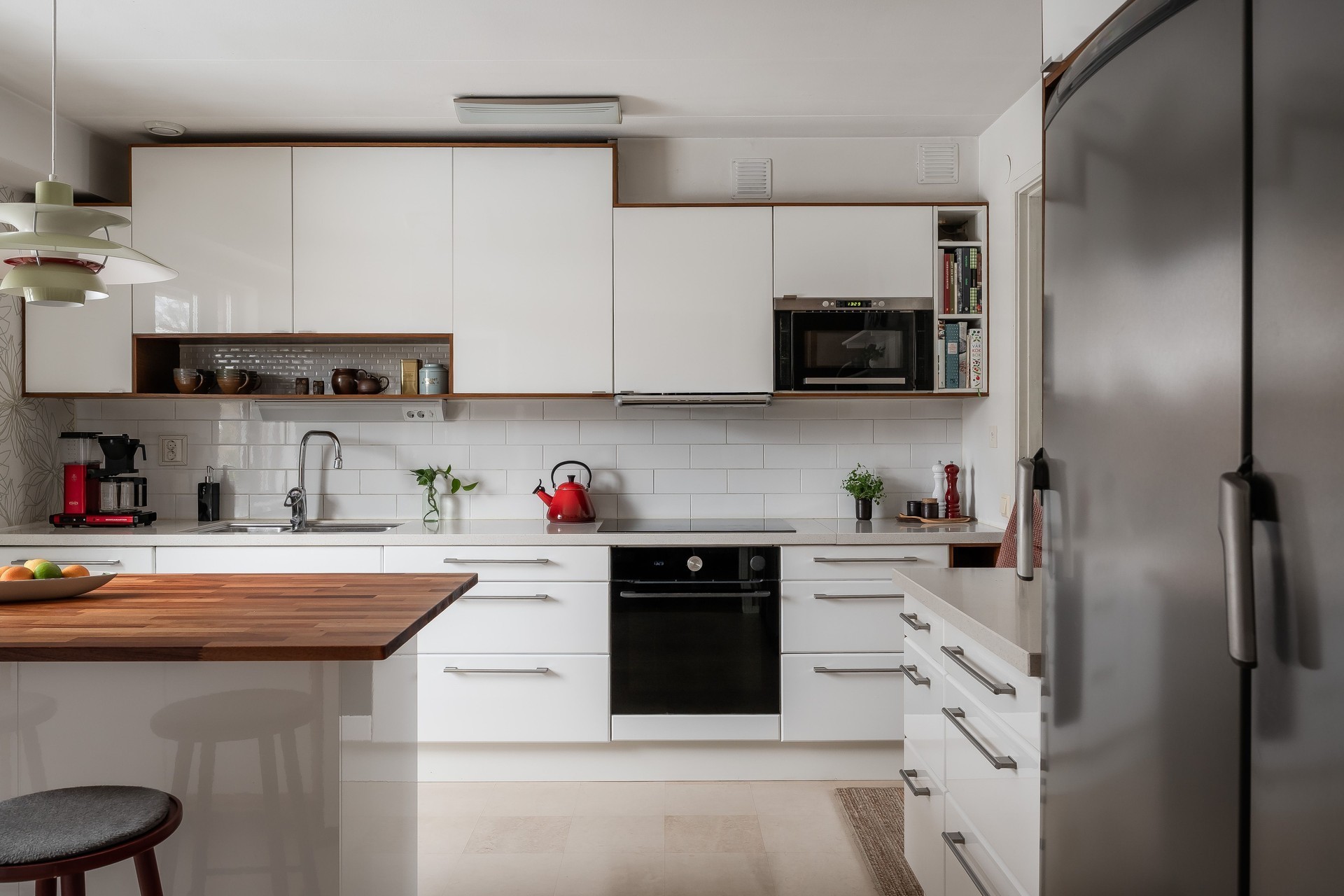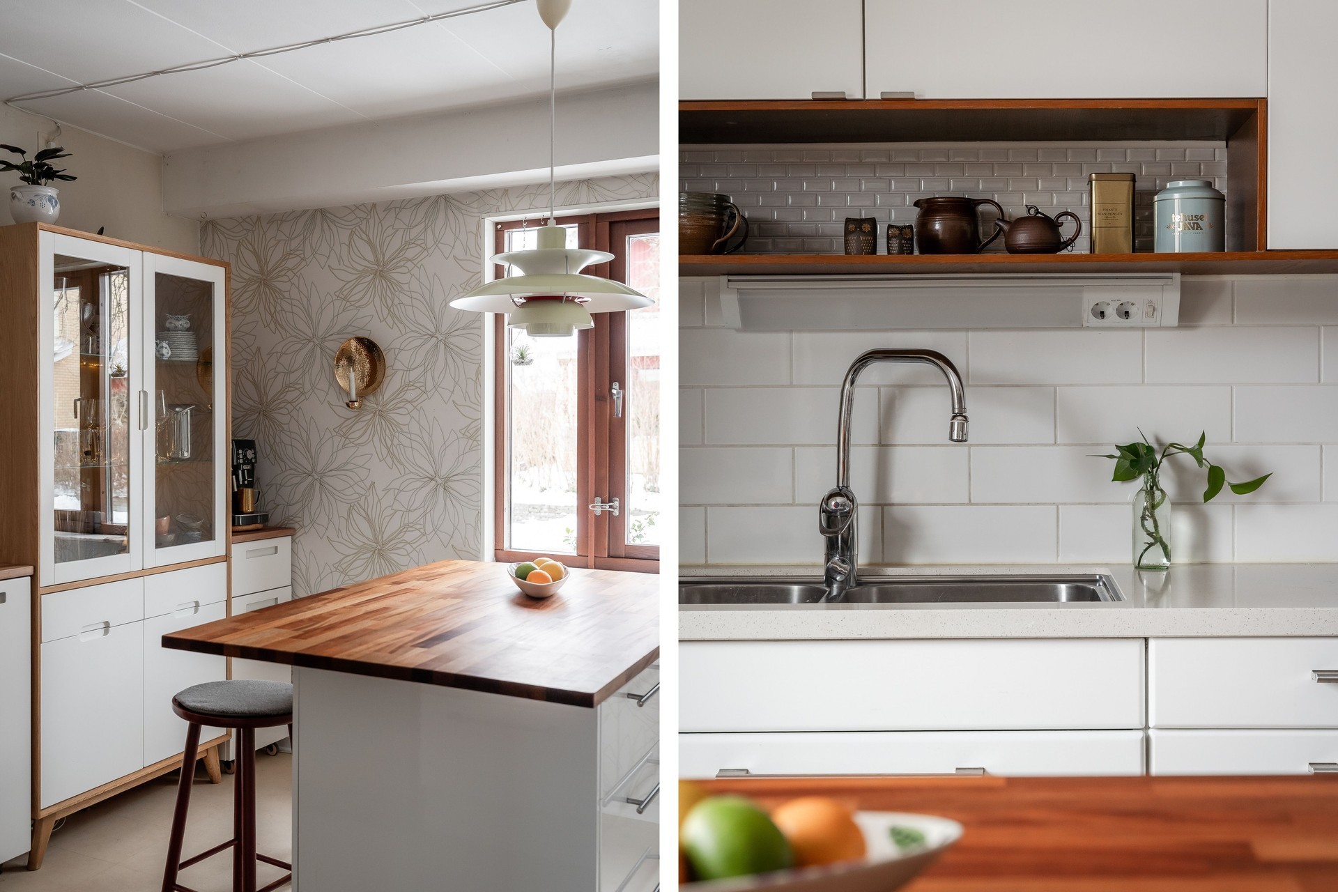 KÖK - Socialt och rymligt kök med generösa arbetsytor och en praktisk köksö på hjul. Kök från IKEA (2009) som renoverats löpande under åren. Köket är utrustat med vita luckor (2019) som matchar fint med den vita bänkskivan i sten, induktionshäll, varmluftsugn (2020) mikrovågsugn, kyl, frys samt integrerad diskmaskin (2021). Golvet är klätt med ett linoleumgolv (Forbo Marmoleum Click) och väggarna är tapetserade ljusa. Från köket nås tvättstugan/grovköket.