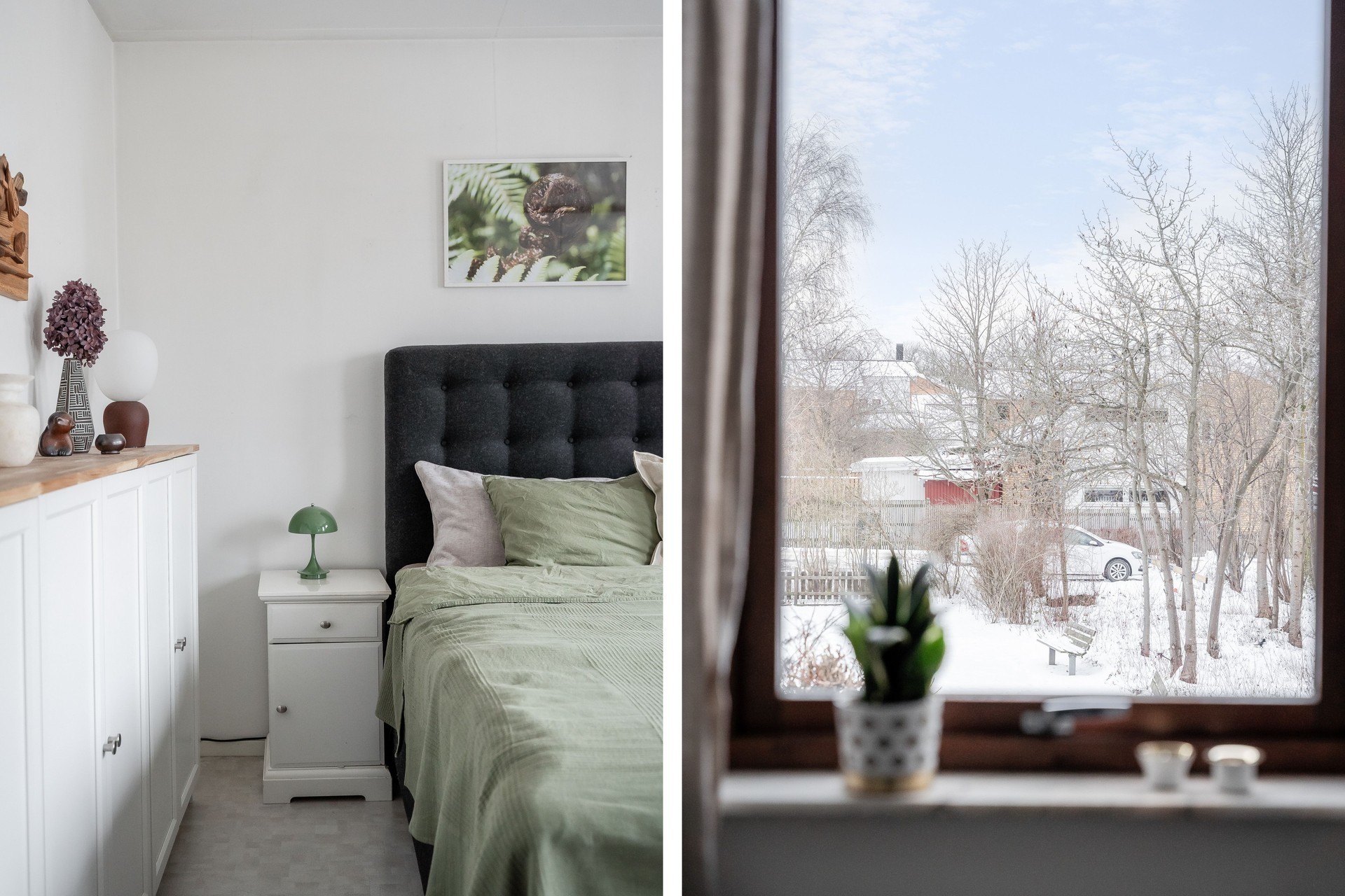 SOVRUM 2 (Master bedroom) - Stort sovrum med trevlig utsikt över trädgården och grönområdet bakom huset. Generös plats för dubbelsäng och god förvaring i garderober. Plastmatta på golvet och ljusa väggar.