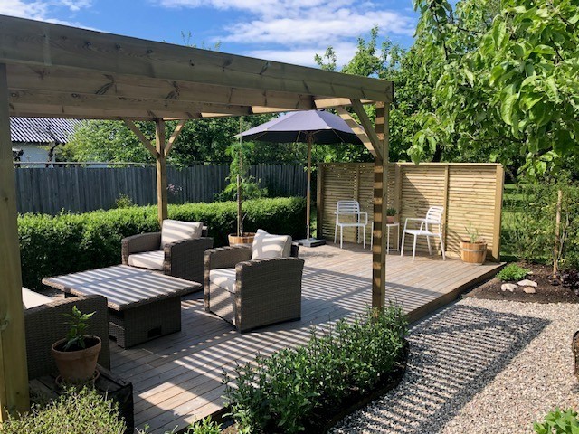 För att bidra till "villakänslan" finns det en tillhörande uteplats i syd-/västläge som ger utrymme för umgänge, grillkvällar och trevligt trädgårdshäng. Uteplatsen är enskilt för innehavare av denna lägenhet och är fint avgränsad med häck för att få en mer privat känsla. Samtliga bostäder i föreningen har en egen uteplats och utöver det finns den gemensamma trädgården.