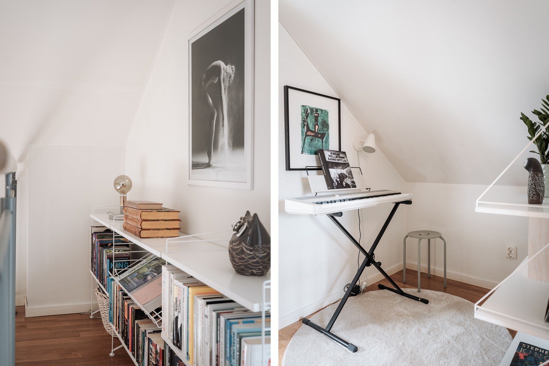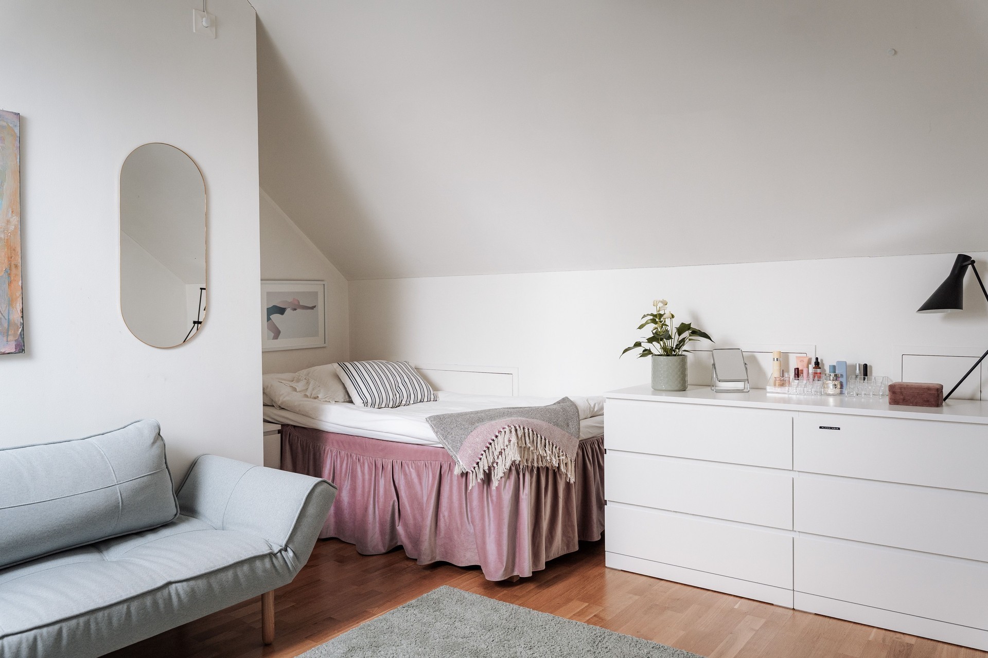 Sovrum 2 - Bra till ytan med plats för säng, skrivbord och förvaring. Mysigt rum med snedtak men som samtidigt är lätt att möblera då snedtaket inte går hela vägen ner till golvet. parkettgolv och vita väggar.
