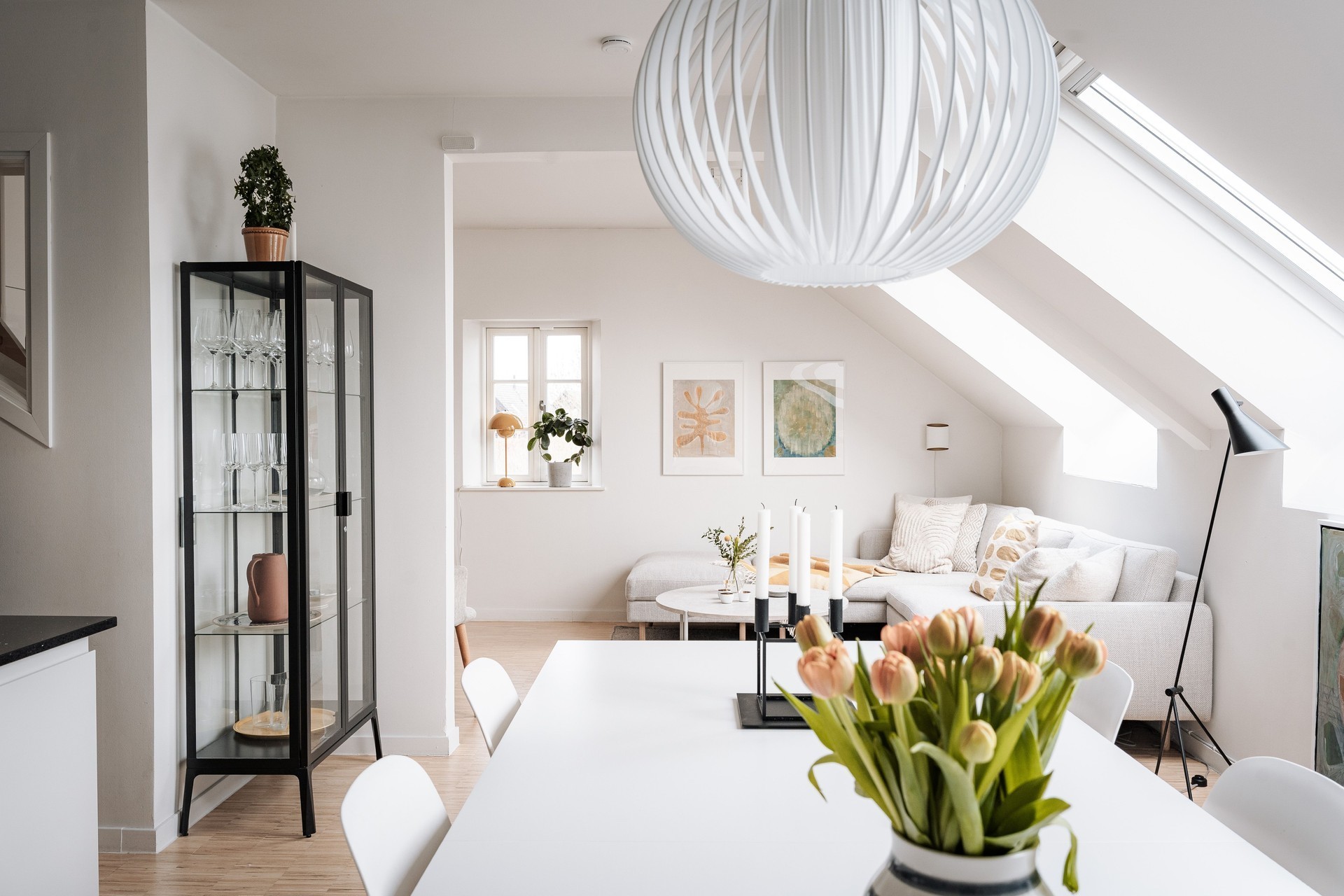 Kök/vardagsrum - I öppen planlösning, med härligt ljusinsläpp, sträcker kök/vardagsrum ut sig genom bostaden. Ytan är naturlig att möblera och ger utrymme för stor matgrupp och soffa som rymmer familjen eller det större sällskapet. Tre takfönster ger karaktär till utrymmet och ytterligare ett fönster på gaveln bidrar till det härliga ljusflödet. Industriparkett och vita väggar. Från den inre delen av vardagsrummet nås trappan som tar en till plan 3.