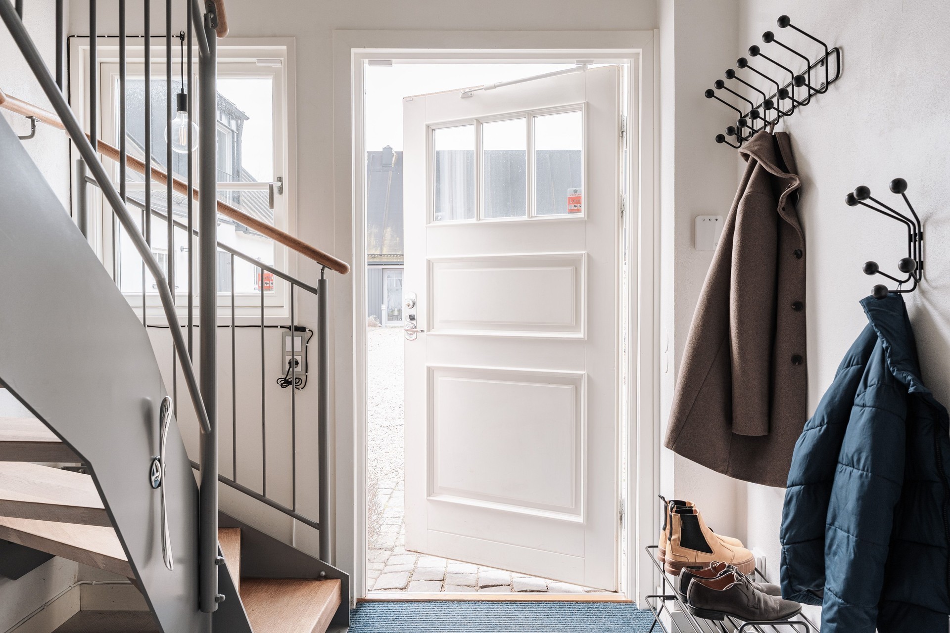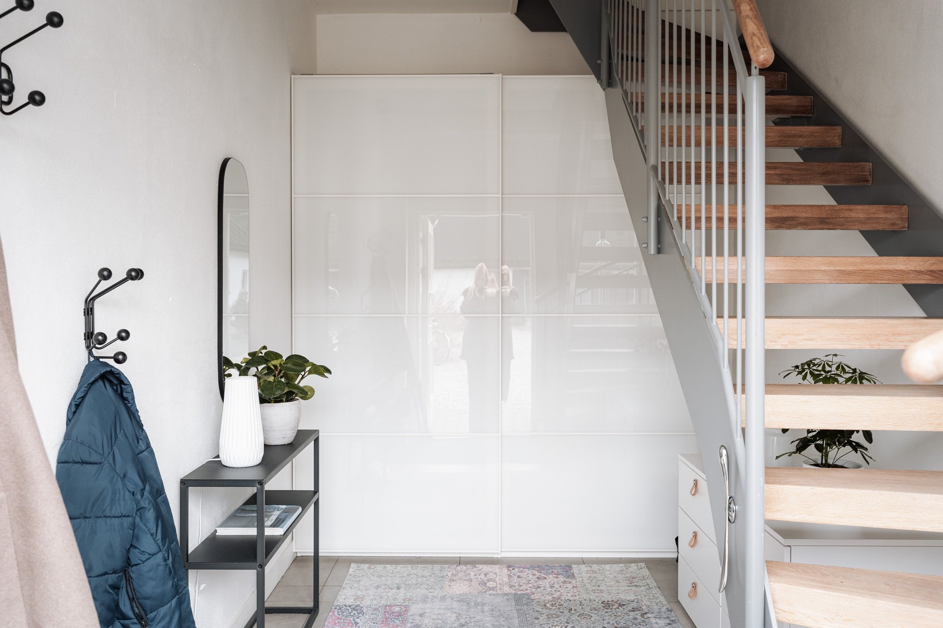Hall - När man kommer upp på plan 2 passerar man genom en mindre hall där man når en klädkammare. Industriparkett som löper vidare genom hela våningsplanet och vita väggar.