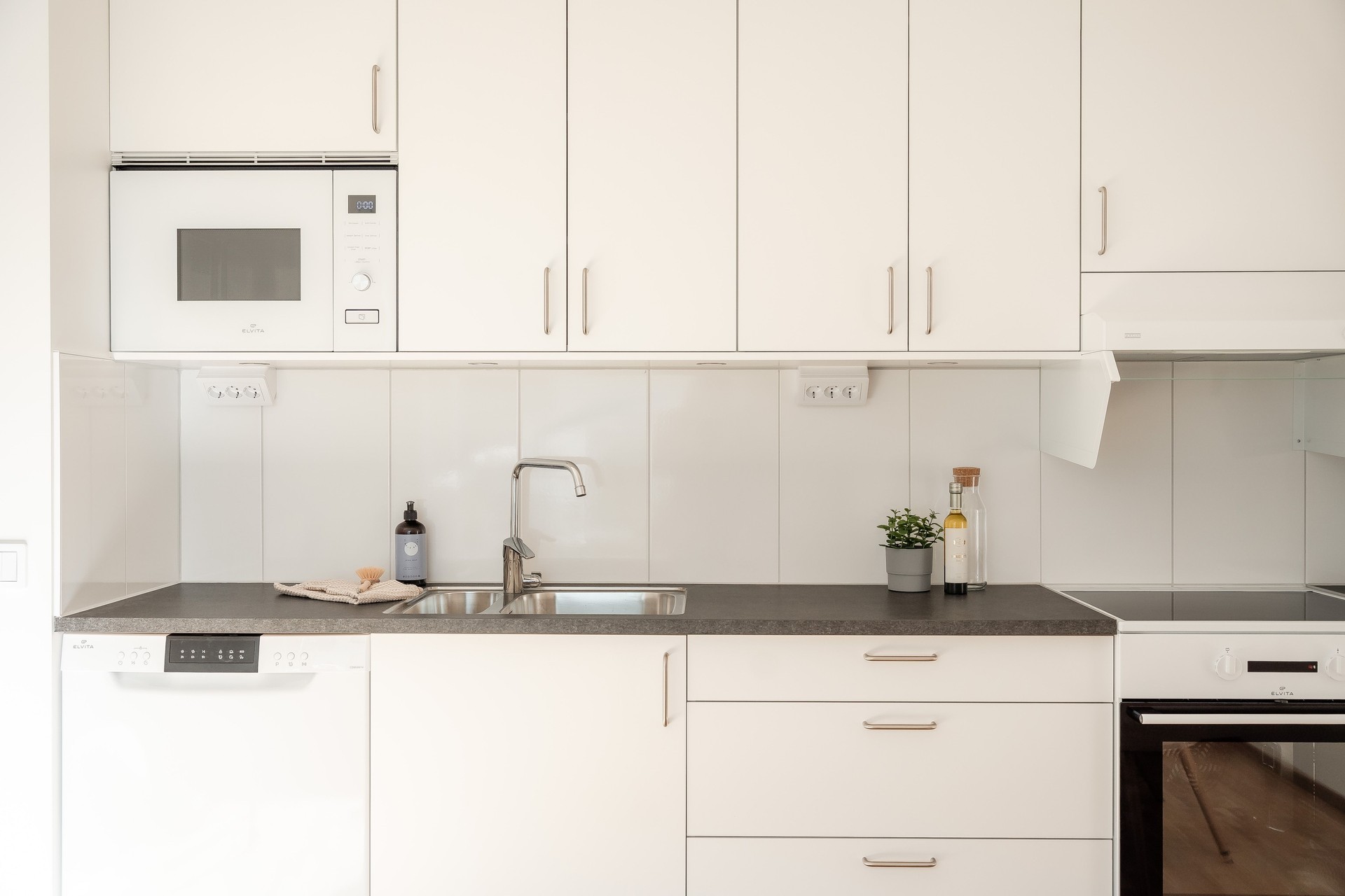 Vitvaror; Fabrikat, Elvita. Golvstående spis/ugn, kombinerad kyl/frys, spiskåpa integrerad i överskåp, diskmaskin, mikrovågsugn.